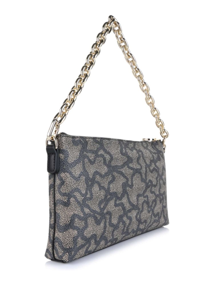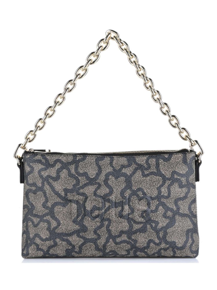Bolso clutch TOUS Kaos Icon de lona con estampado Kaos en color negro y gris con detalles en poliuretano. Cierre de cremallera. Asa de cadena extraíble de hombro o mano. Medidas (alto x ancho x fondo): 16 x 26 x 7 cm.