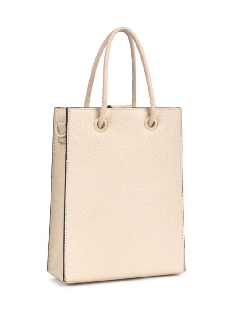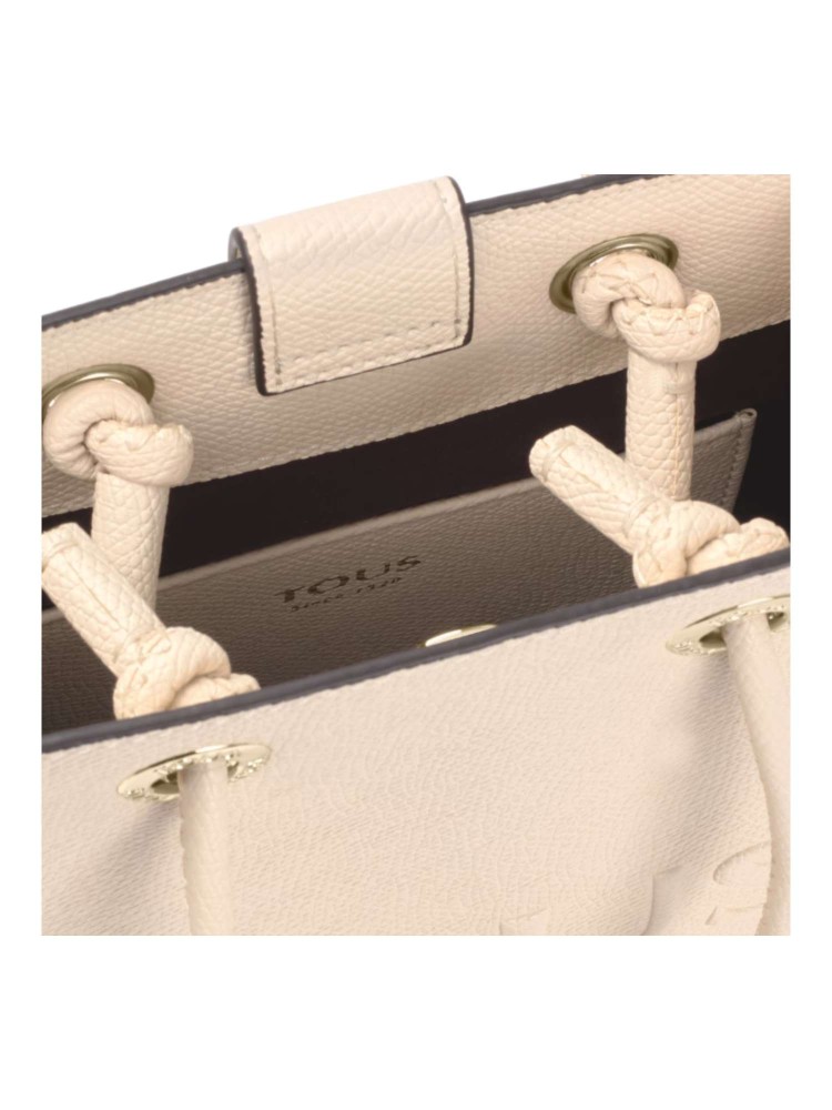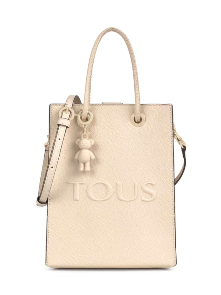 Mini bolso Pop TOUS La Rue New de poliuretano en color beige. Cierre con botón magnético. Asas fijas de mano y asa bandolera ajustable y extraíble. Incorpora un bonito detalle de oso colgante. Medidas (alto x ancho x fondo): 20,5 x 16 x 6 cm.