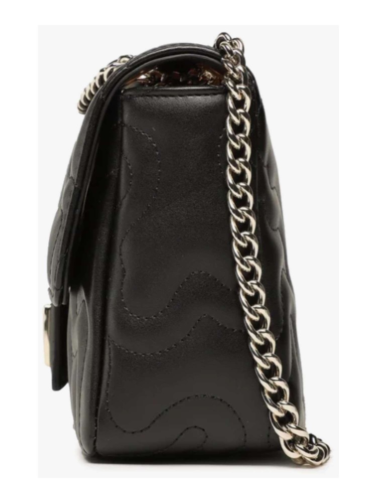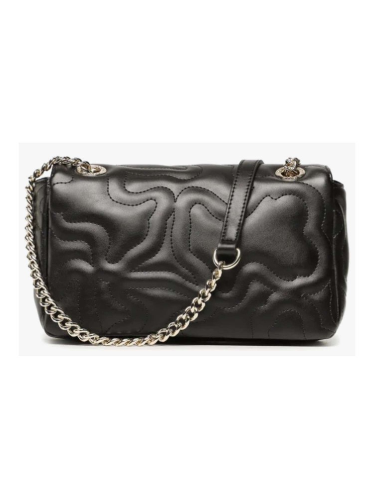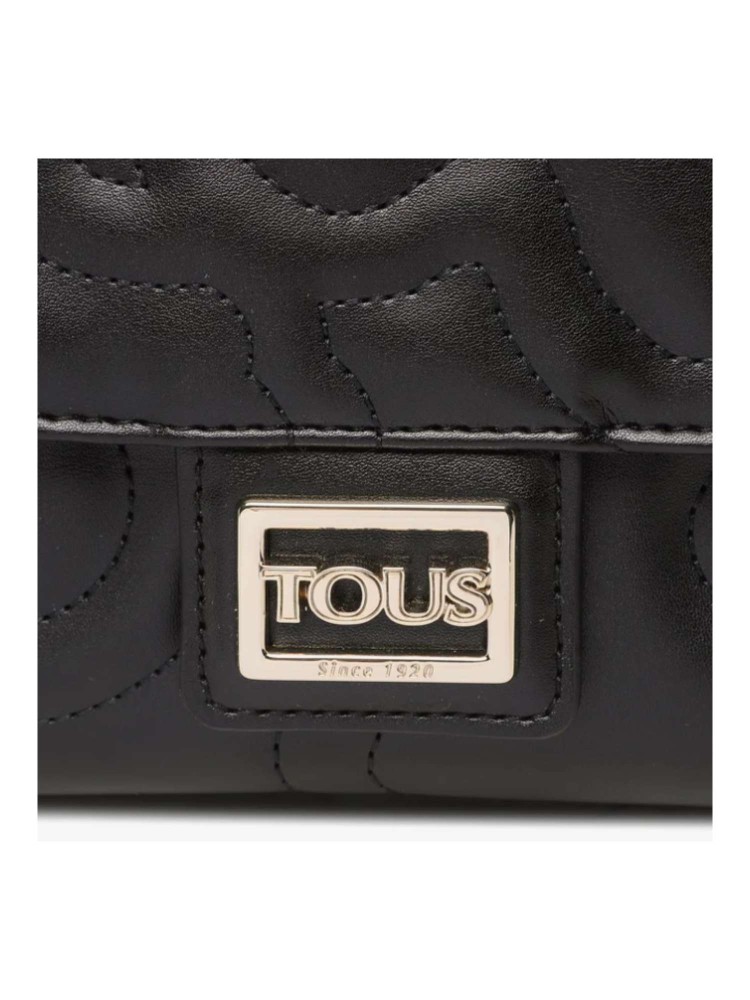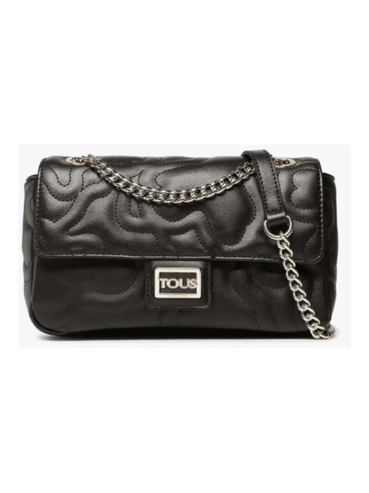 Bolso bandolera pequeña con solapa, de poliuretano acolchado en forma de osos con acabado efecto piel en color negro. Correa larga de bandolera tipo cadena ajustable. Cierre con botón magnético. Un bolsillo interior plano. Medidas: 8 x 25 x 15 cm.