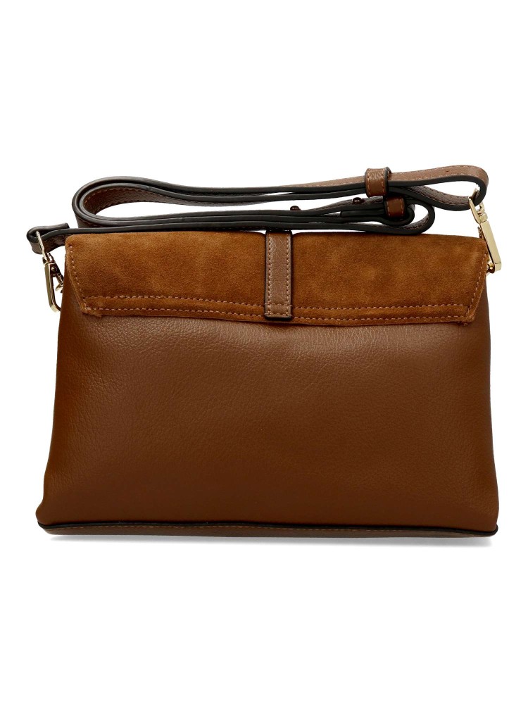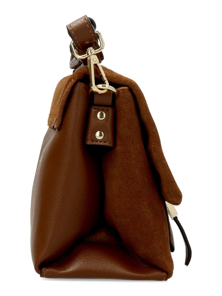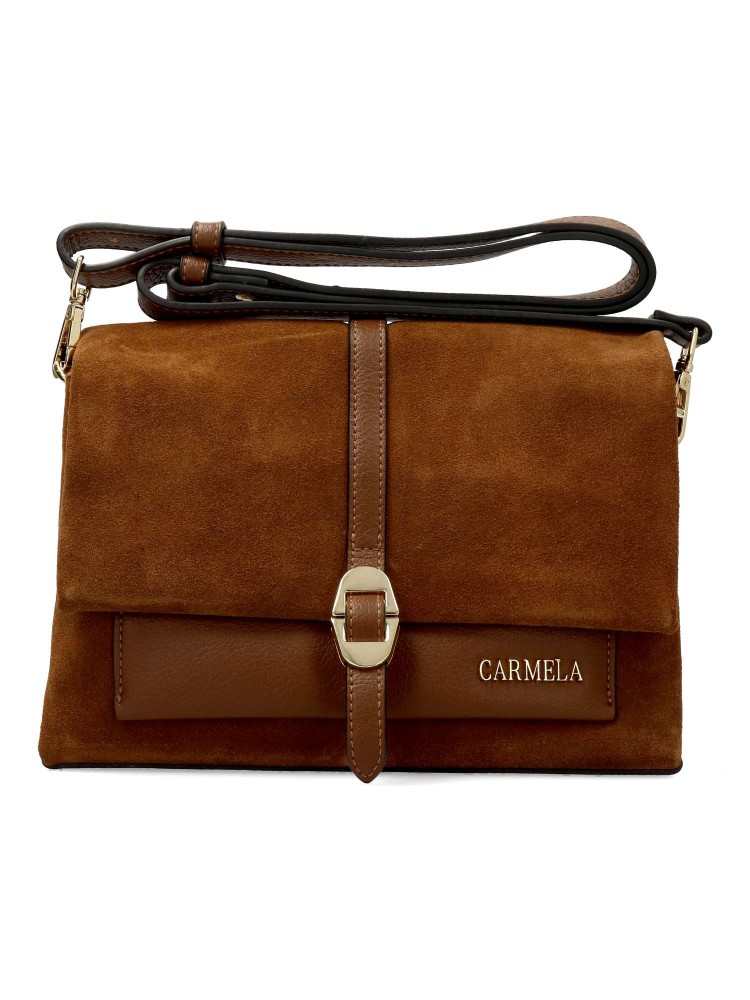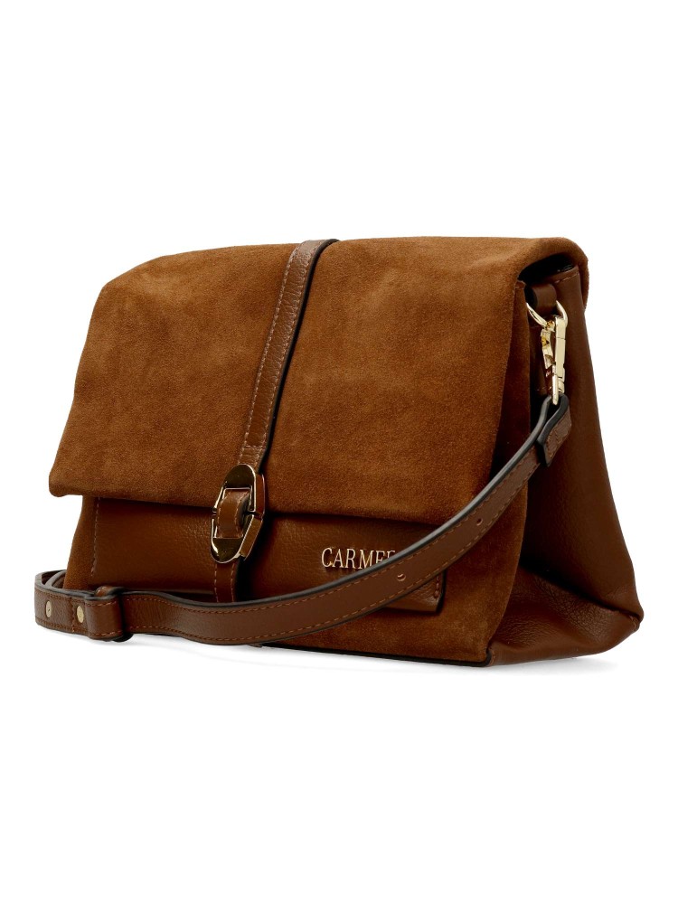 Bolso bandolera de Carmela en color camel. Confeccionado en piel serraje con solapa y detalle de hebilla decorativa. Detalles en sintético. Incluye correa ajustable y cierre magnético. Elegante y funcional. Medidas aproximadas: 18 x 25 x10 cm.