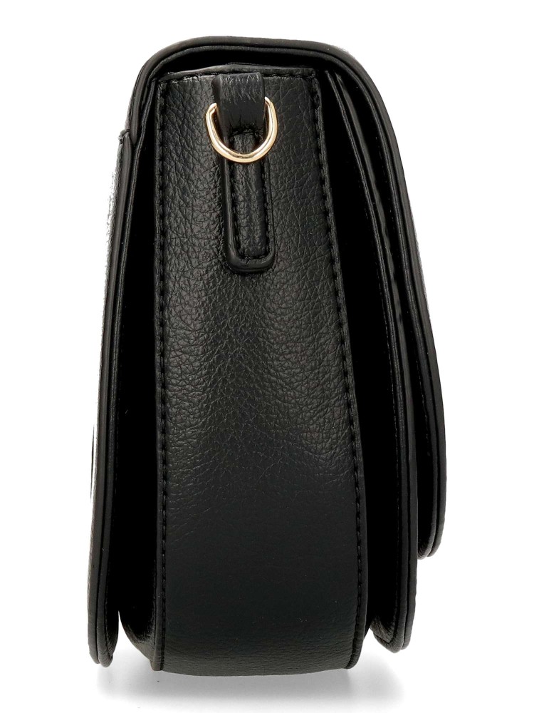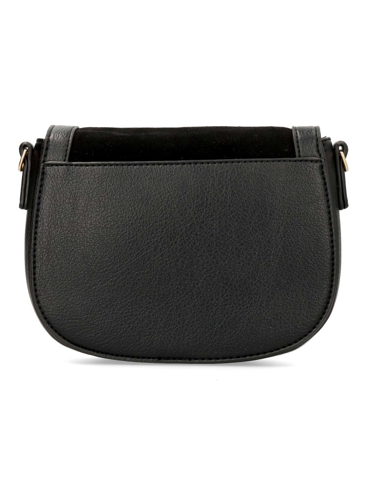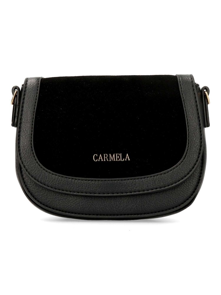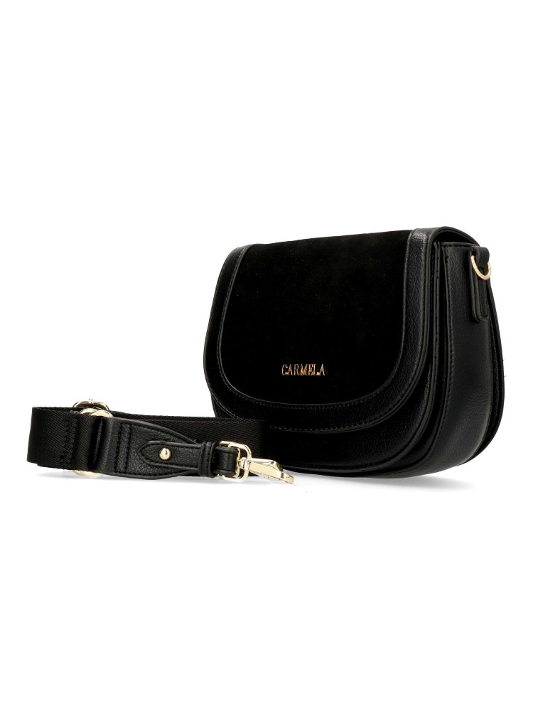 Bolso bandolera de Carmela en color negro. Confeccionado en piel serraje combinada con sintético. Solapa frontal con cierre magnético. Logo metálico. Asa regulable ancha. Dimensiones aproximadas: 26 x 30 x 8 cm