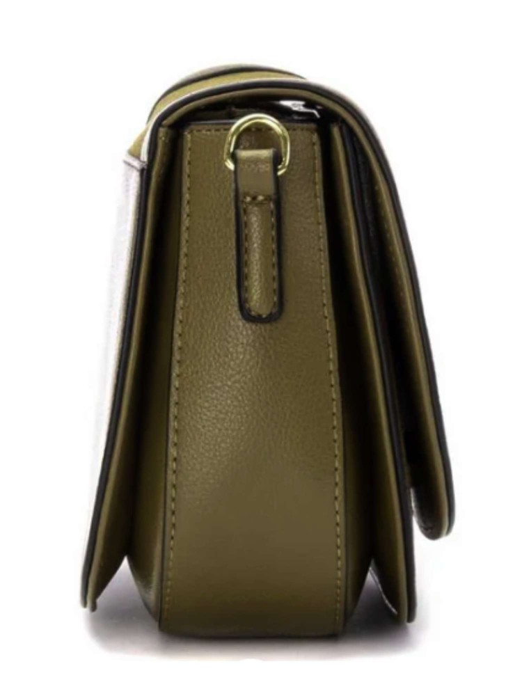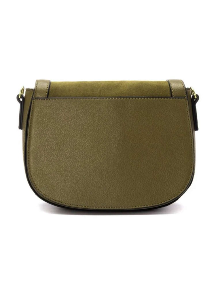 Bolso bandolera de Carmela en color kaki. Confeccionado en piel serraje combinada con sintético. Solapa frontal con cierre magnético. Logo metálico. Asa regulable ancha. Dimensiones aproximadas: 26 x 30 x 8 cm