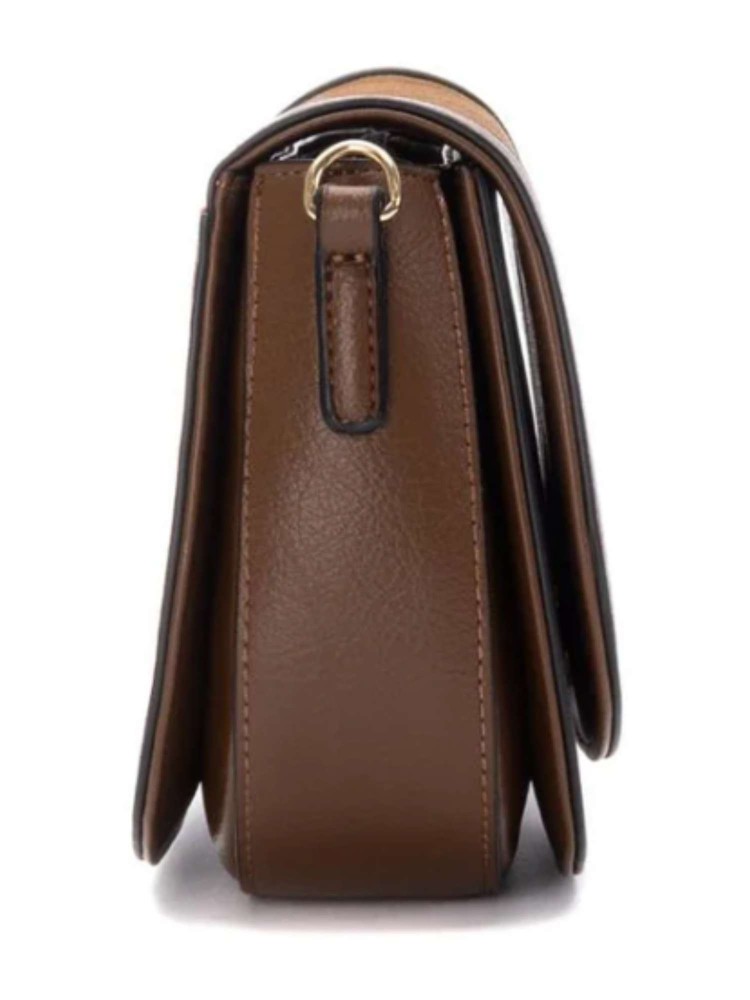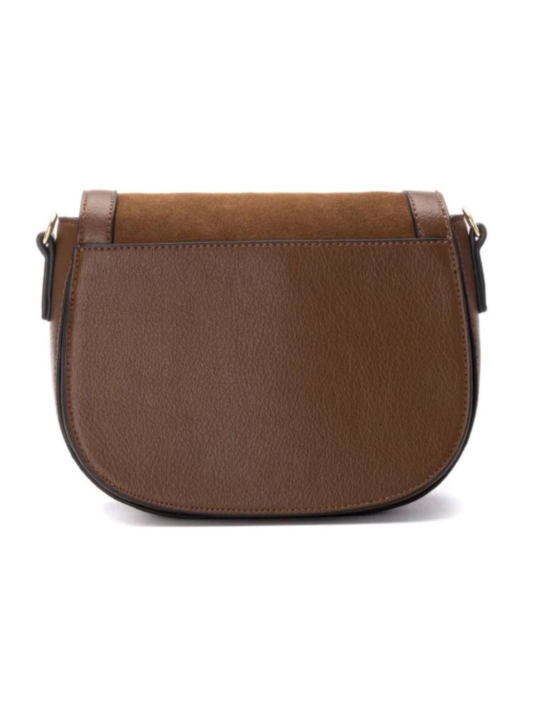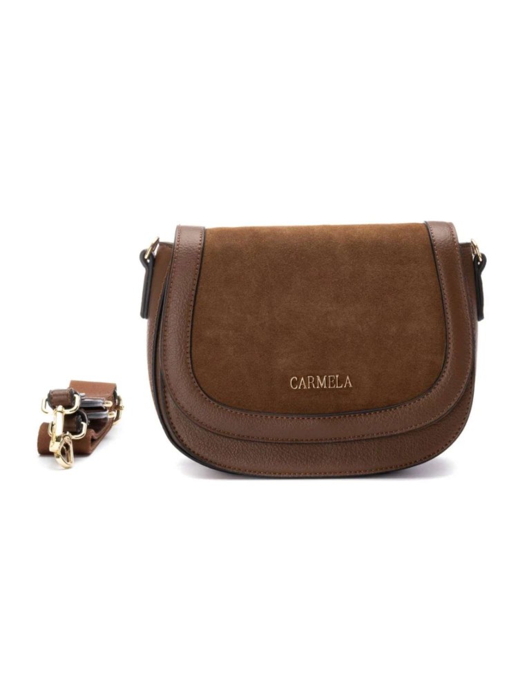 Bolso bandolera de Carmela en color camel. Confeccionado en piel serraje combinada con sintético. Solapa frontal con cierre magnético. Logo metálico. Asa regulable ancha. Dimensiones aproximadas: 26 x 30 x 8 cm