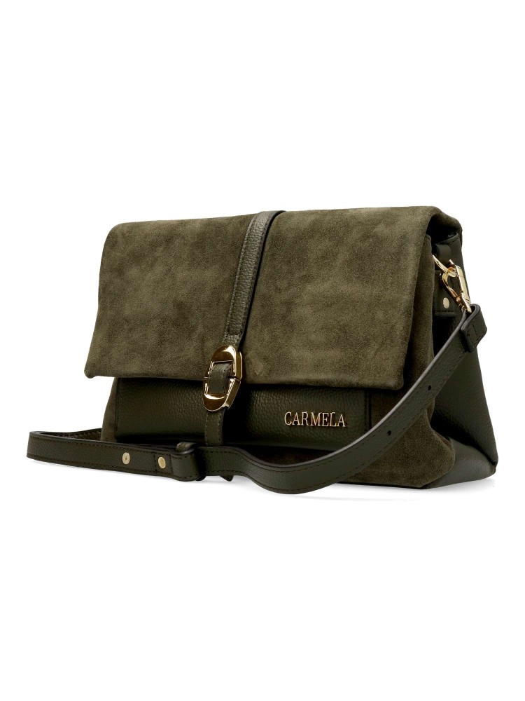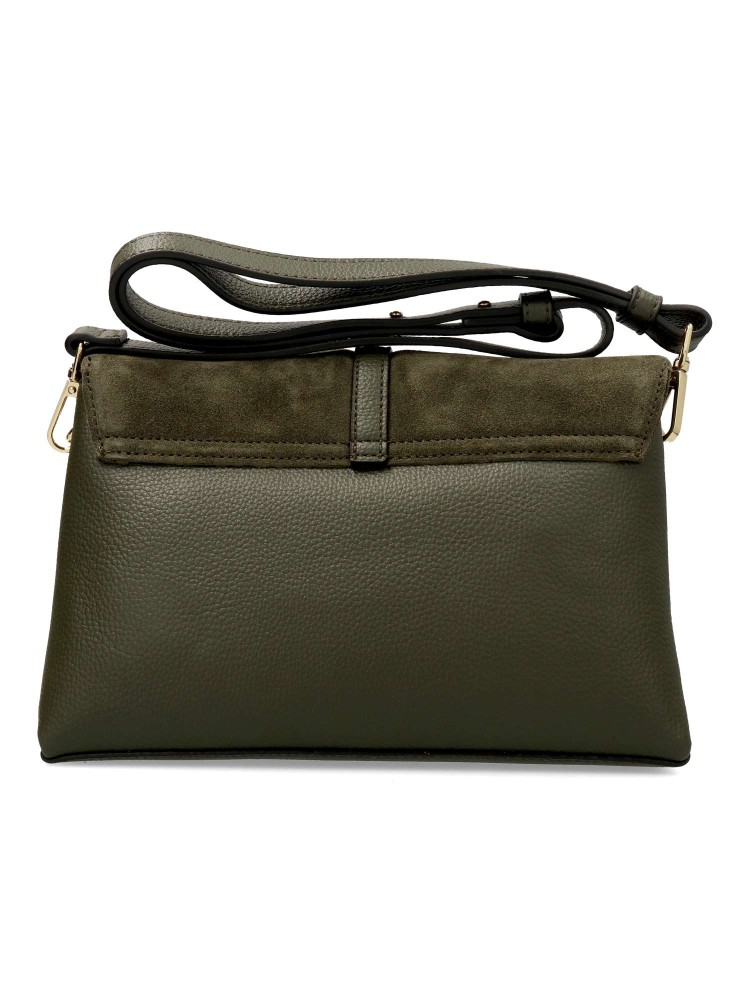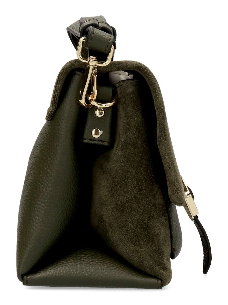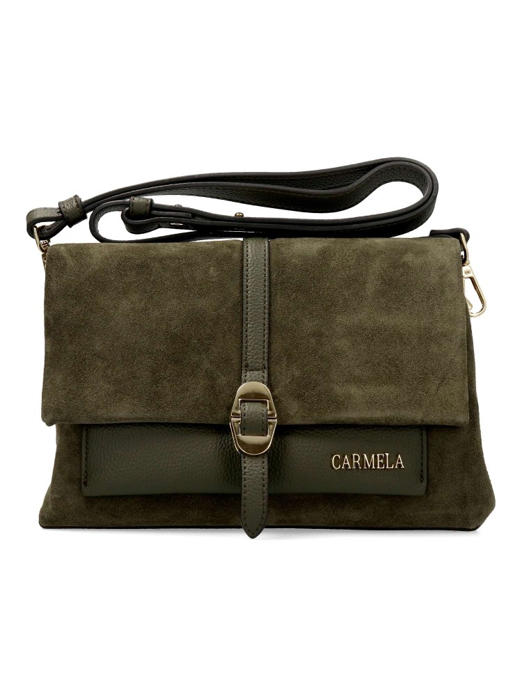 Bolso bandolera de Carmela en color kaki. Confeccionado en piel serraje con solapa y detalle de hebilla decorativa. Detalles en sintético. Incluye correa ajustable y cierre magnético. Elegante y funcional. Medidas aproximadas: 18 x 25 x10 cm.