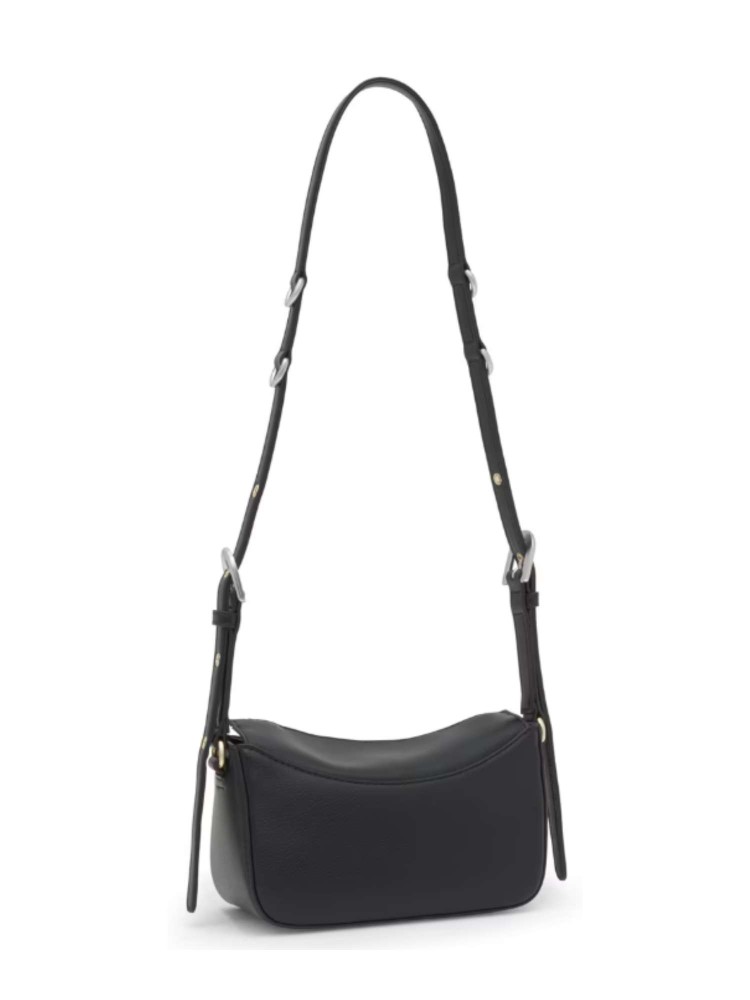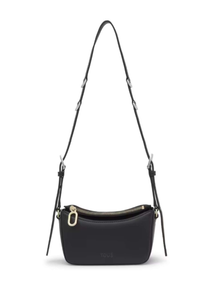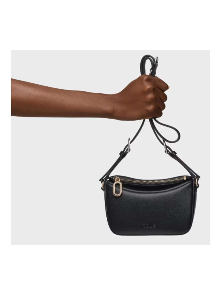 Bolso bandolera pequeño TOUS City de poliuretano en color negro. Cierre magnético. Asa bandolera ajustable y desmontable. Bolsillo exterior con cremallera. Medidas (alto x ancho x fondo): 12 x 20 x 9 cm.