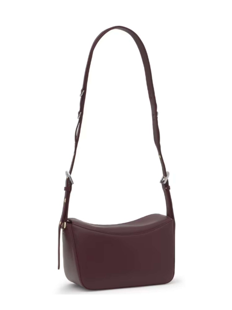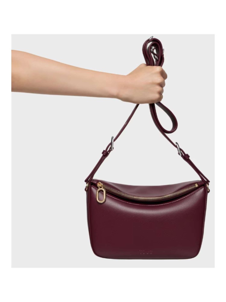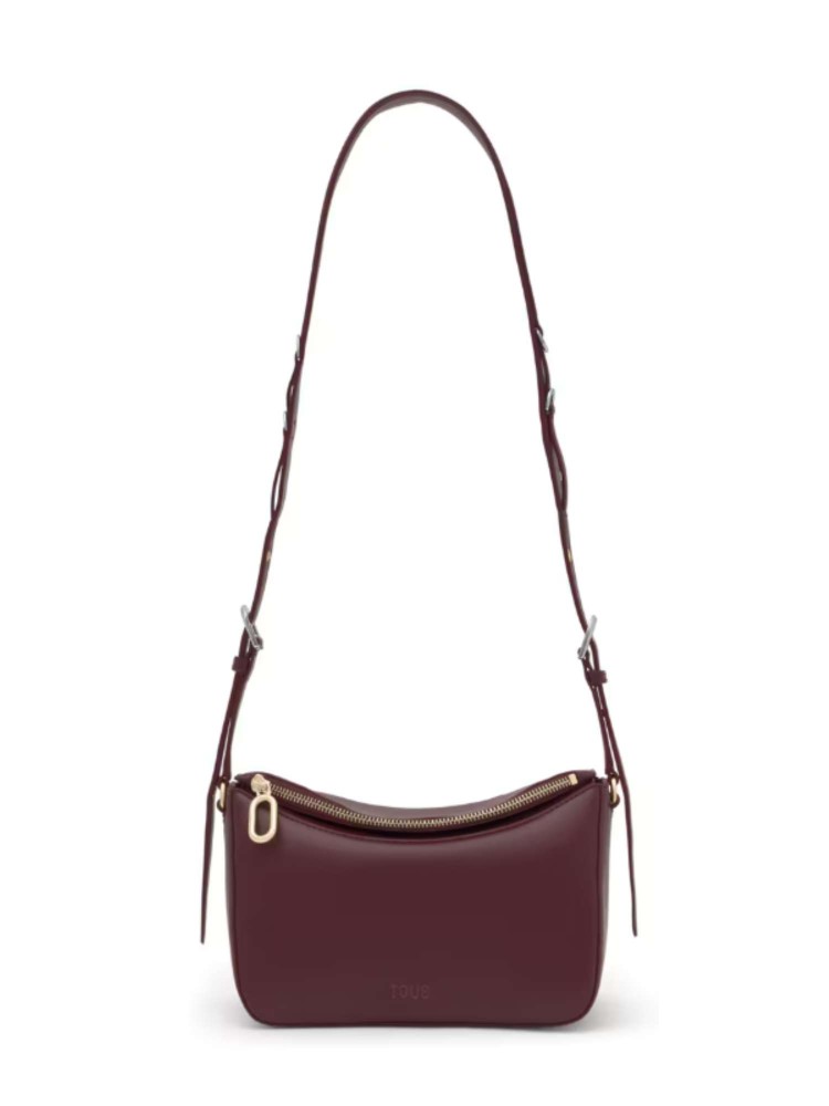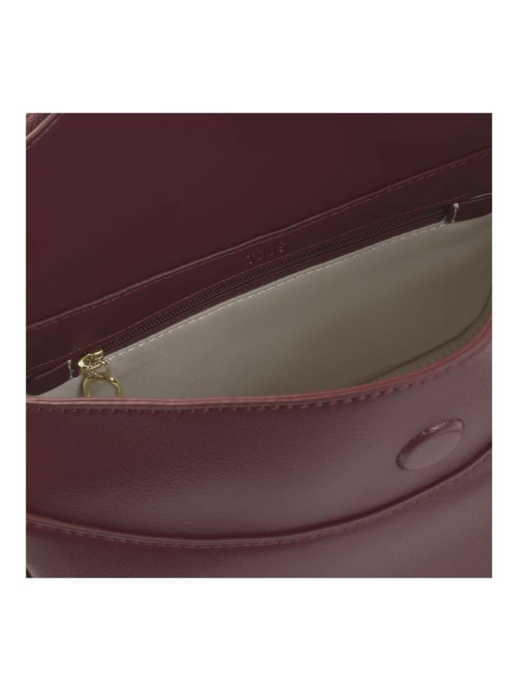 Bolso bandolera mediano TOUS City de poliuretano en color burdeos. Cierre de imán. Bolsillo exterior cremallera y bolsillo interior cremallera. Asa bandolera ajustable. Medidas (alto x ancho x fondo): 16 x 26 x 12 cm.