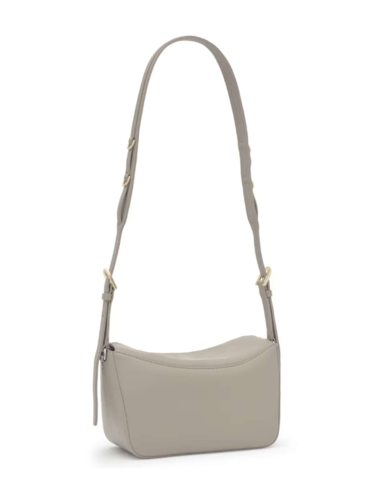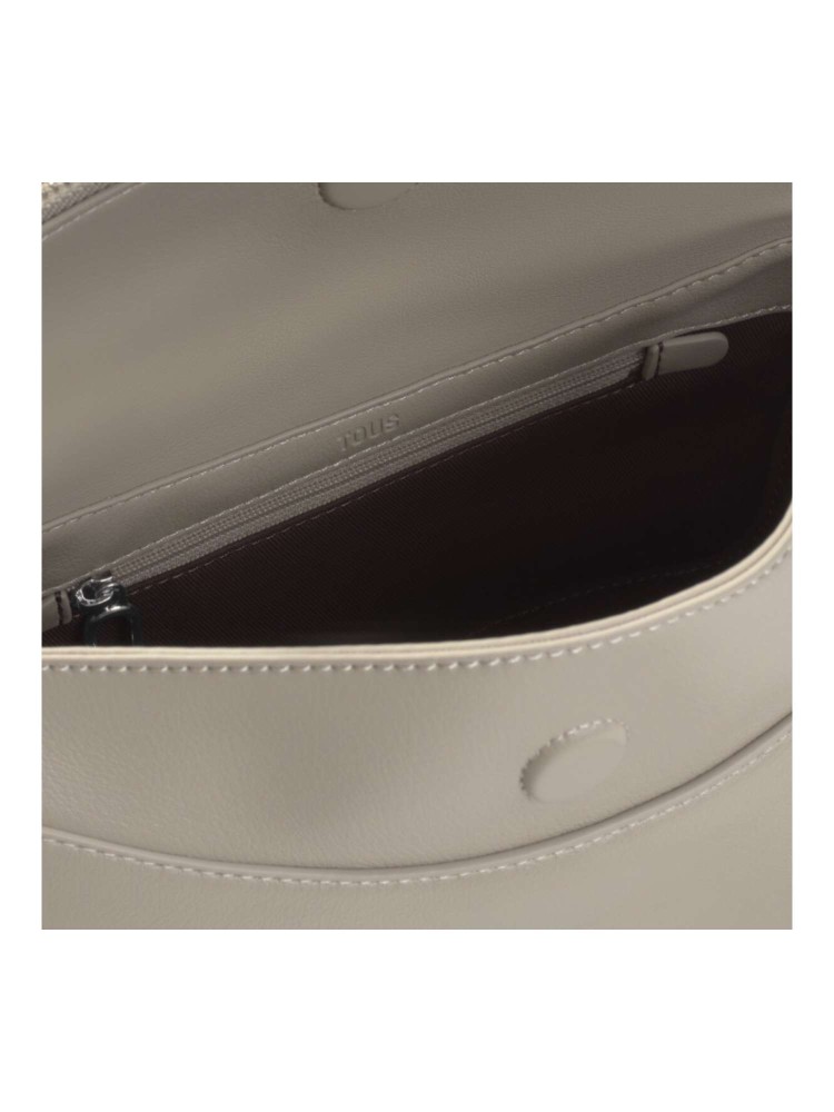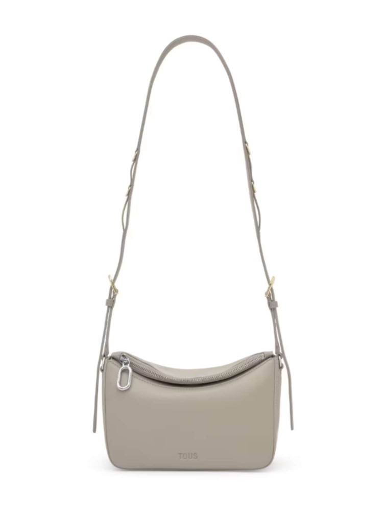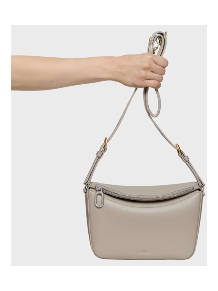 Bolso bandolera mediano TOUS City de poliuretano en color topo. Cierre de imán. Bolsillo exterior cremallera y bolsillo interior cremallera. Asa bandolera ajustable. Medidas (alto x ancho x fondo): 16 x 26 x 12 cm.