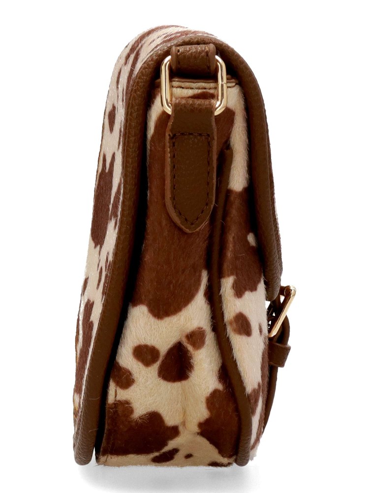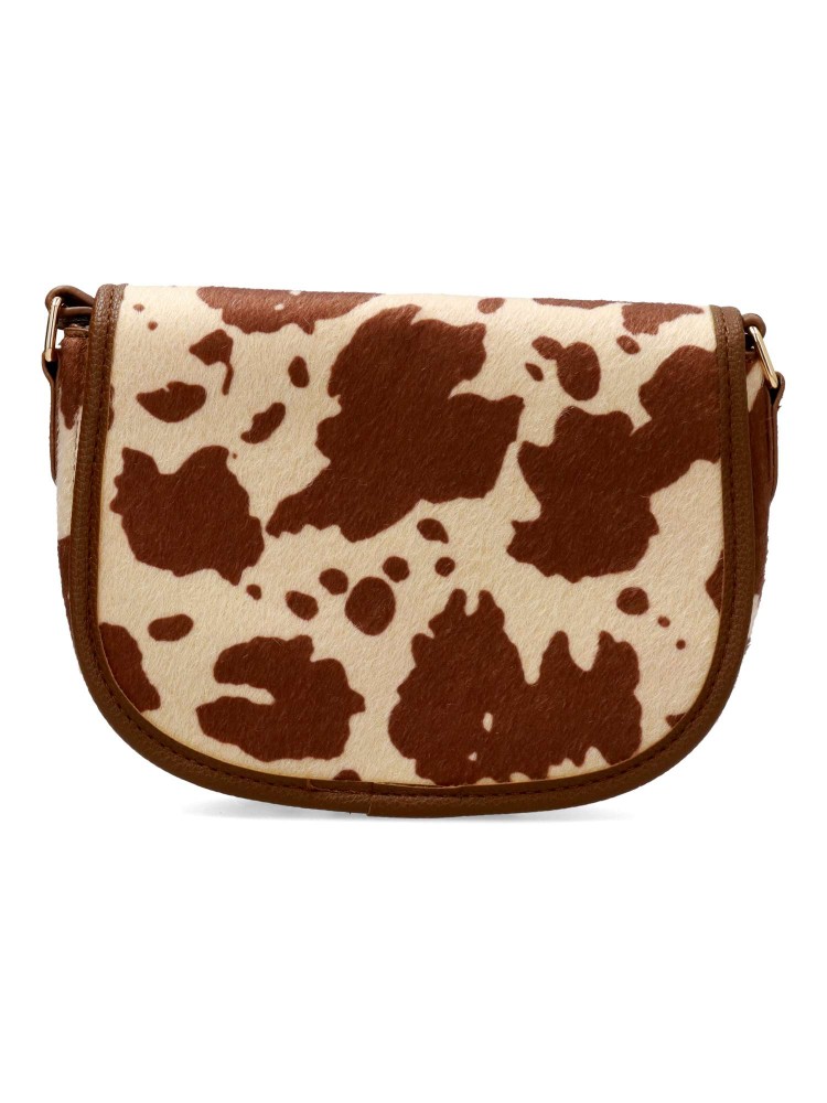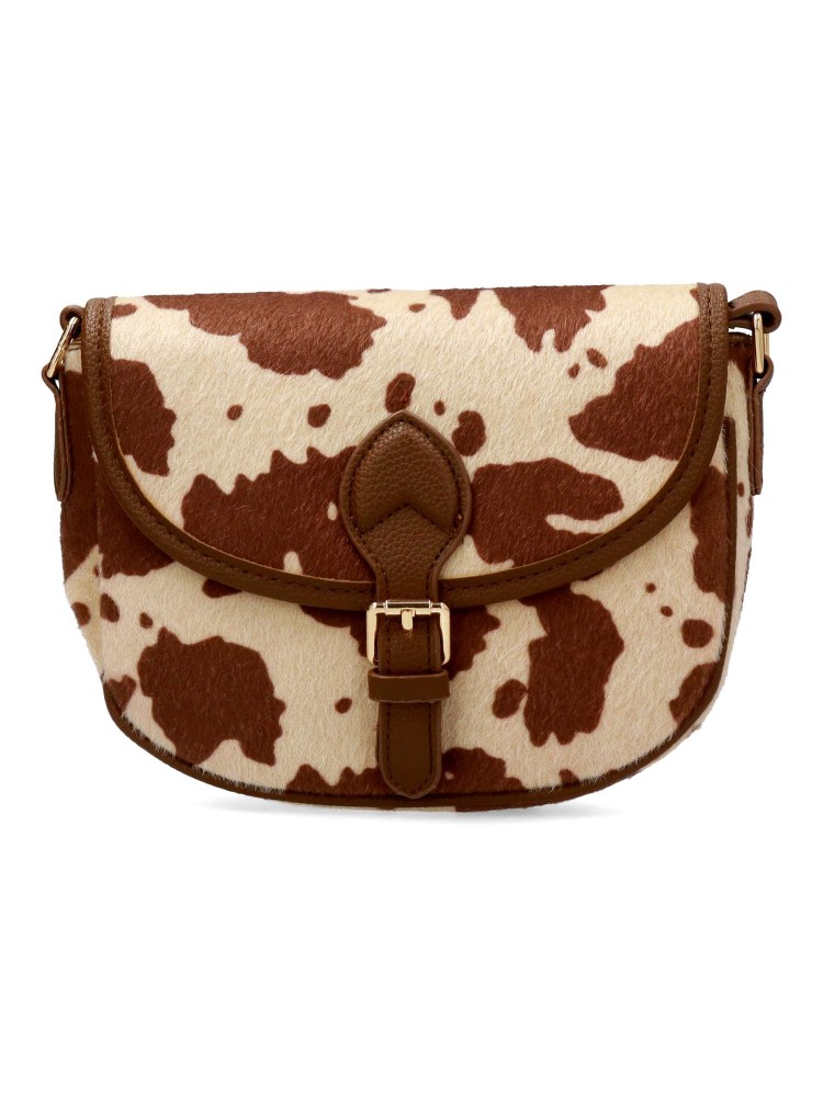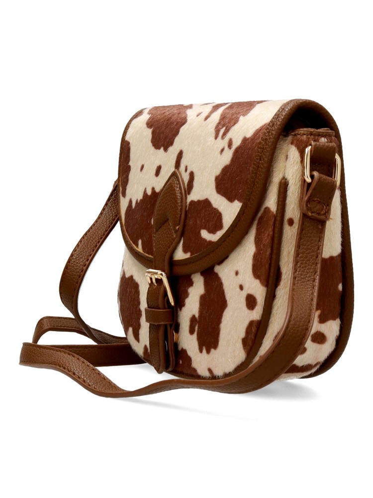Bolso bandolera para mujer. Modelo con solapa y cierre de hebilla y cremallera. Color marrón con estampado animal. Medidas aproximadas (alto x ancho x fondo): 16 x 22 x 6 cm.