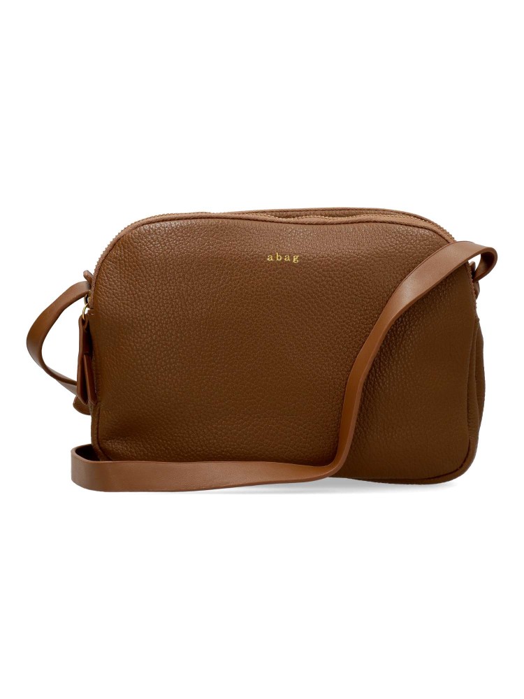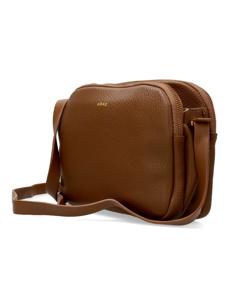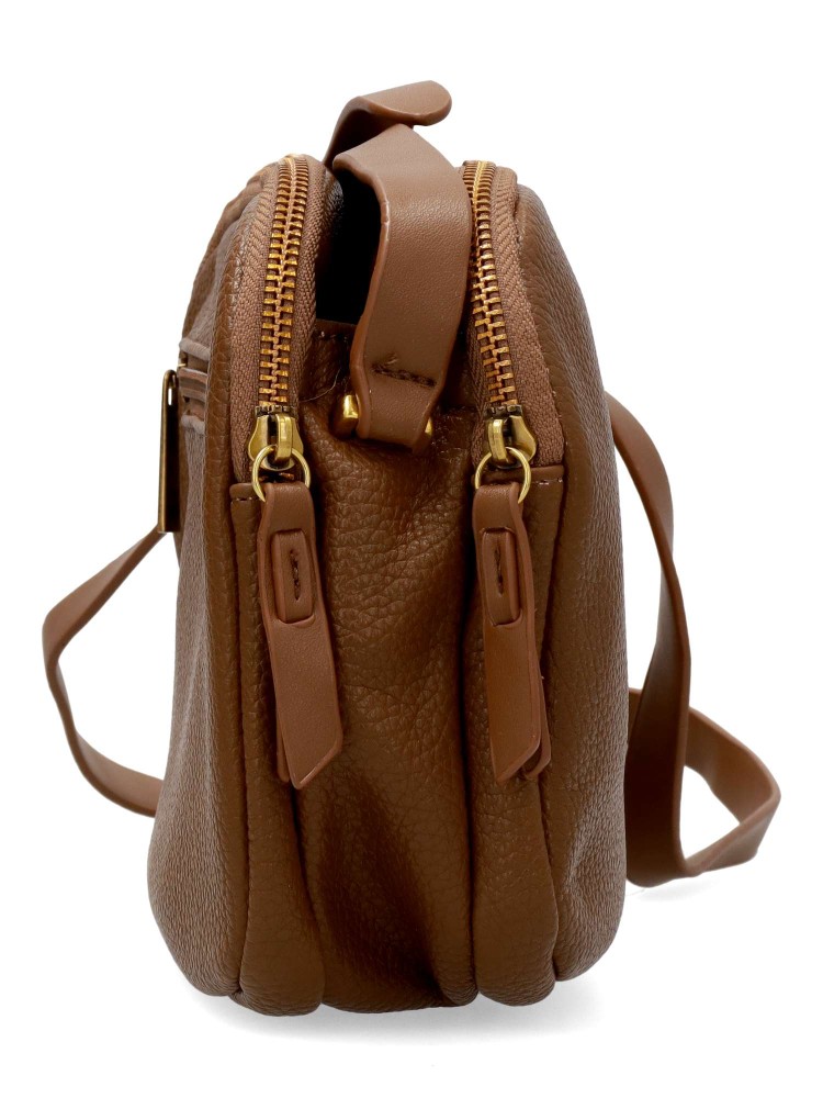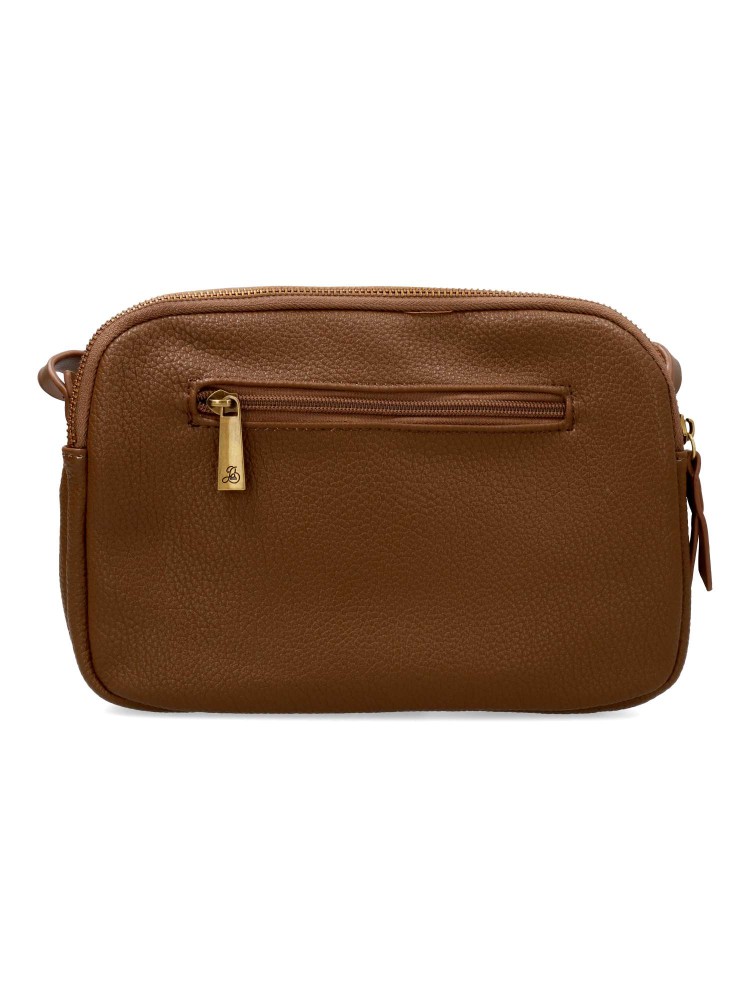 Bolso bandolera para mujer. Modelo con tres compartimentos, dos con cierre de cremallera y otro de clip. Color cafe. Medidas aproximadas (alto x ancho x fondo): 16 x 24 x 9 cm.