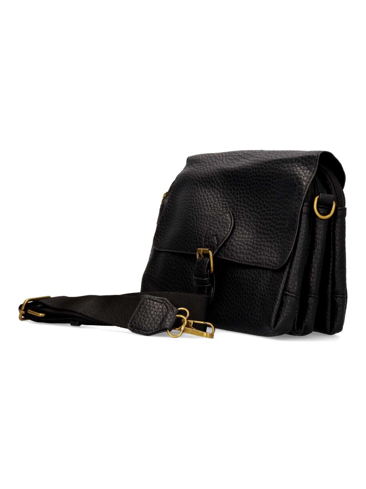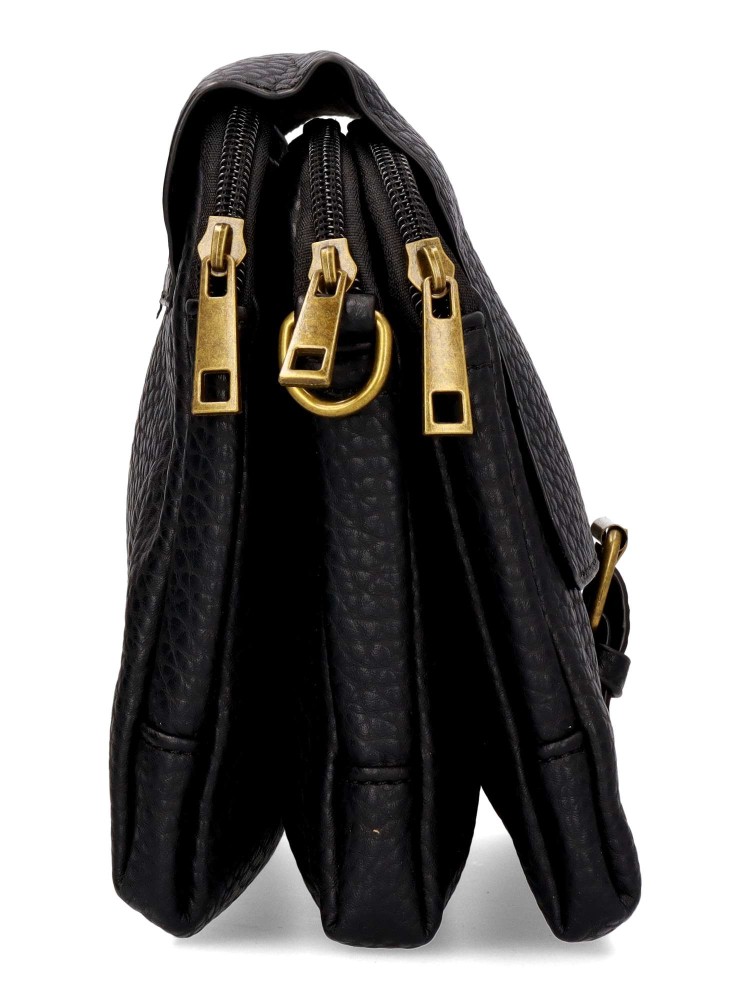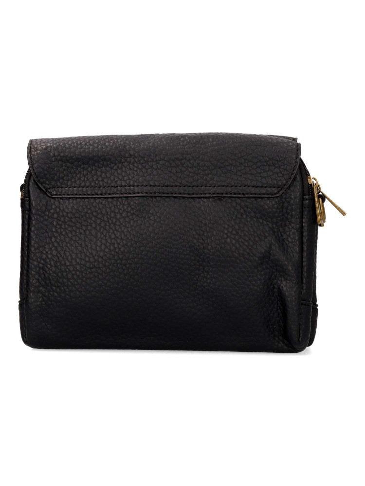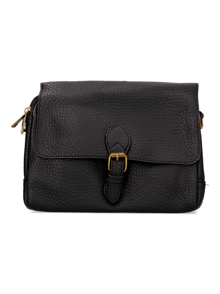 Bolso bandolera de mujer. Con solapa y cierre de cremallera. Color negro. Medidas aproximadas (alto x ancho x fondo): 18 x 23 x 10 cm.