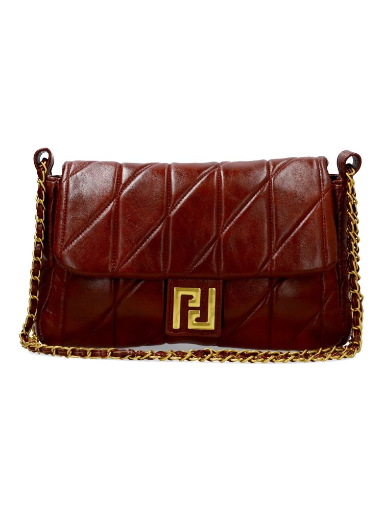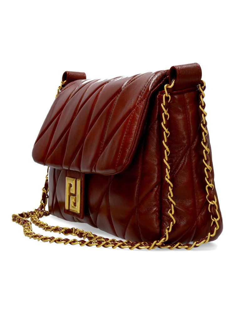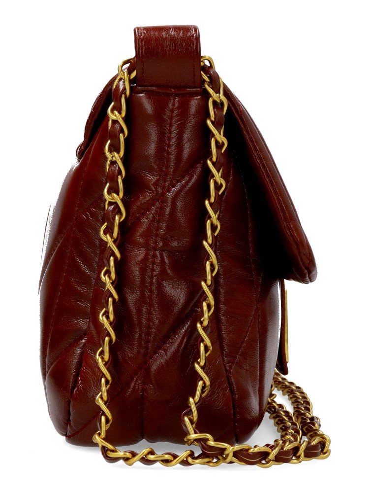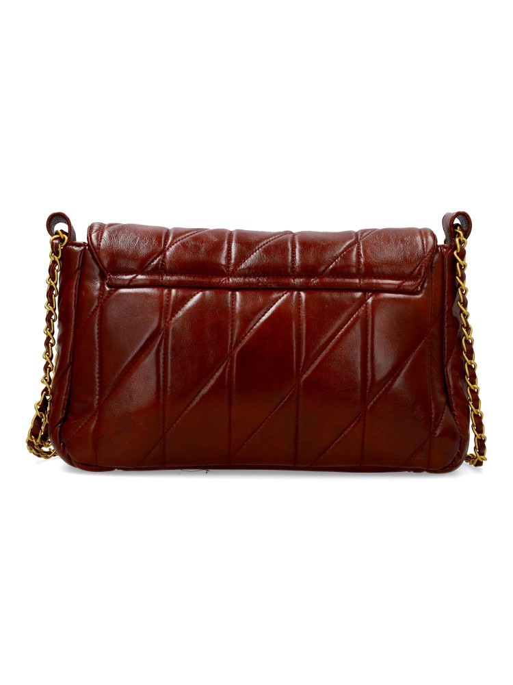 Bolso bandolera acolchada de mujer, con solapa y cierre de cremallera. Color burdeos. Medidas aproximadas (alto x ancho x fondo): 20 x 30 x 9 cm.