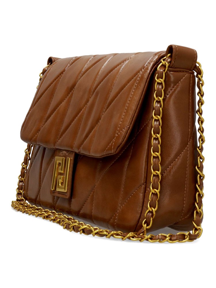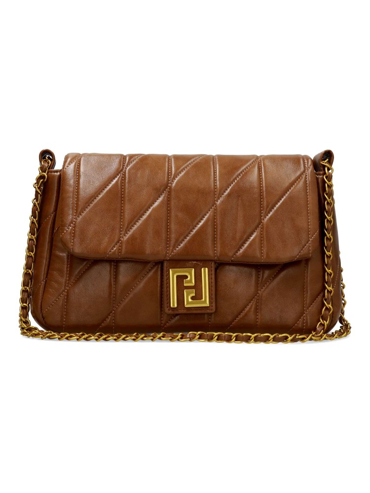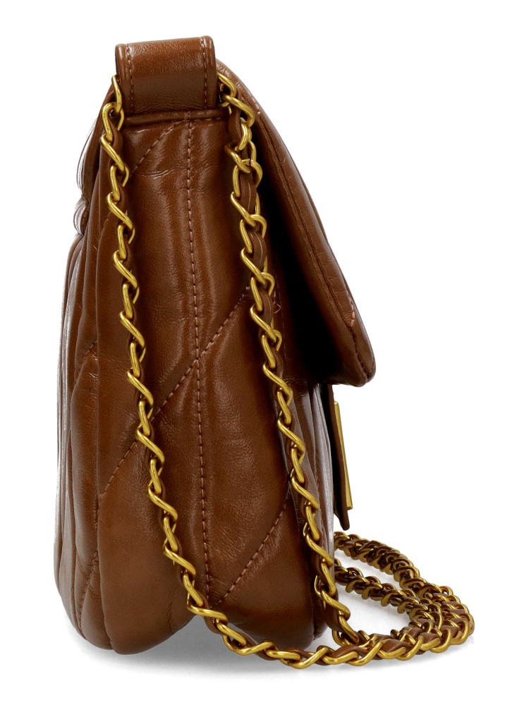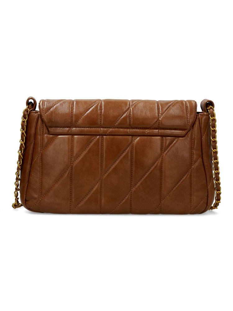 Bolso bandolera acolchada de mujer, con solapa y cierre de cremallera. Color taupe. Medidas aproximadas (alto x ancho x fondo): 20 x 30 x 9 cm.