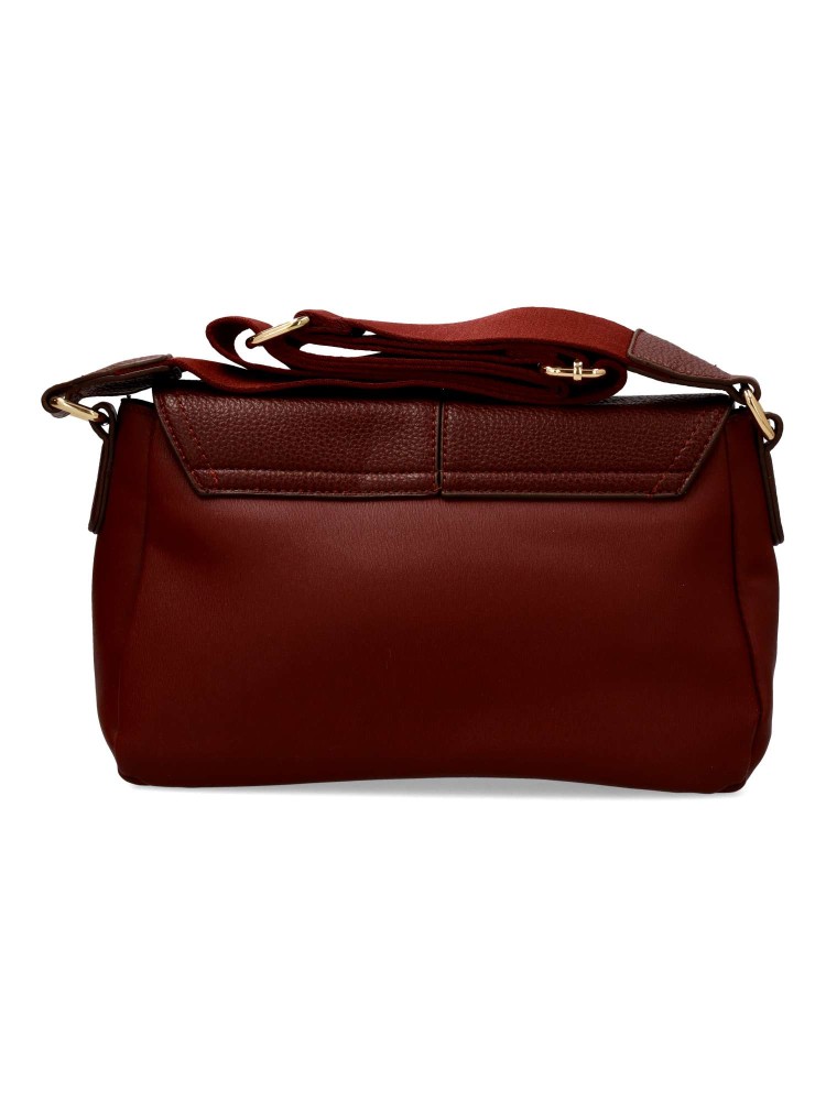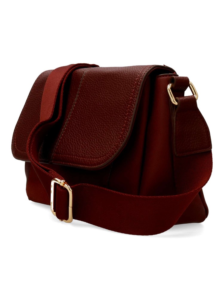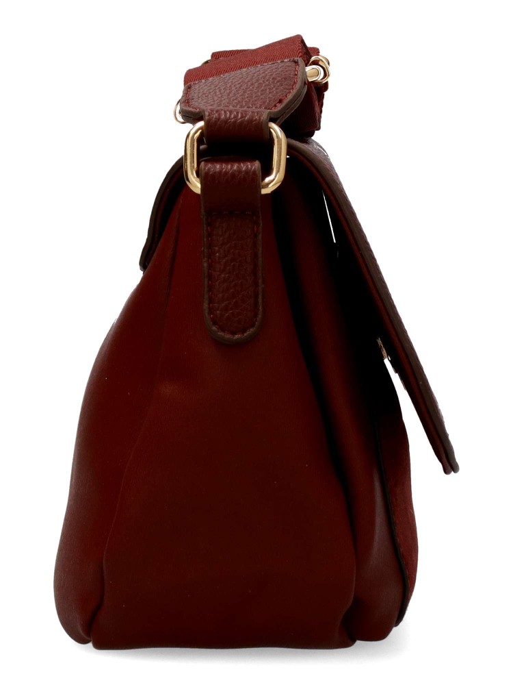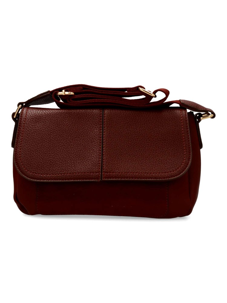 Bolso bandolera de mujer, con solapa y cierre de cremallera. Asa bandolera ajustable. Color burdeos. Medidas aproximadas (alto x ancho x fondo): 23 x 35 x 14 cm.