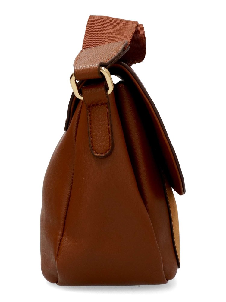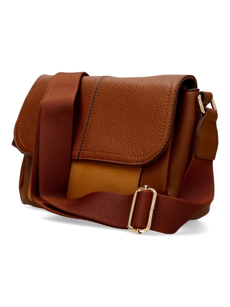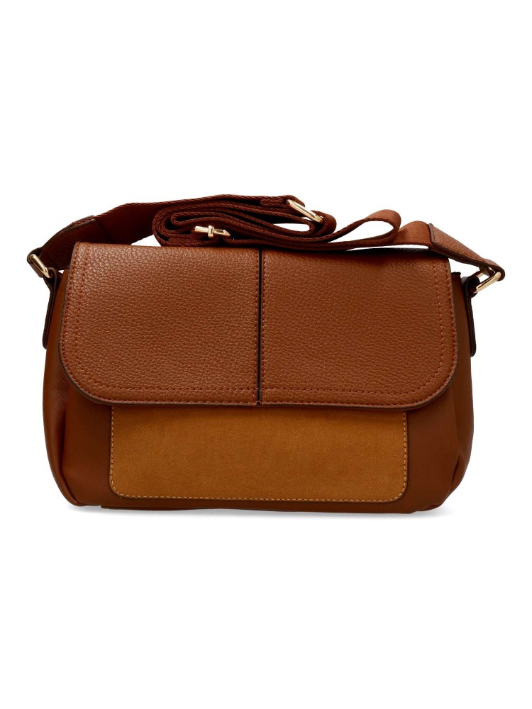 Bolso bandolera de mujer, con solapa y cierre de cremallera. Asa bandolera ajustable. Color café. Medidas aproximadas (alto x ancho x fondo): 23 x 35 x 14 cm.