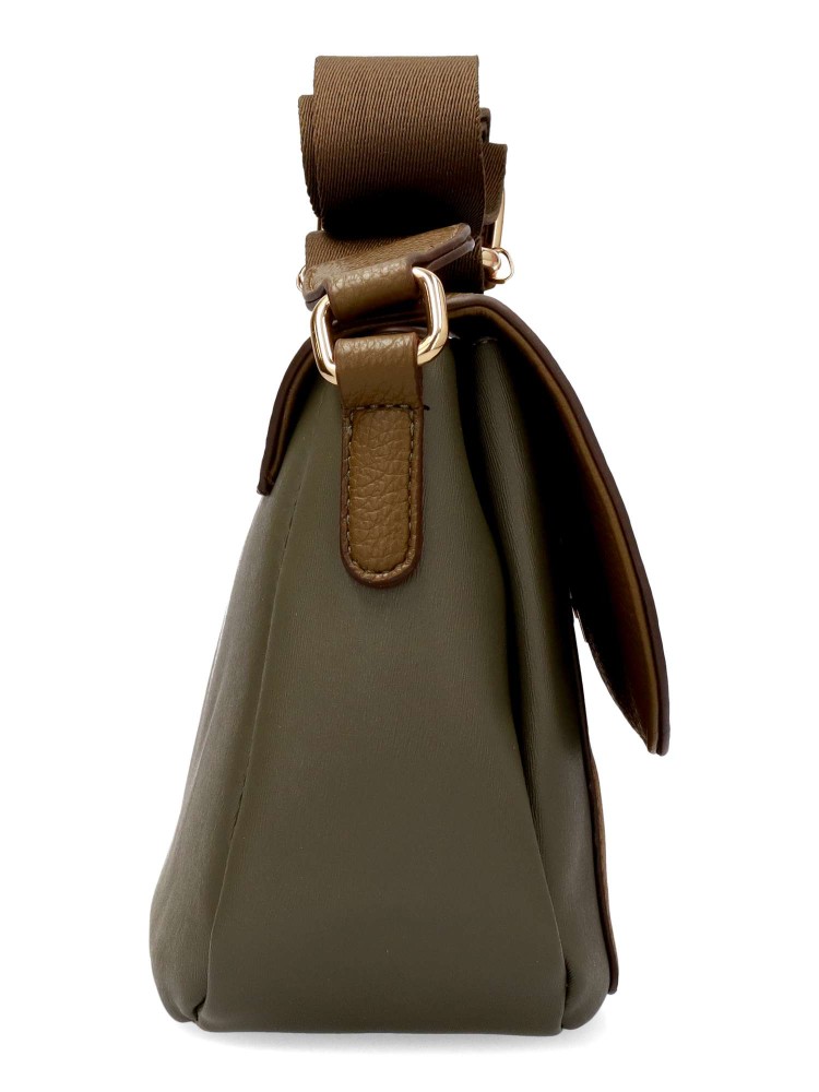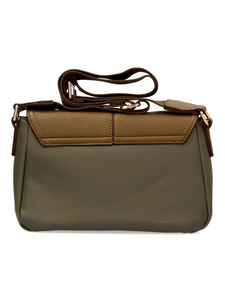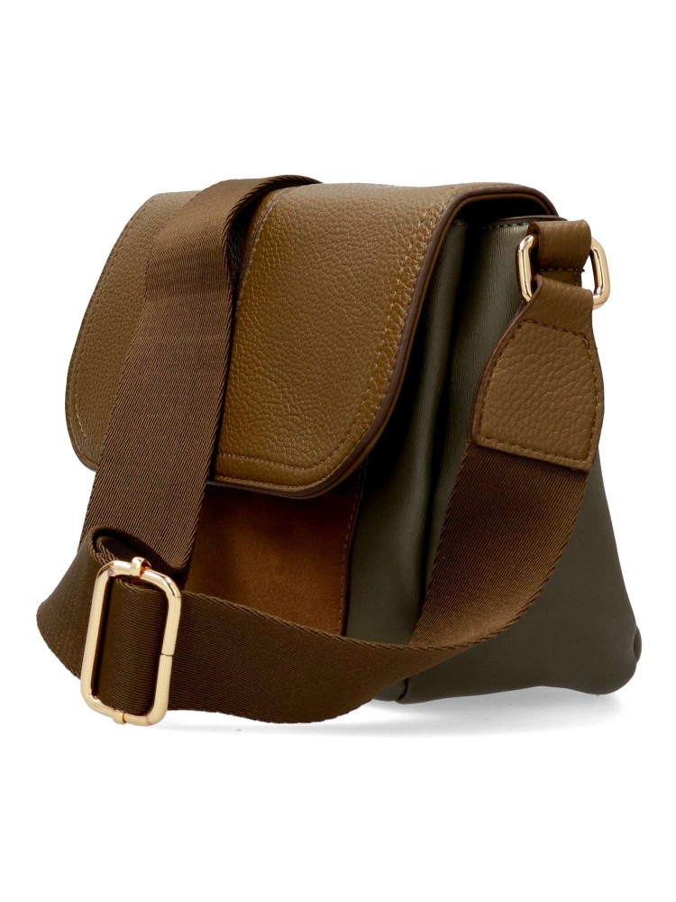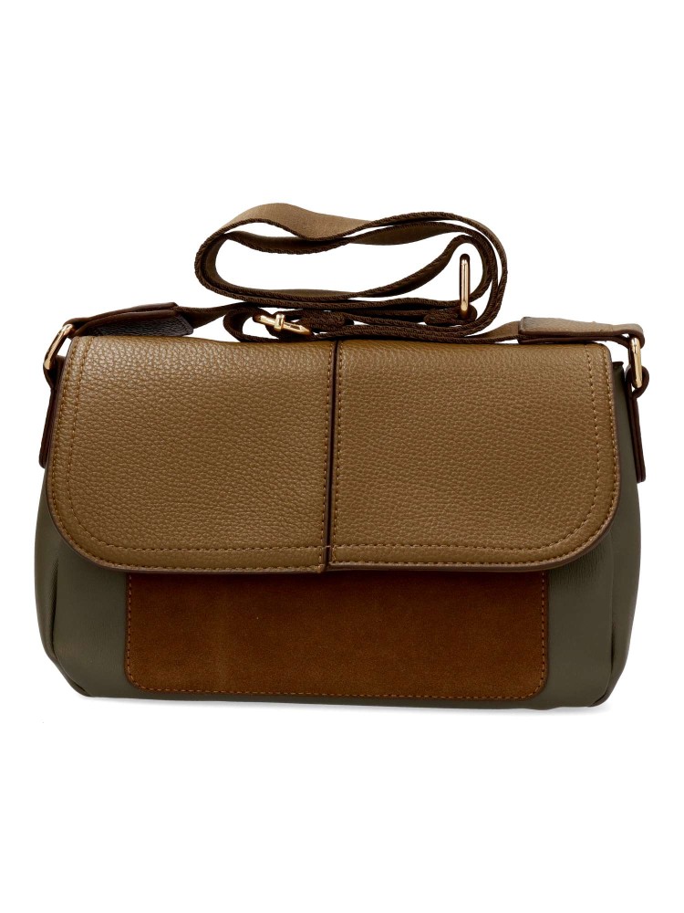 Bolso bandolera de mujer, con solapa y cierre de cremallera. Asa bandolera ajustable. Color kaki. Medidas aproximadas (alto x ancho x fondo): 23 x 35 x 14 cm.