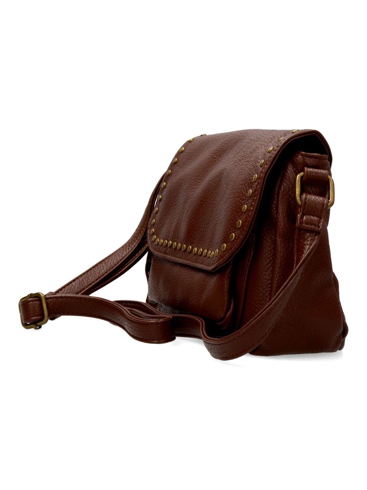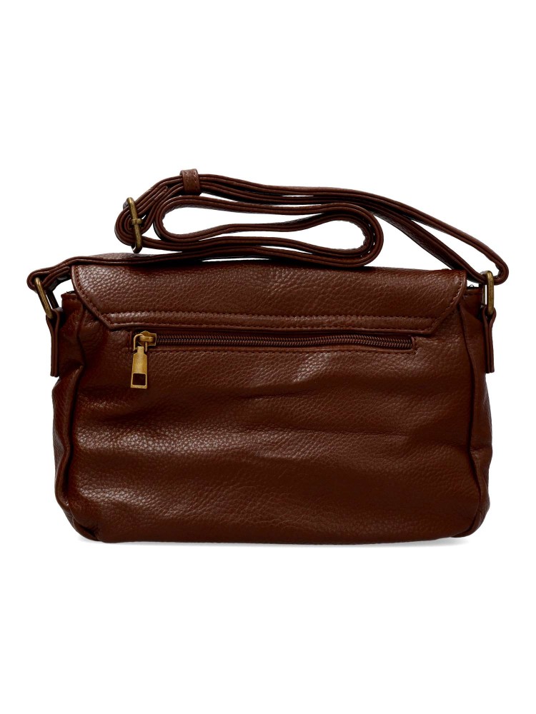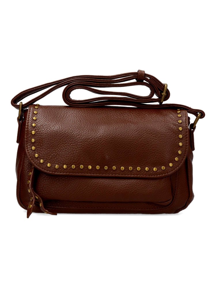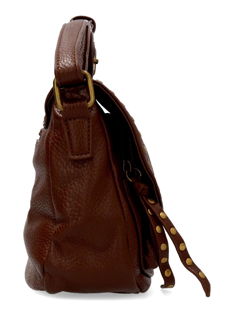 Bolso bandolera de mujer, con solapa y cierre de cremallera. Tachuelas decorativas. Color negro. Medidas aproximadas (alto x ancho x fondo): 18 x 26 x 8 cm.