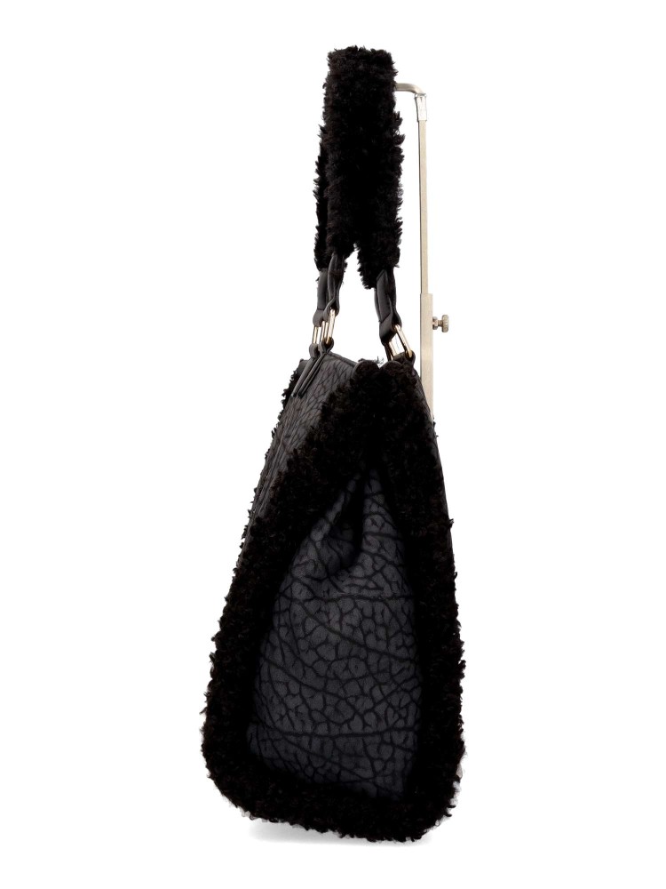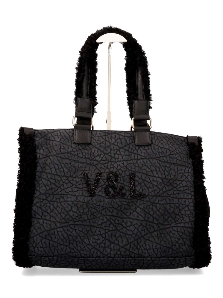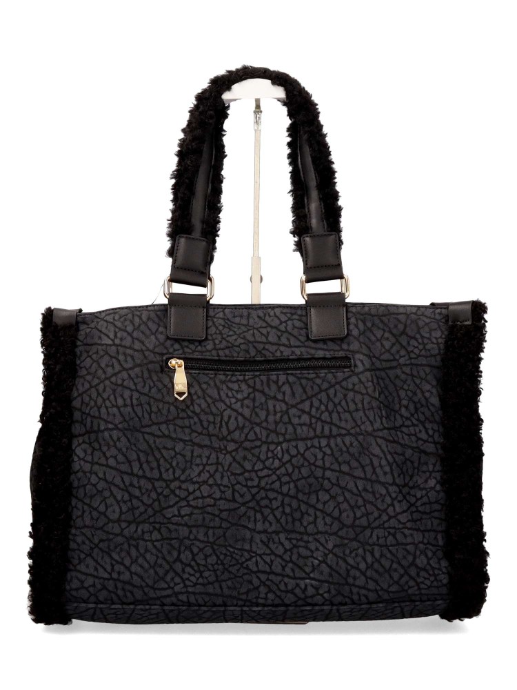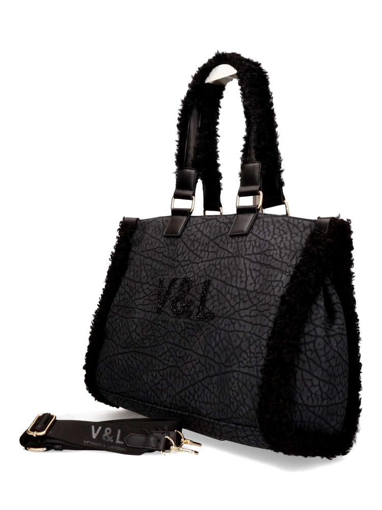 Bolso shopper bandolera para mujer Victorio&Lucchino Aura negro, en piel sintética blandita con detalles de borreguillo. Con asas cortas y bandolera larga, elegante y versátil. TAMAÑO: 30 x 43 x17 cm.