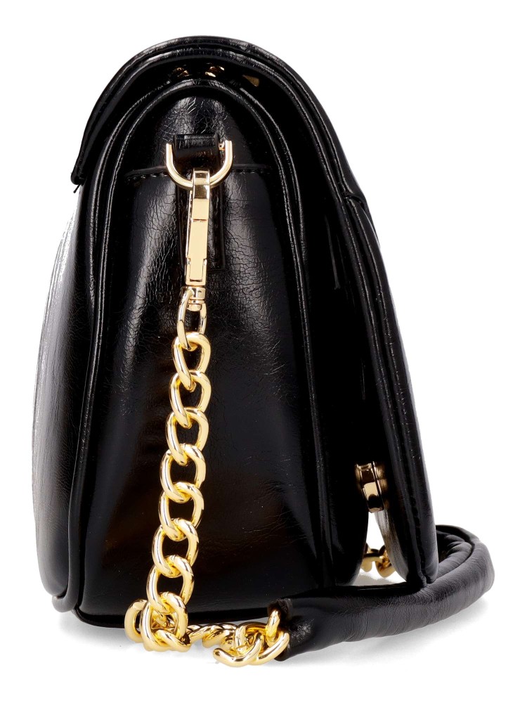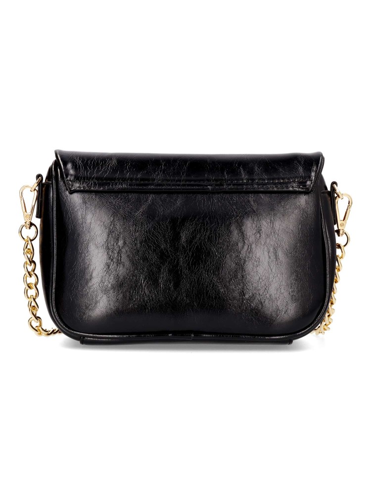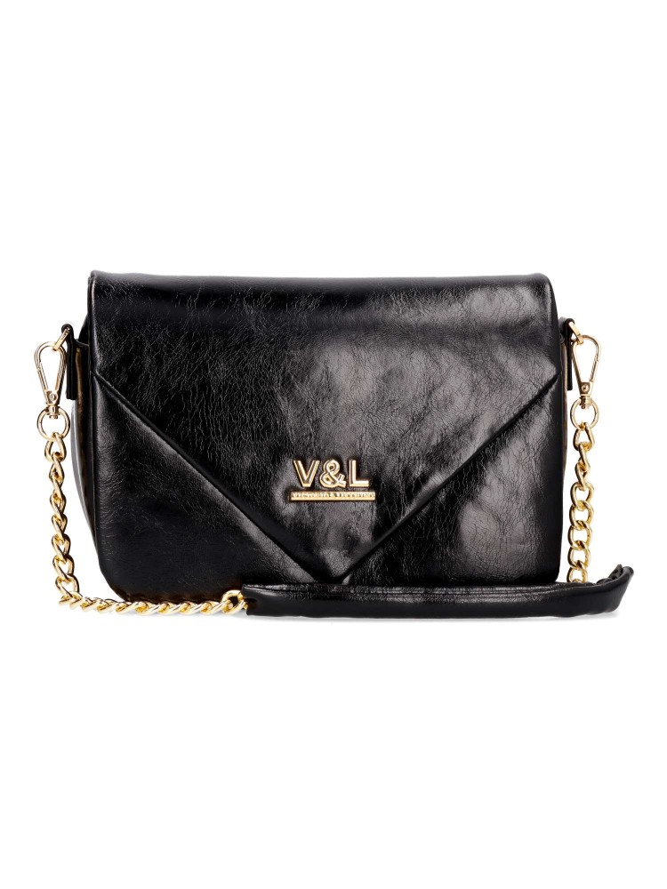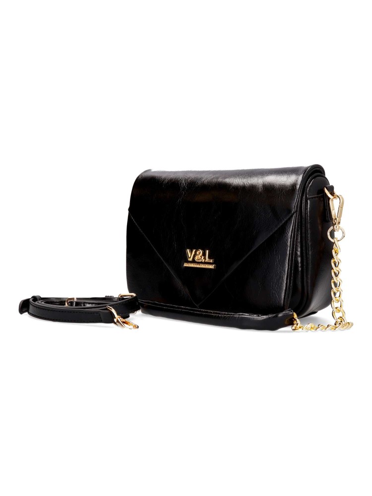 Bandolera de mujer Victorio & Lucchino Aria en color negro, con solapa, apartados interiores y dos bandoleras: corta de cadena y larga de piel sintética. Dimensiones: 22 × 6 × 13 cm (medidas aproximadas).