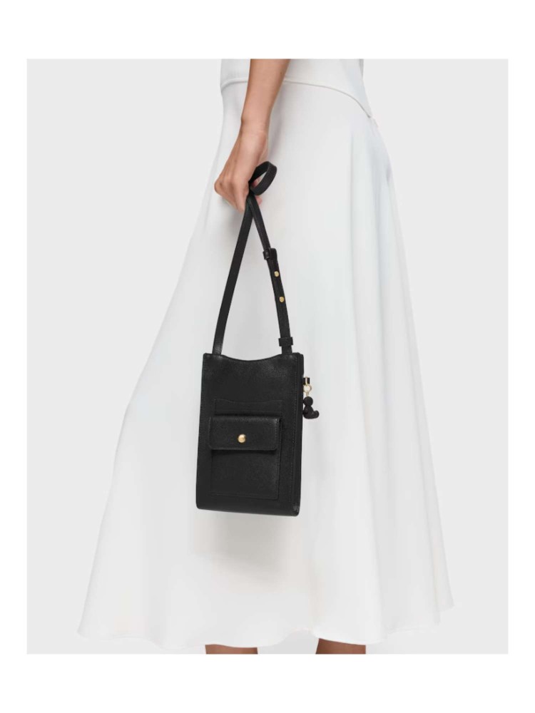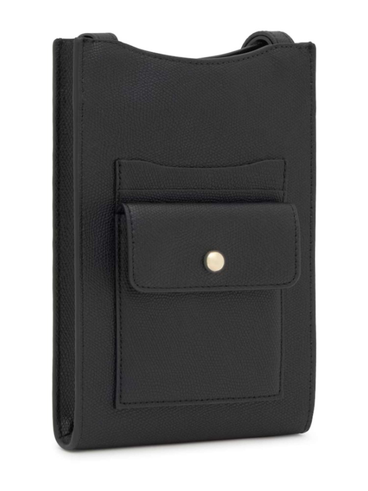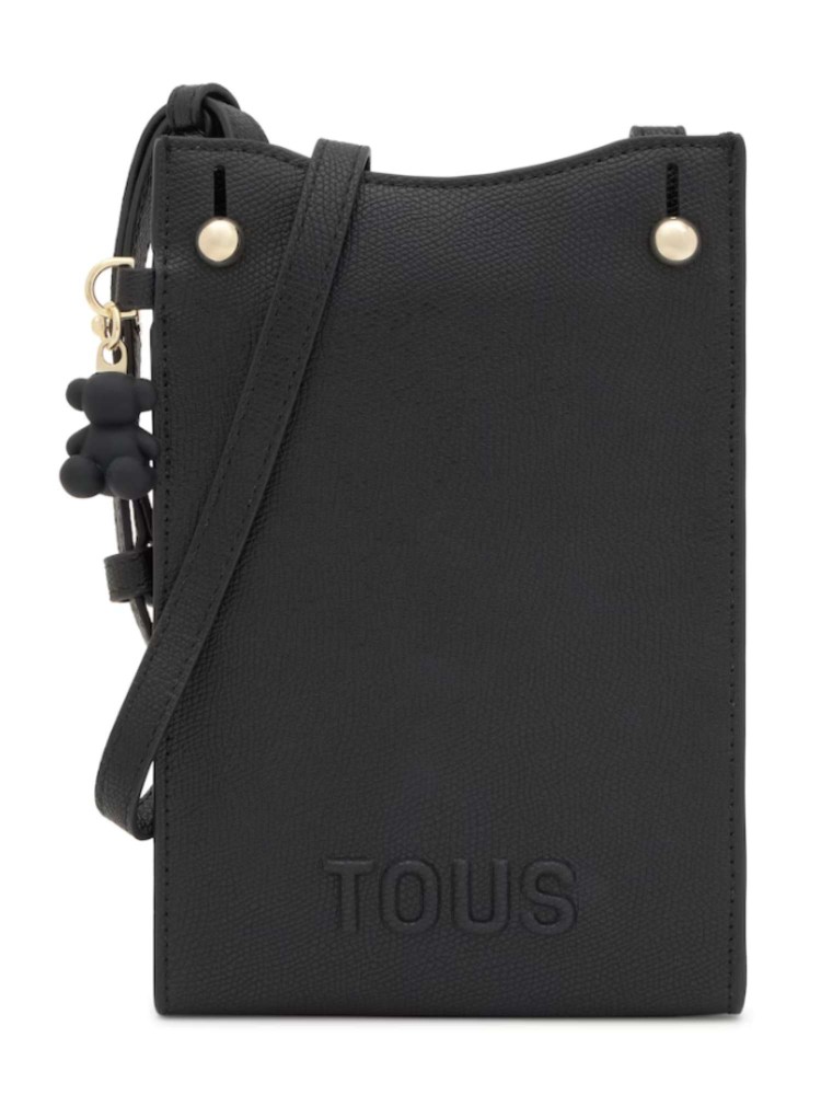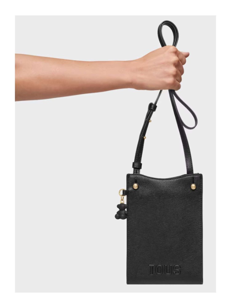 Funda de móvil colgante TOUS Back to basics de poliuretano en color negro. Cierre de botón magnético. Bolsillo exterior con botón magnético. Asa bandolera ajustable. Medidas (alto x ancho x fondo): 21,5 x 14 x 2,5 cm.