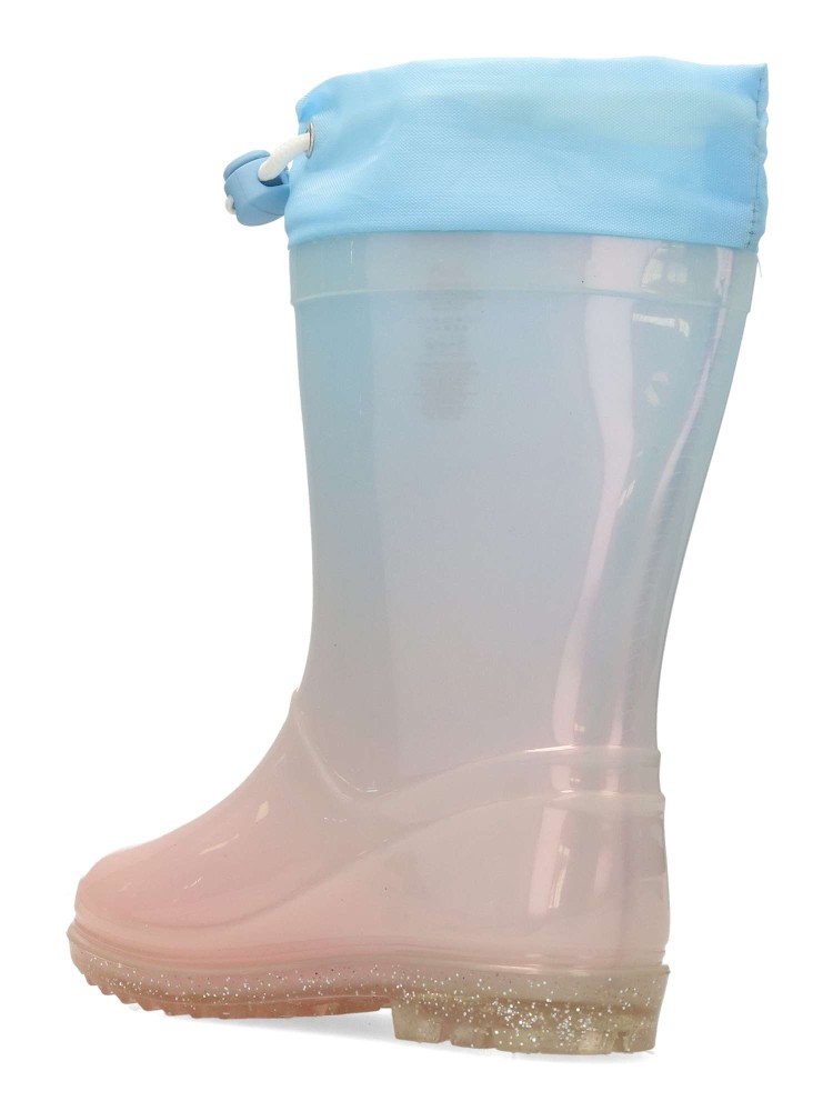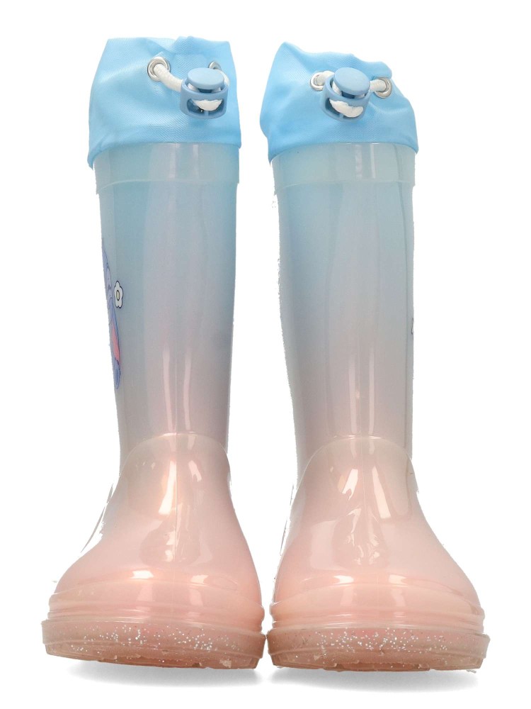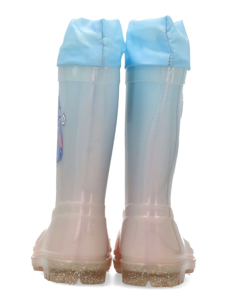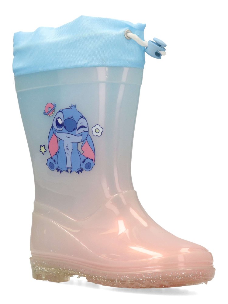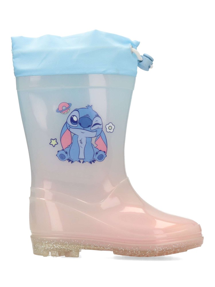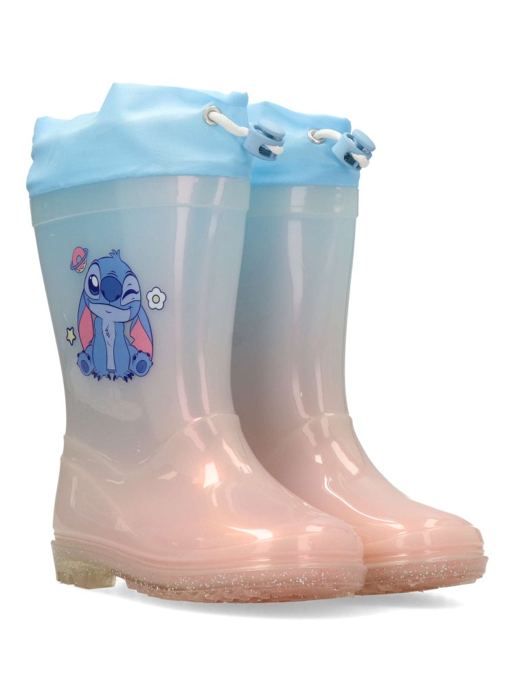 Bota de agua para niña. Fabricada en PVC flexible con cuello textil, que impide que los niños se mojen los pies. Color lila-rosa. Diversión para niñas, ideal para días lluviosos y terrenos húmedos. Perfectas para los fans de la Stitch.