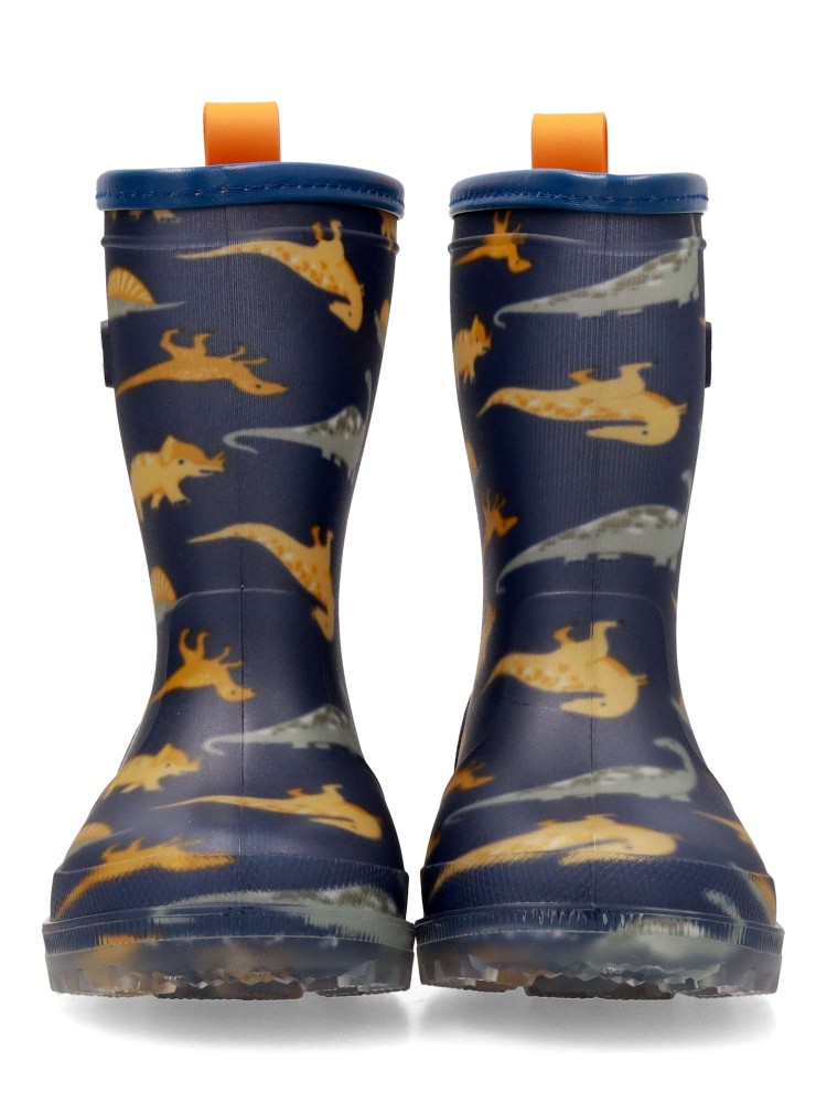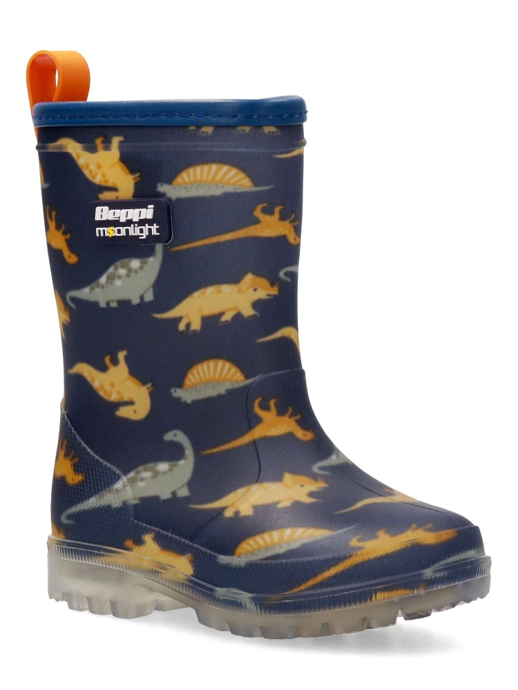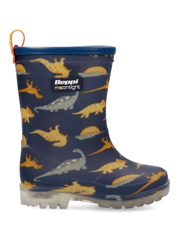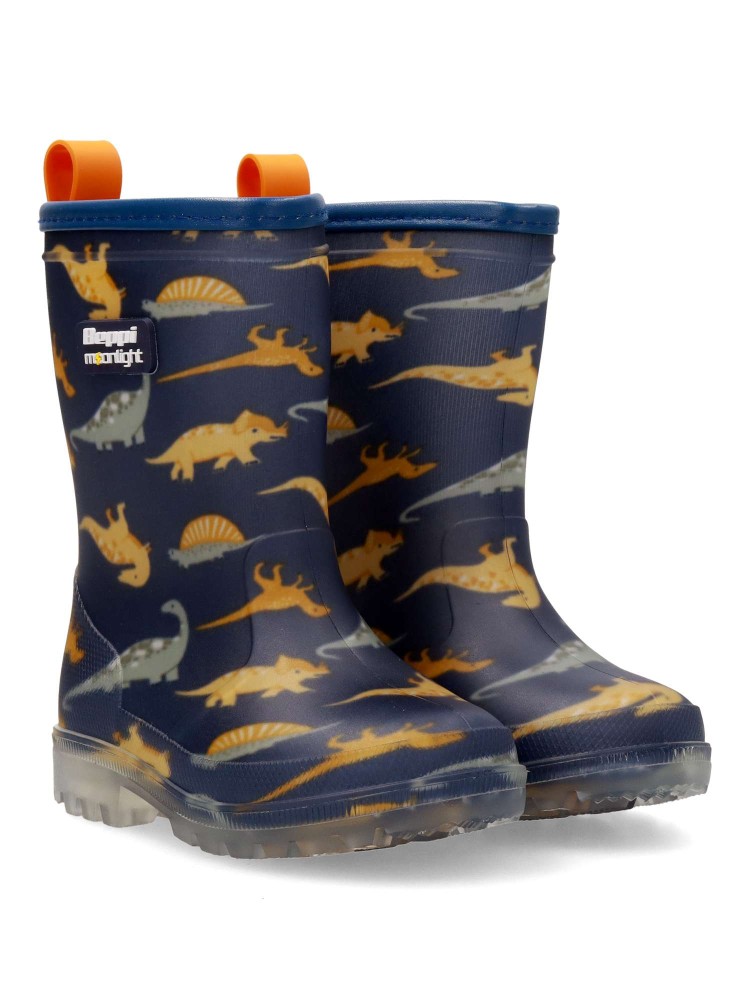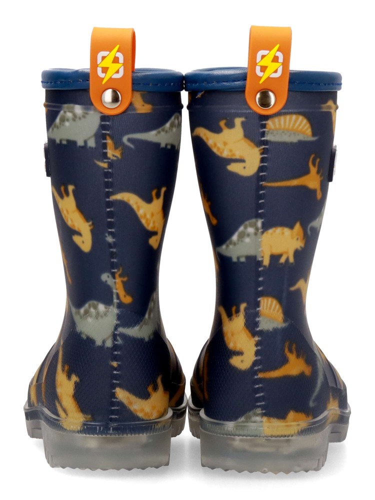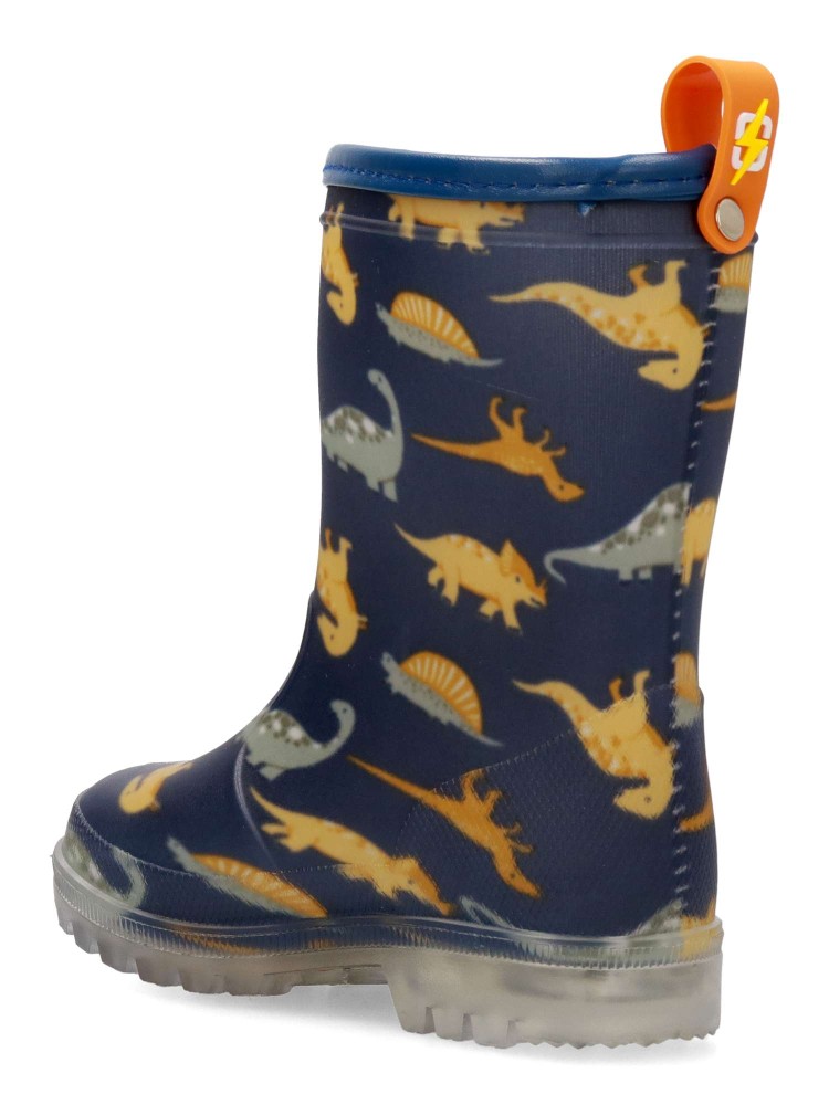 Botas de agua para niño, de goma, con estampado «dinosaurios». Color azul marino. Suela con luz LED para caminar de forma divertida. Diversión para niños, ideal para días lluviosos y terrenos húmedos.