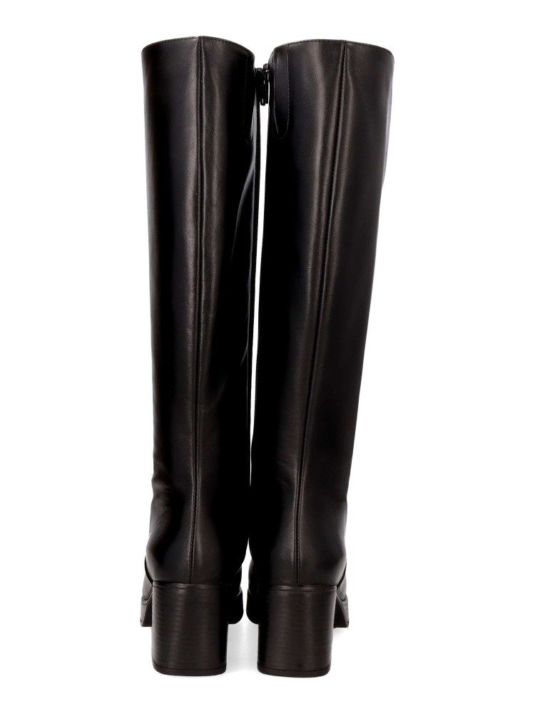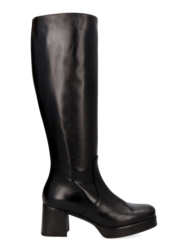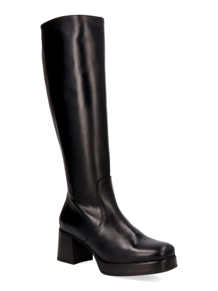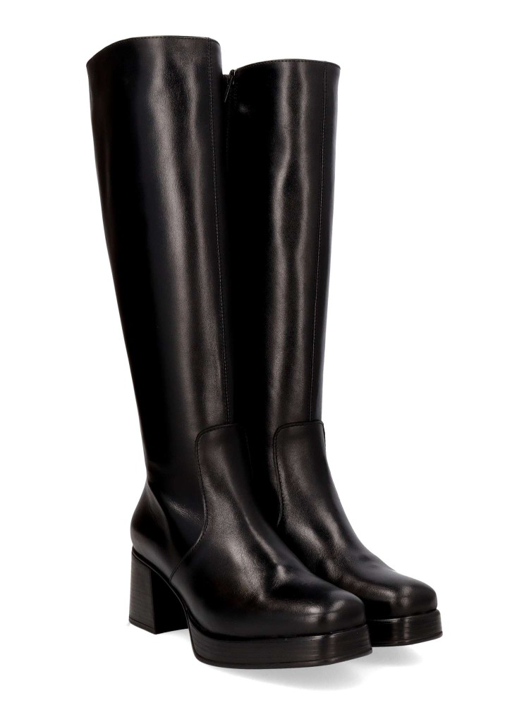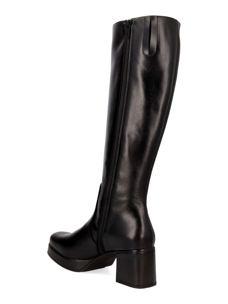 Bota alta de mujer, con cierre de cremallera lateral. Fabricada en piel, con suela de goma. Bota elegante con plataforma y tacón ancho de 6 cm. Caña de 39 cm. Diseño cómodo y elegante para estar a la moda.