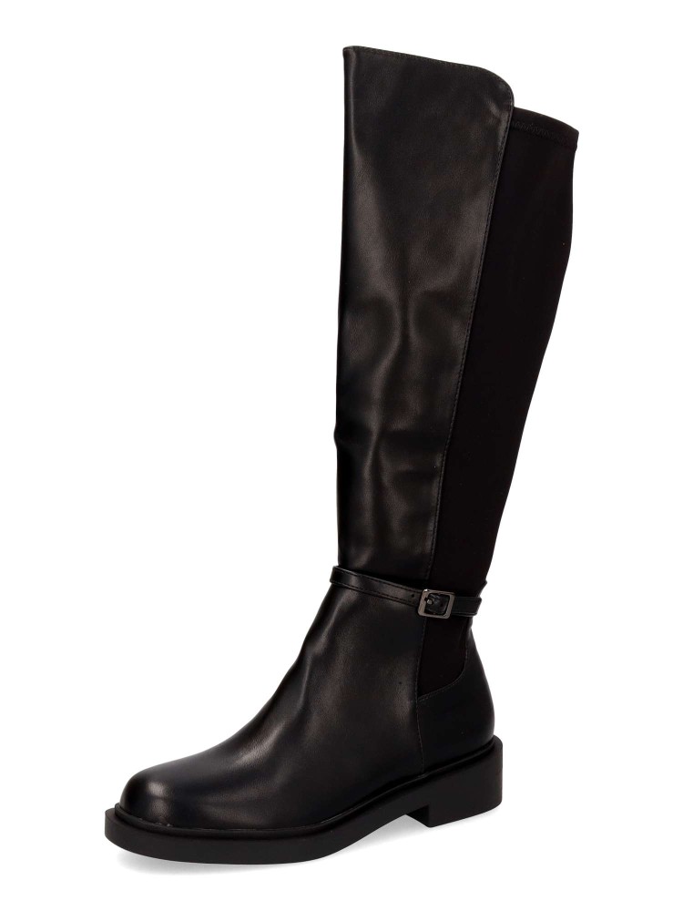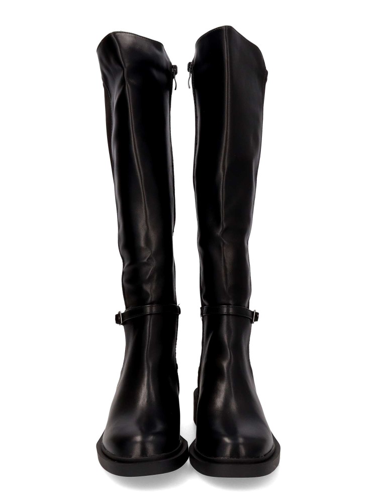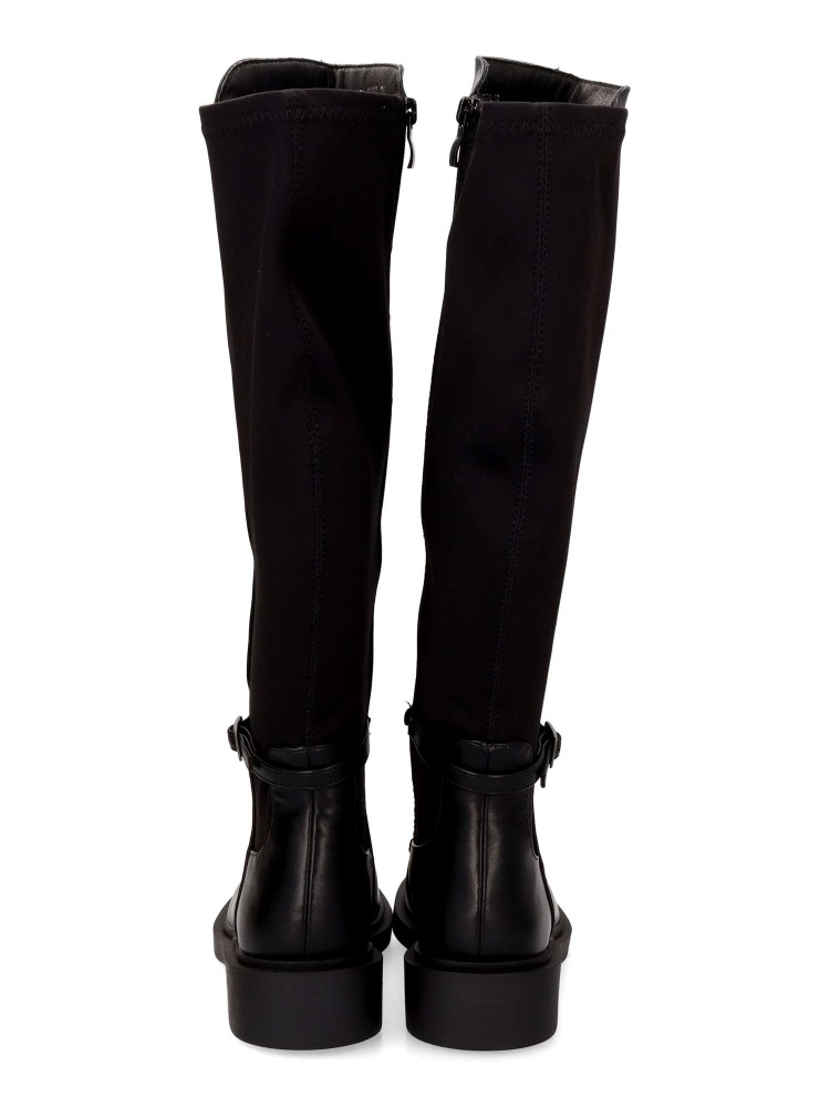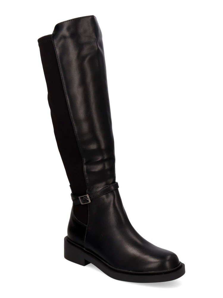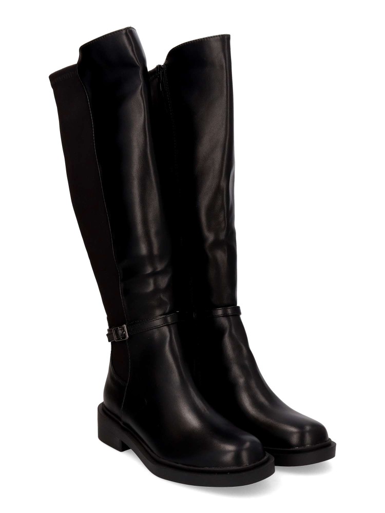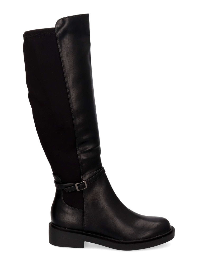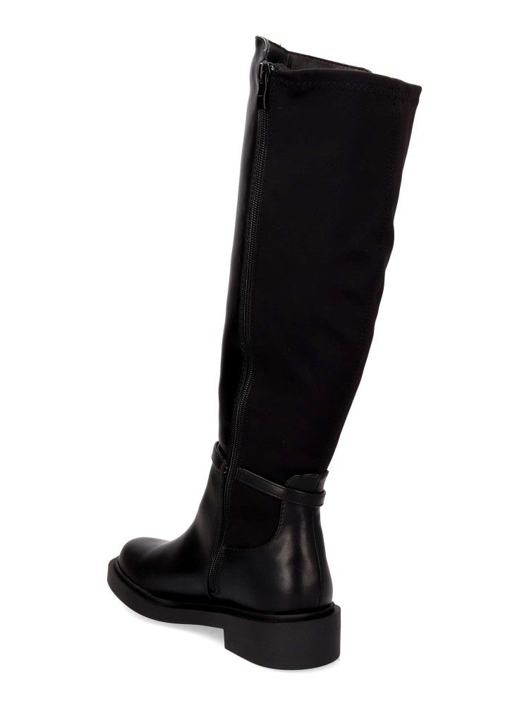 Bota alta de mujer, con cierre de cremallera lateral y elástico en la caña. Fabricado en piel sintética. Tacón de 3,5 cm. Caña de 40 cm. Color negro. Diseño cómodo, ligero, súper flexible, ajustable y a la moda, perfectos con tus outfits de invierno.