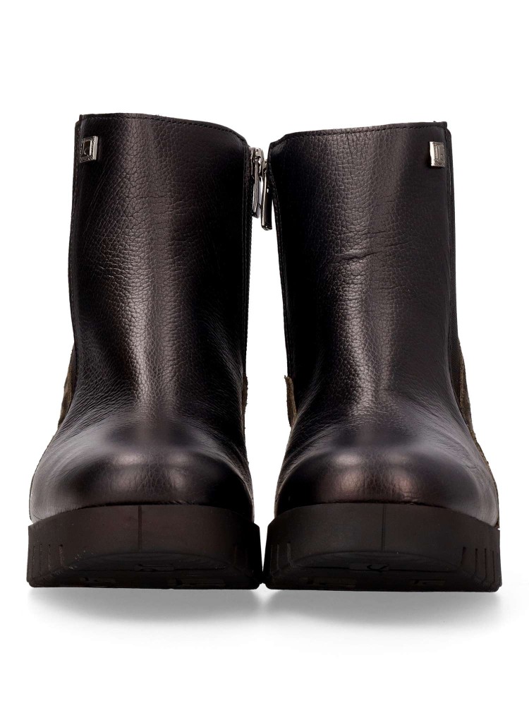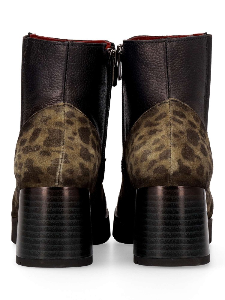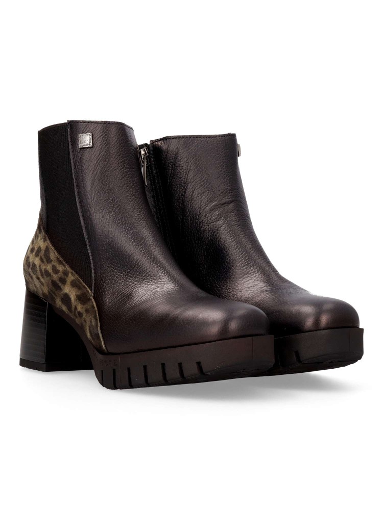 Botín de mujer, con cierre de cremallera lateral y elástico. Fabricadas en piel color negro y velur con estampado animal. Tacón de 6 cm. y caña de 12 cm. Plantilla acolchada y extraíble. Fácil de combinar con tus outfits de invierno. Hecho en España.