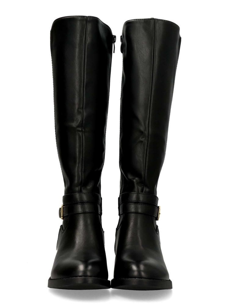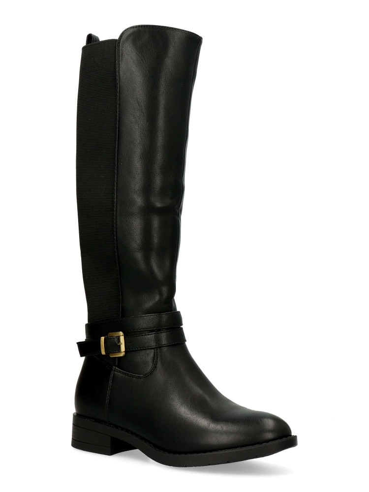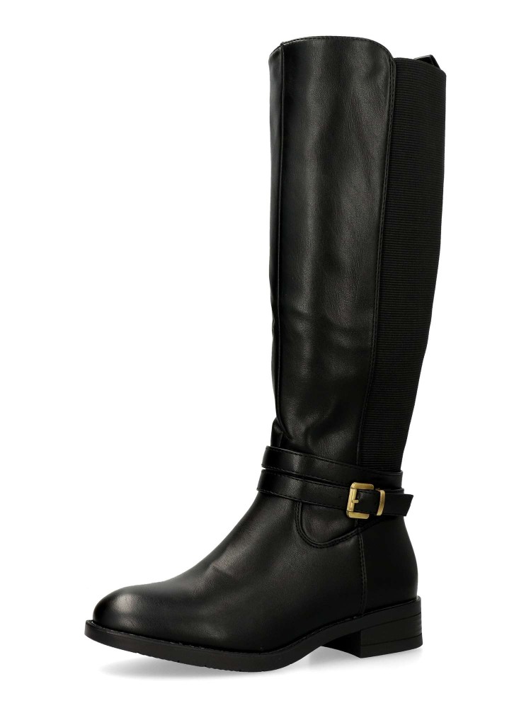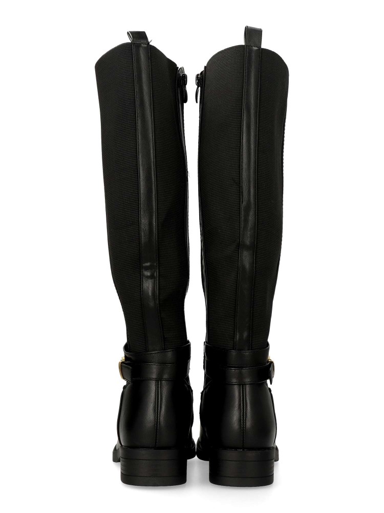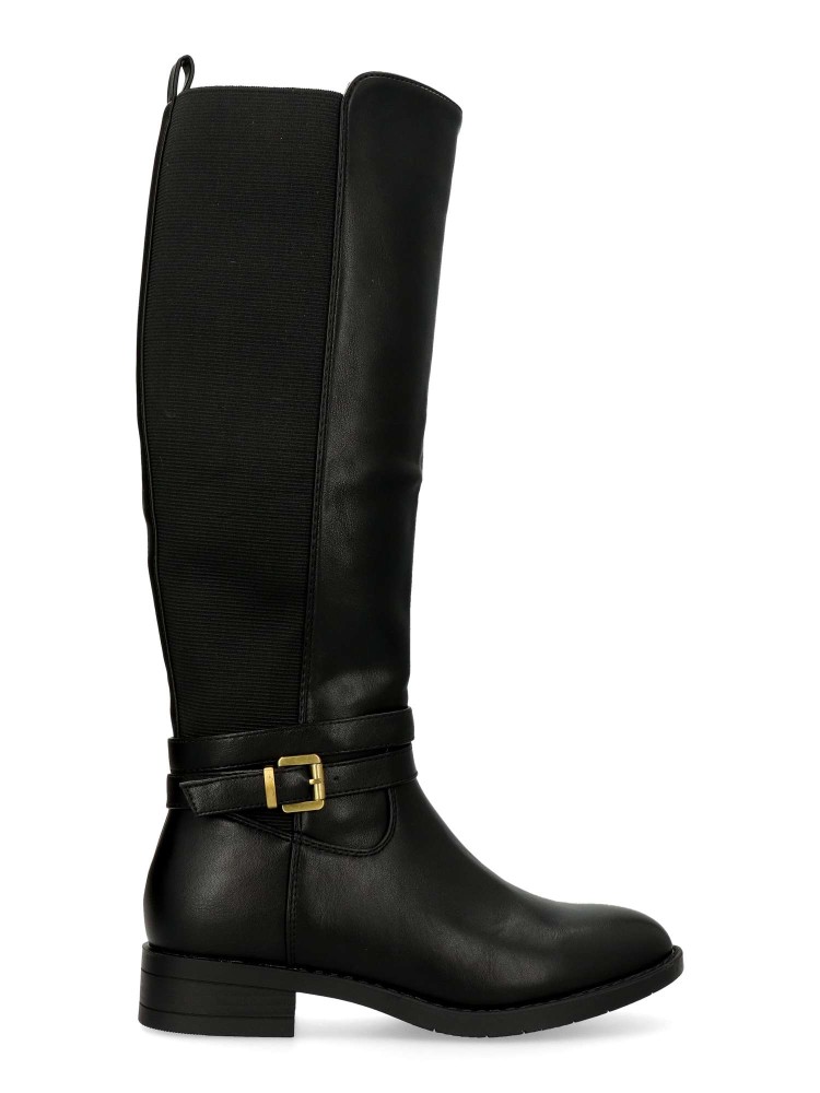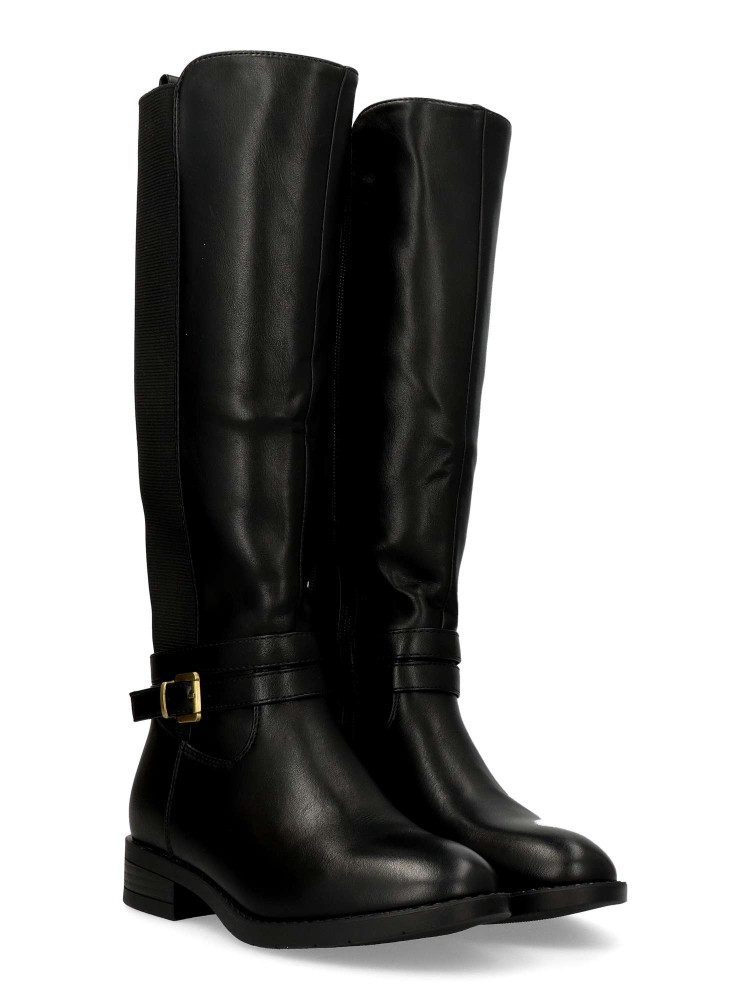 Bota alta de mujer, con cierre de cremallera lateral y elástico en la caña. Tacón de 3,5 cm. de altura. Caña de 38 cm. Color negro. Modelo ligero, súper flexible, ajustable, de diseño, a la moda y perfectos con tus outfits de invierno.