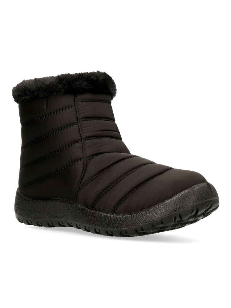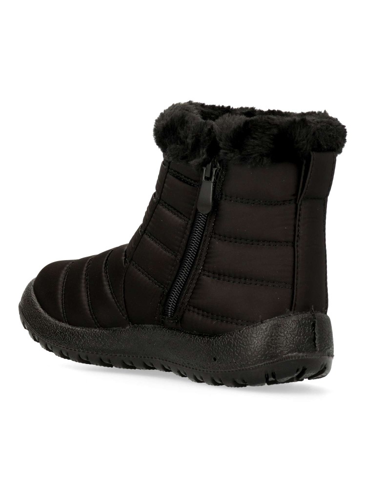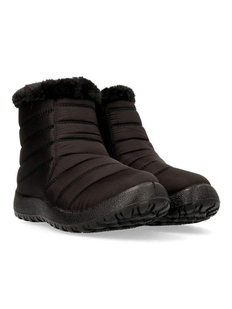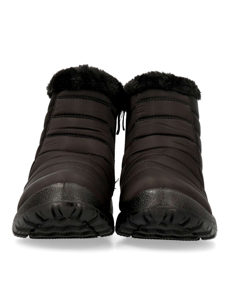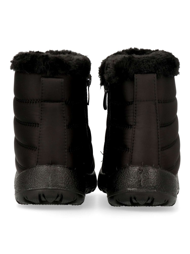 Botín plano de mujer, con cierre de cremallera lateral. Modelo cómodo, fabricado en textil acolchado, con suela de goma ligera y flexible. Forro interior de pelo sintético suave. Color negro. Modelo cálido y confortable, ideal con tus outfits de invierno.