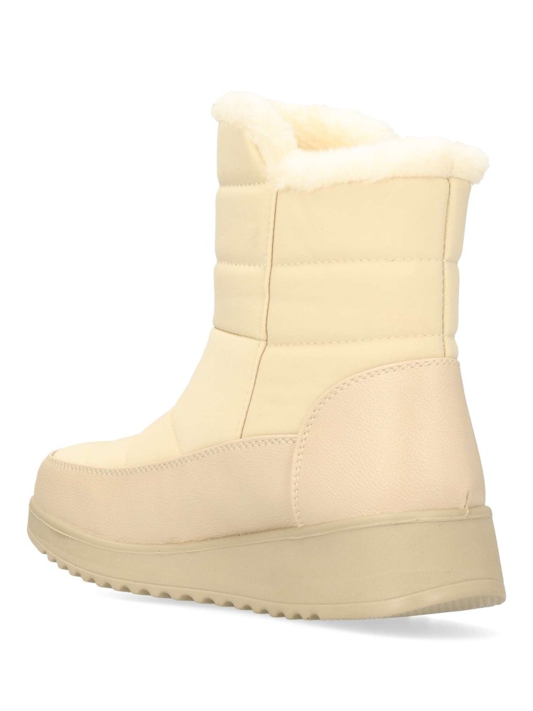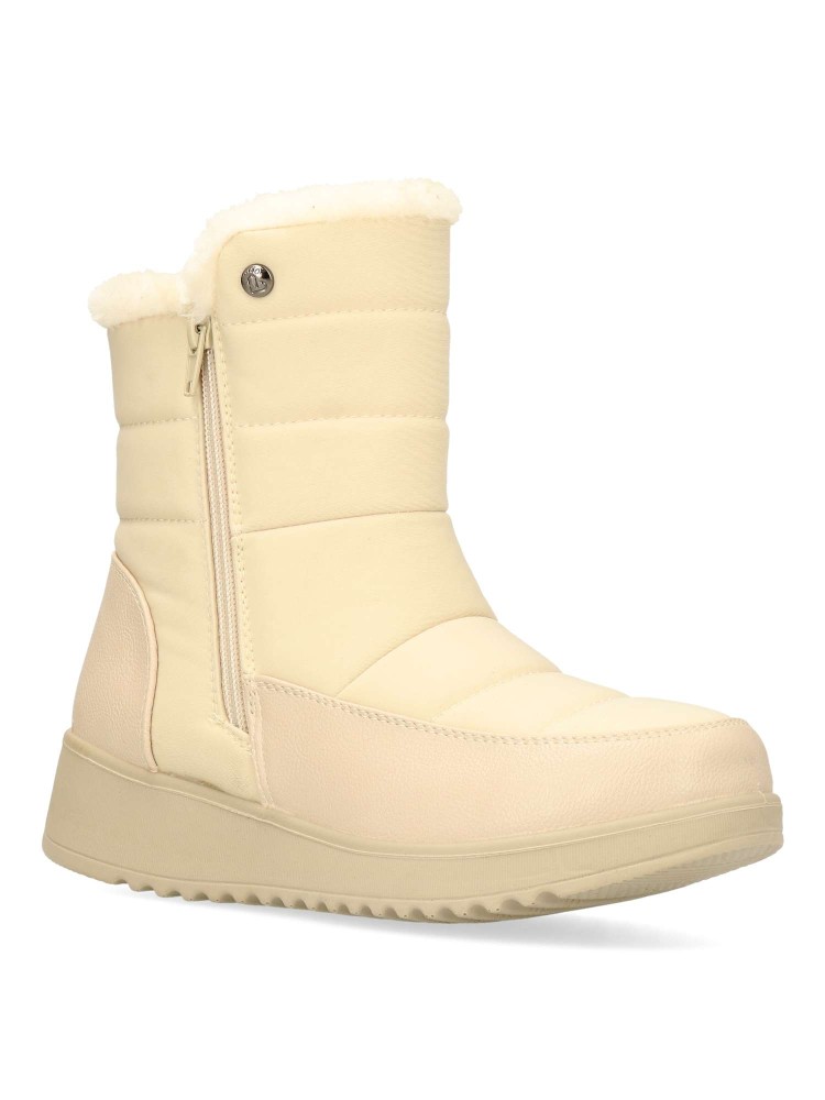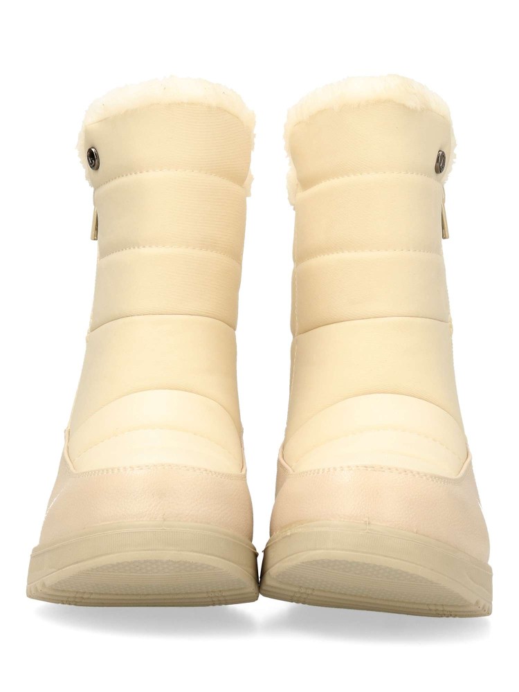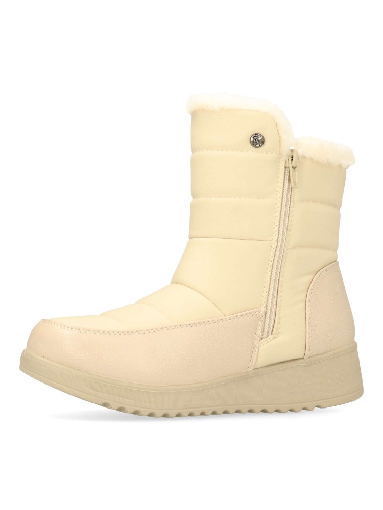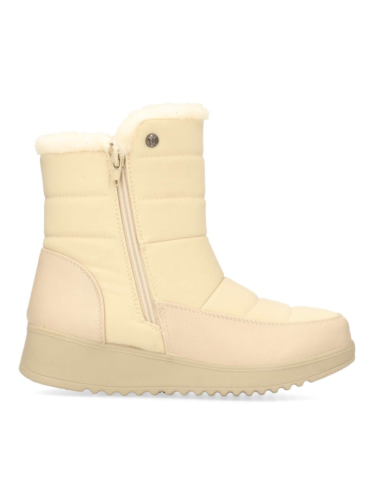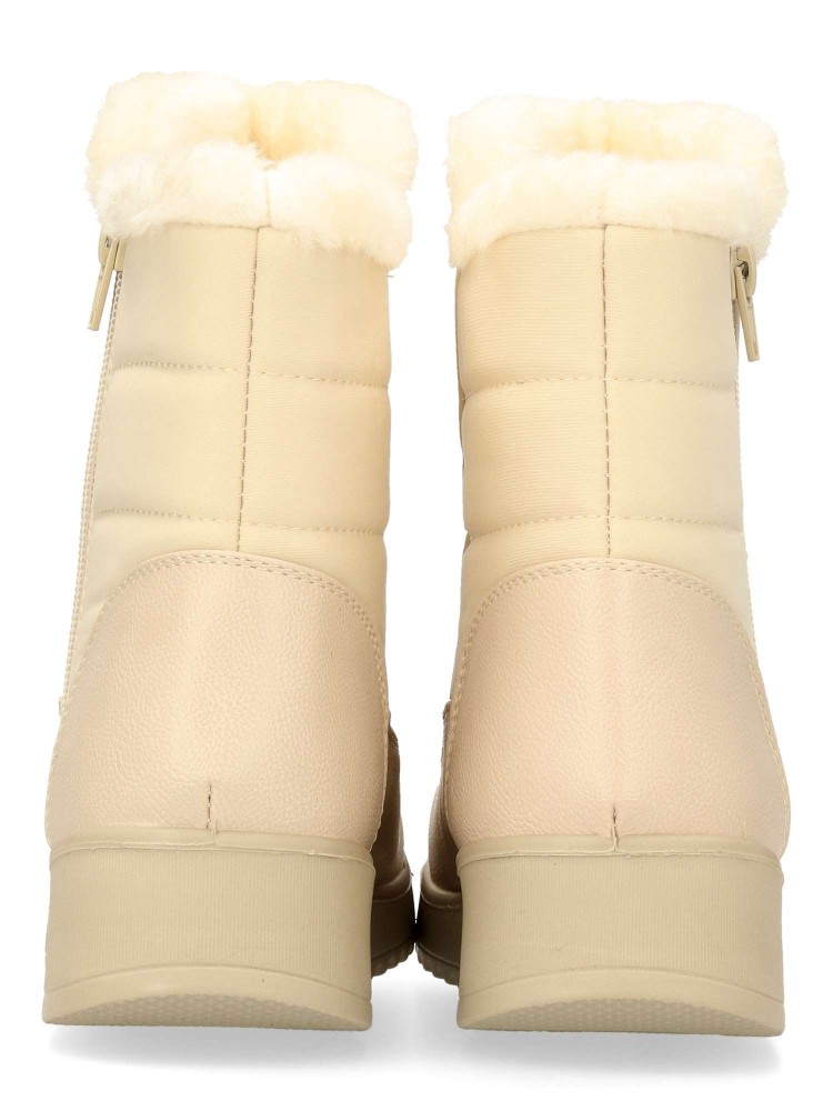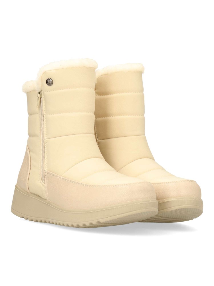 Botín de mujer con cierre de cremallera lateral. Modelo cómodo, fabricado en piel sintética y textil acolchado. Forro interior de pelo sintético. Pequeña cuña de 4 cm. Color hielo. Botines con los que te sentirás abrigada durante todo el día.