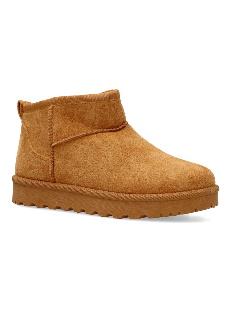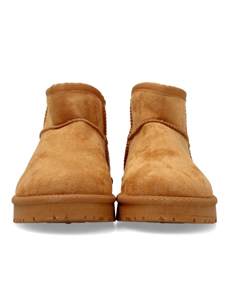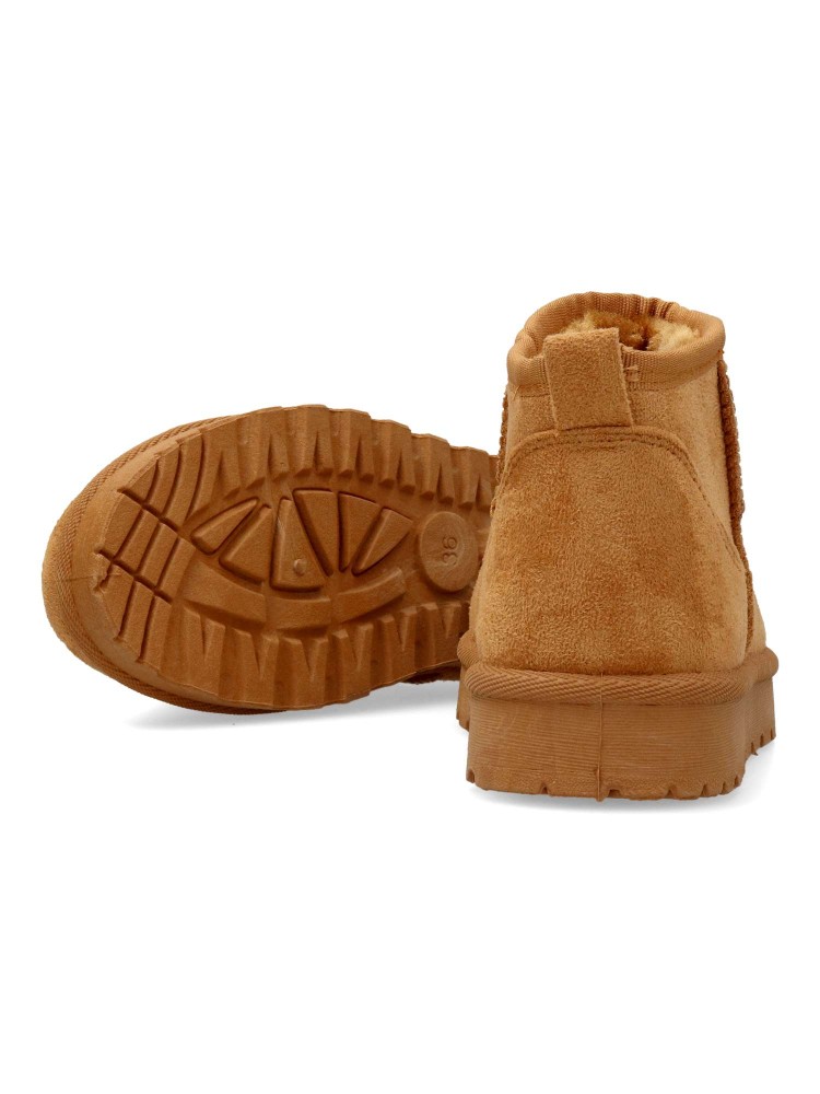 Botín bajo de mujer, tipo australiana. Fabricada en textil antelina. Forro interior de pelo sintético. Suela de goma. Caña de 9 cm. Color camel. Diseño cómodo y abrigado para que no pases frío este invierno y lo combines con tus looks de temporada.