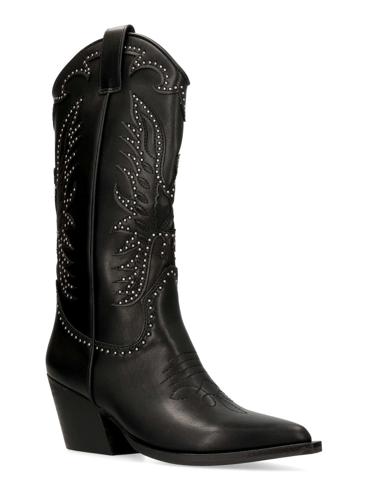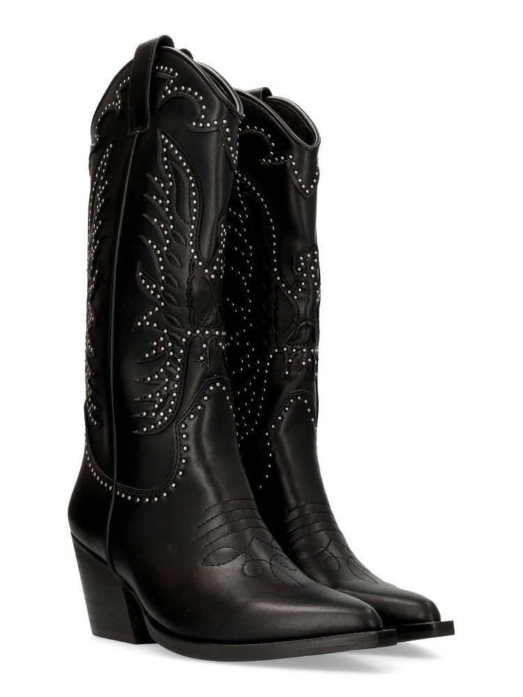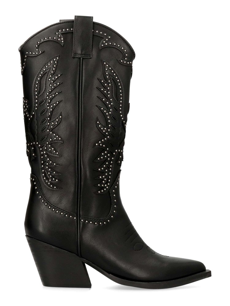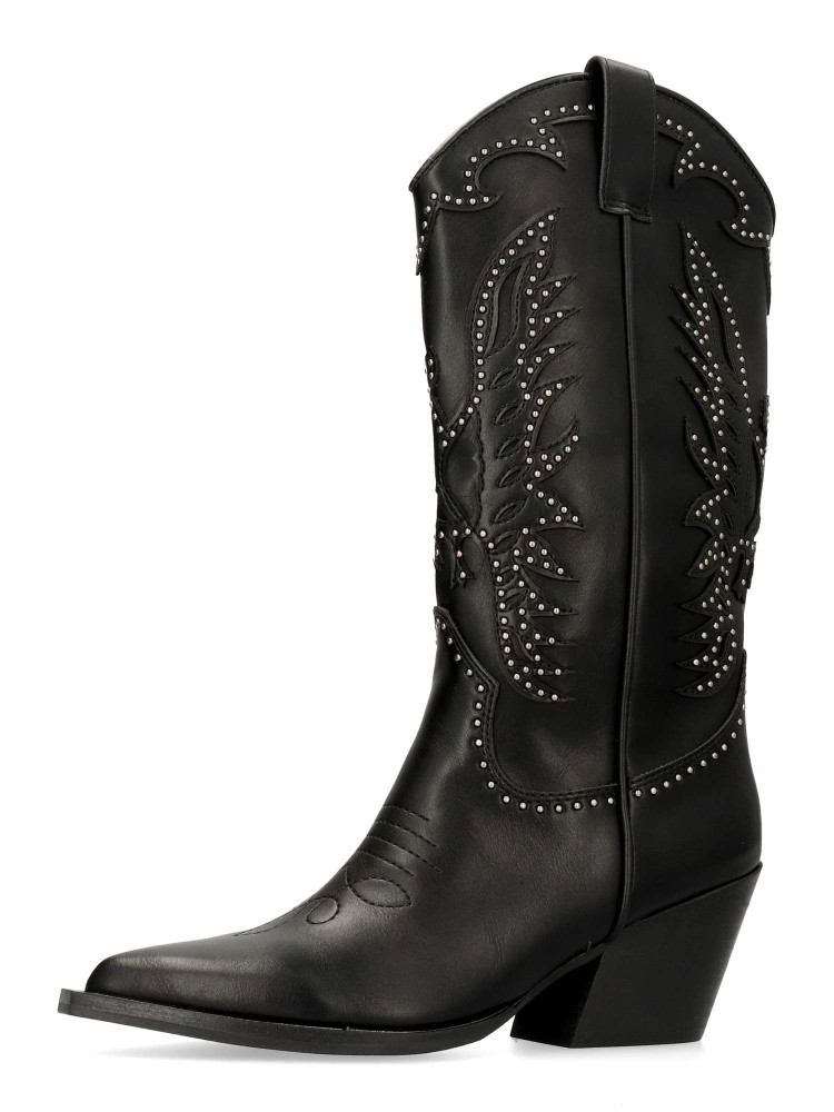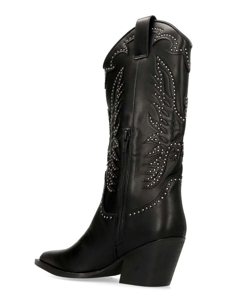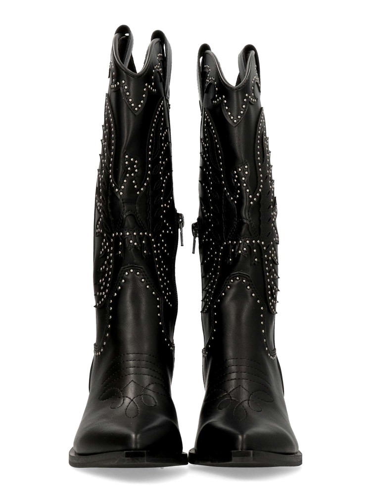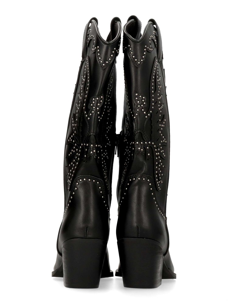 Bota alta de mujer, estilo cowboy. Cierre de cremallera lateral. Fabricada en material sintético con suela de goma. Color negro. Caña 30 cm. Tacón ancho de 6 cm. Original bordado en la caña y tachas decorativas. Dale un toque boho a tu outfit vaquero.