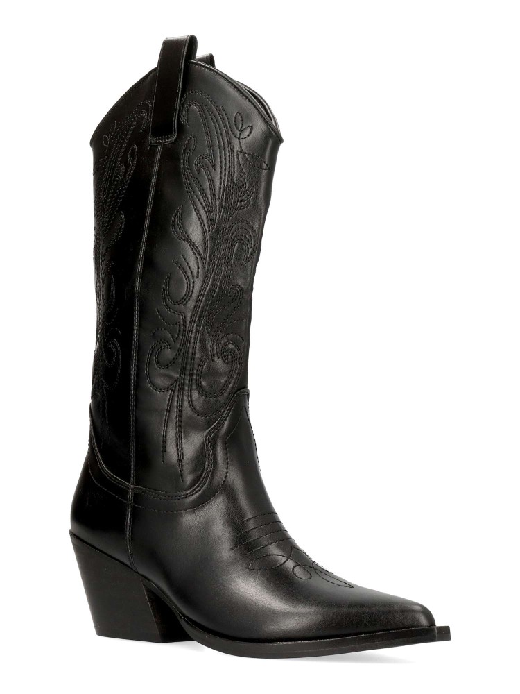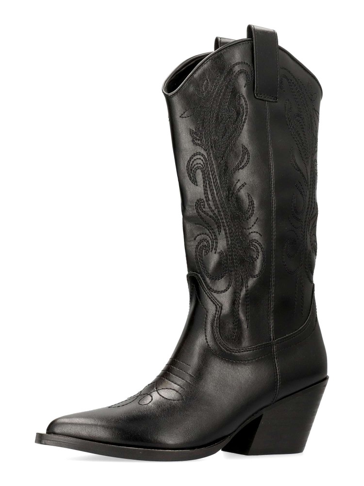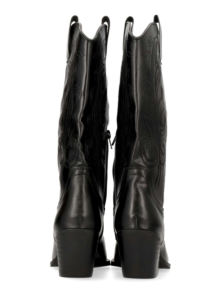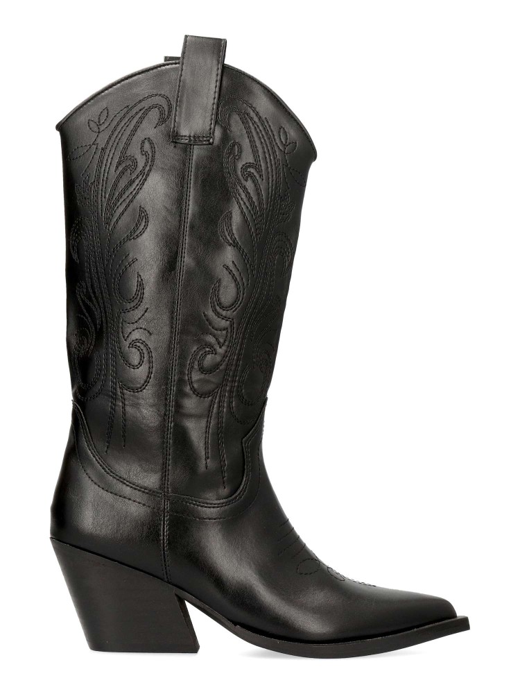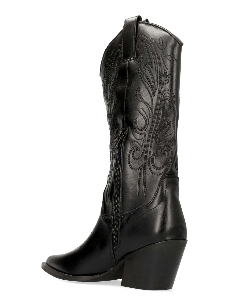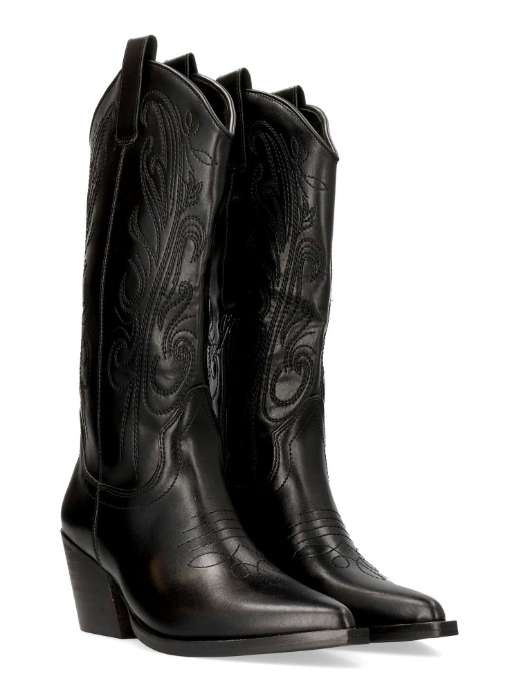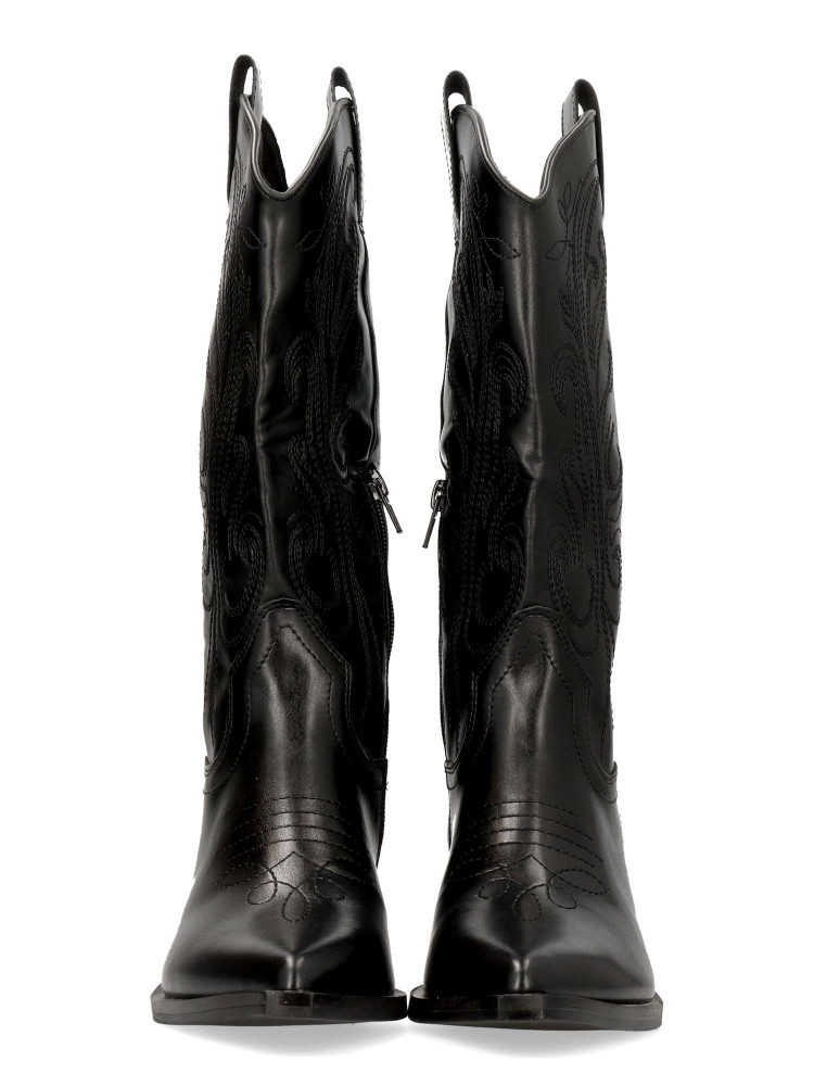 Bota de mujer, estilo cowboy. Cierre de cremallera lateral. Fabricada en material sintético con suela de goma. Disponible en color negro. Altura de caña 29 cm. Tacón ancho de 5,5 cm. Original bordado en la caña. Dale un toque boho a tus outfits.
