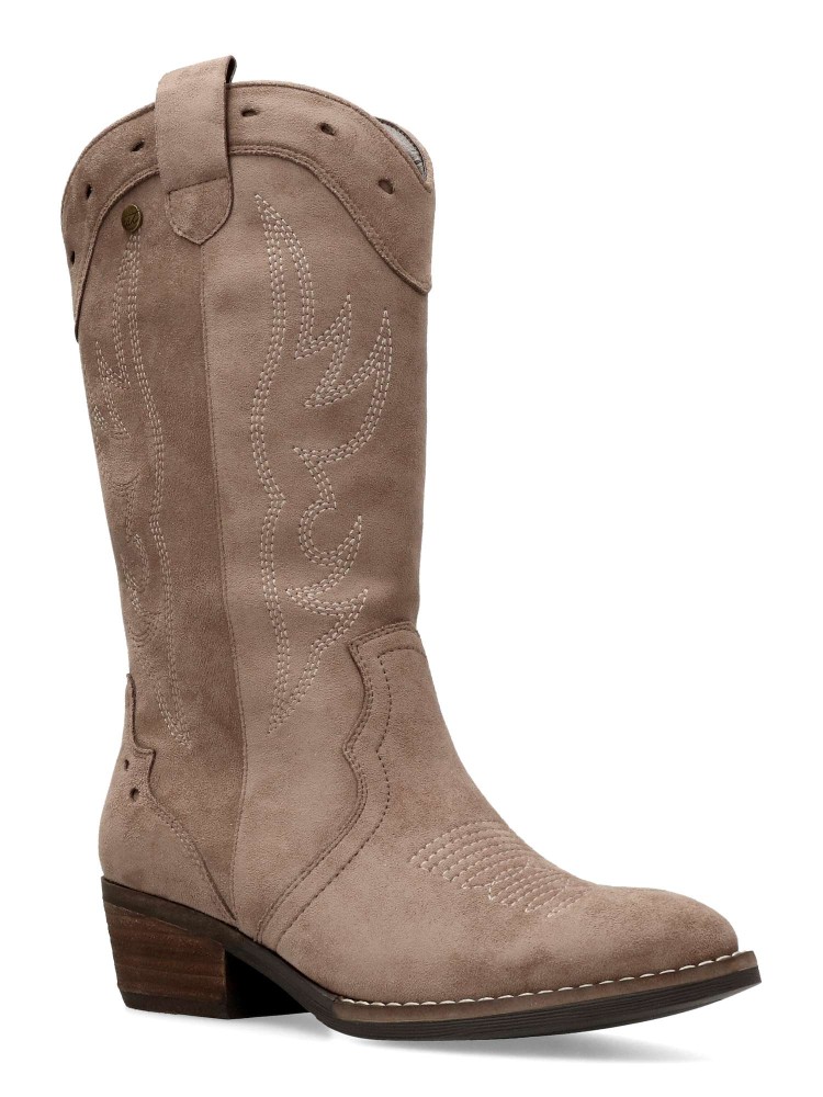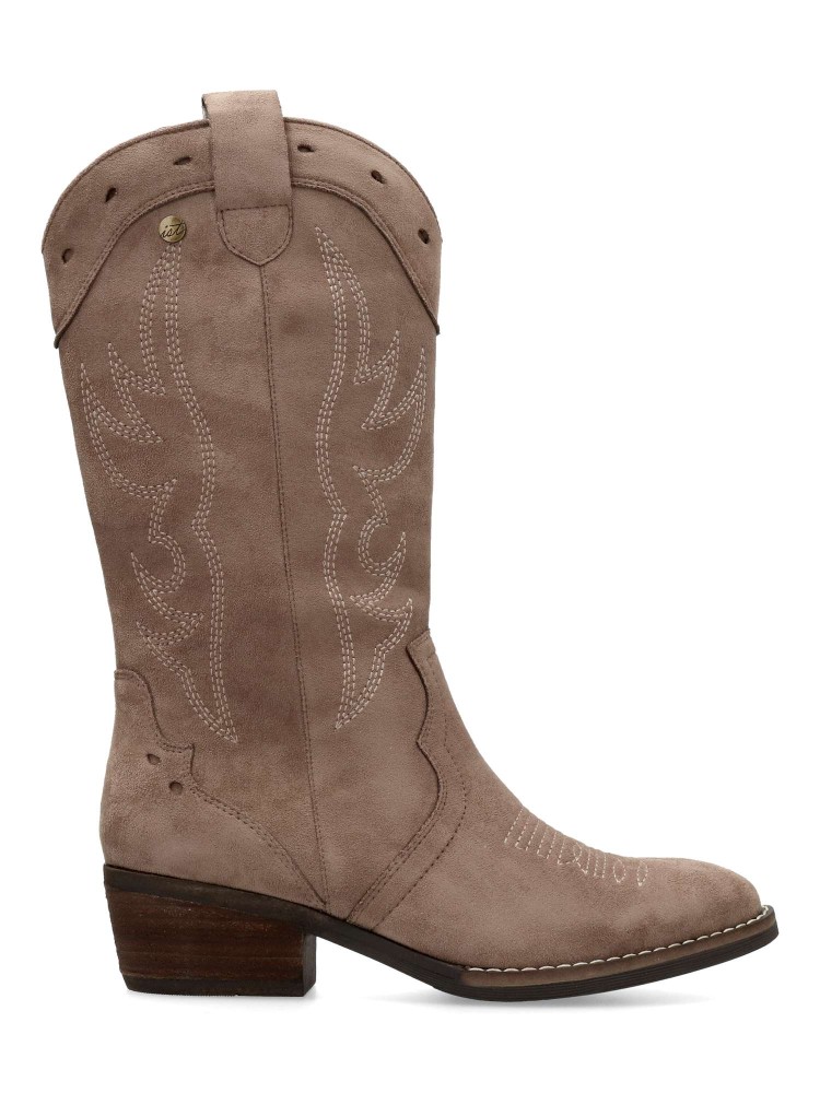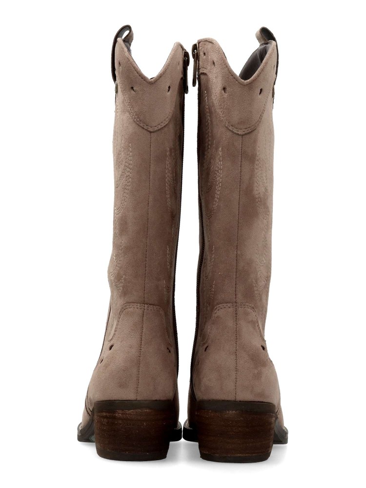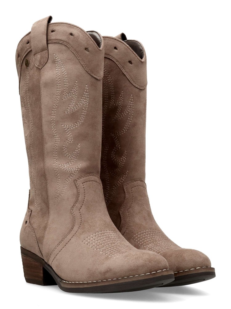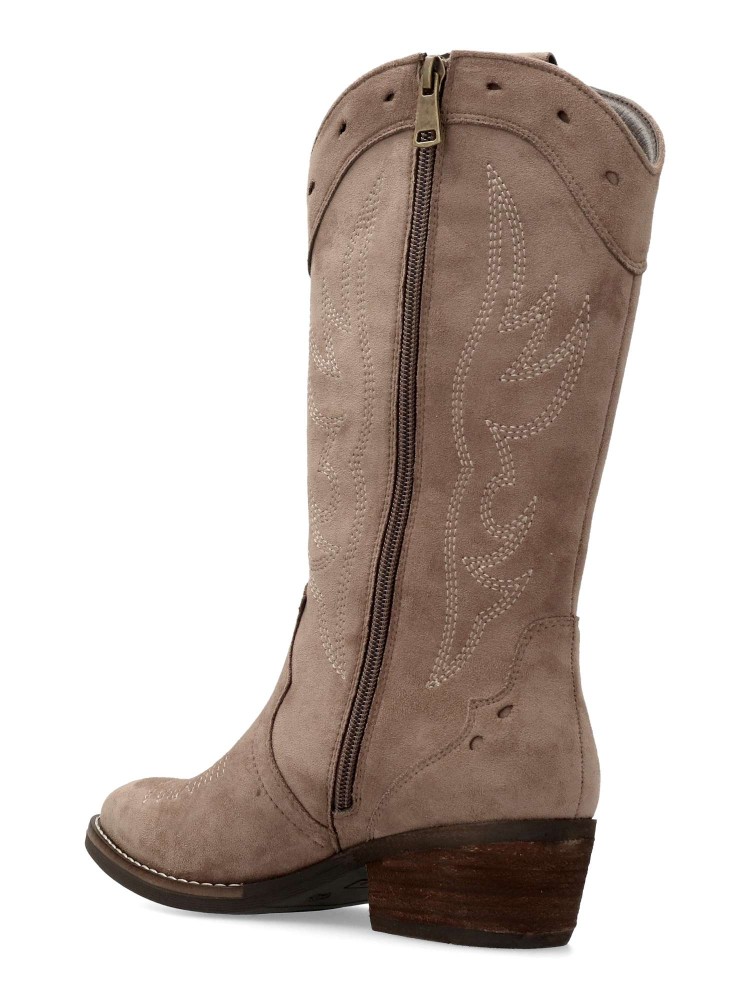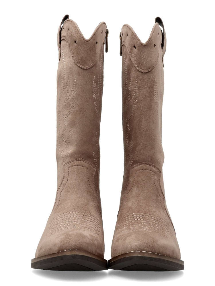 Bota cowboy de mujer, con cierre de cremallera. Fabricada en antelina suave. Original bordado en la caña. Color taupe. Elegantes, versátiles y siempre en tendencia. Un equilibrio perfecto entre estilo y comodidad para complementar cualquier look.