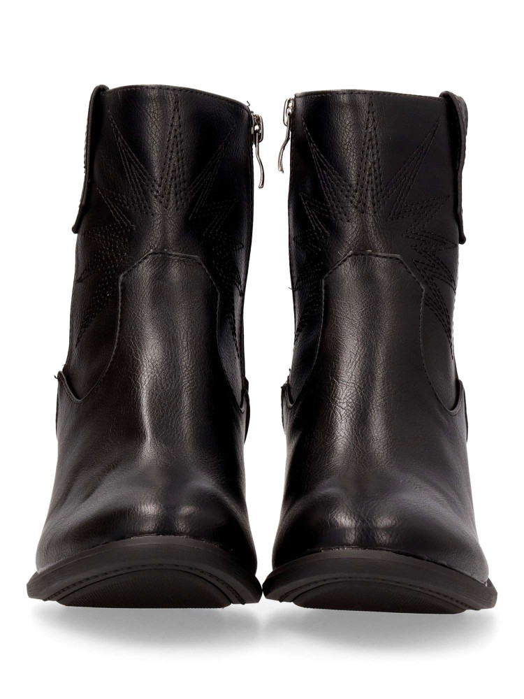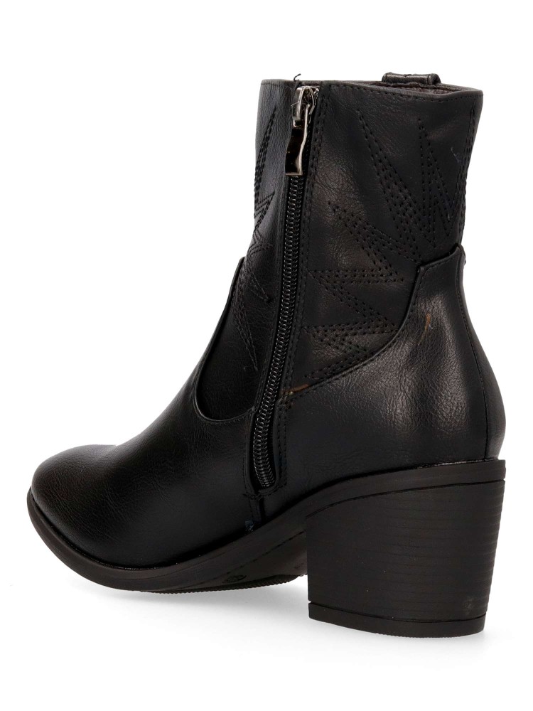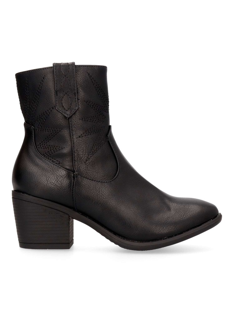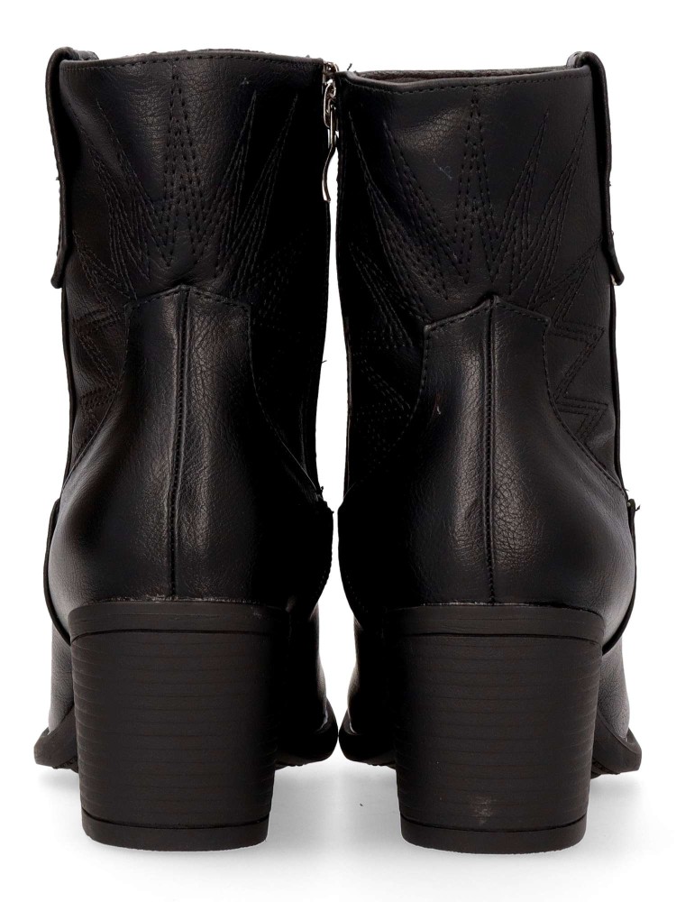 Botín de mujer estilo cowboy, con cierre de cremallera. Fabricados en piel sintética, color negro. Tacón ancho de 5,5 cm. y caña de 14,5 cm. Diseñados con un estilo clásico y un cómodo, perfecta para añadir un toque bohemio y chic a tu vestuario.