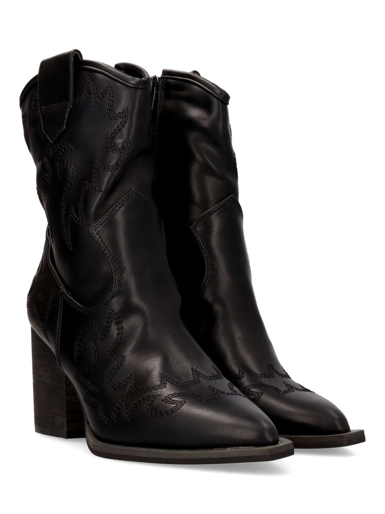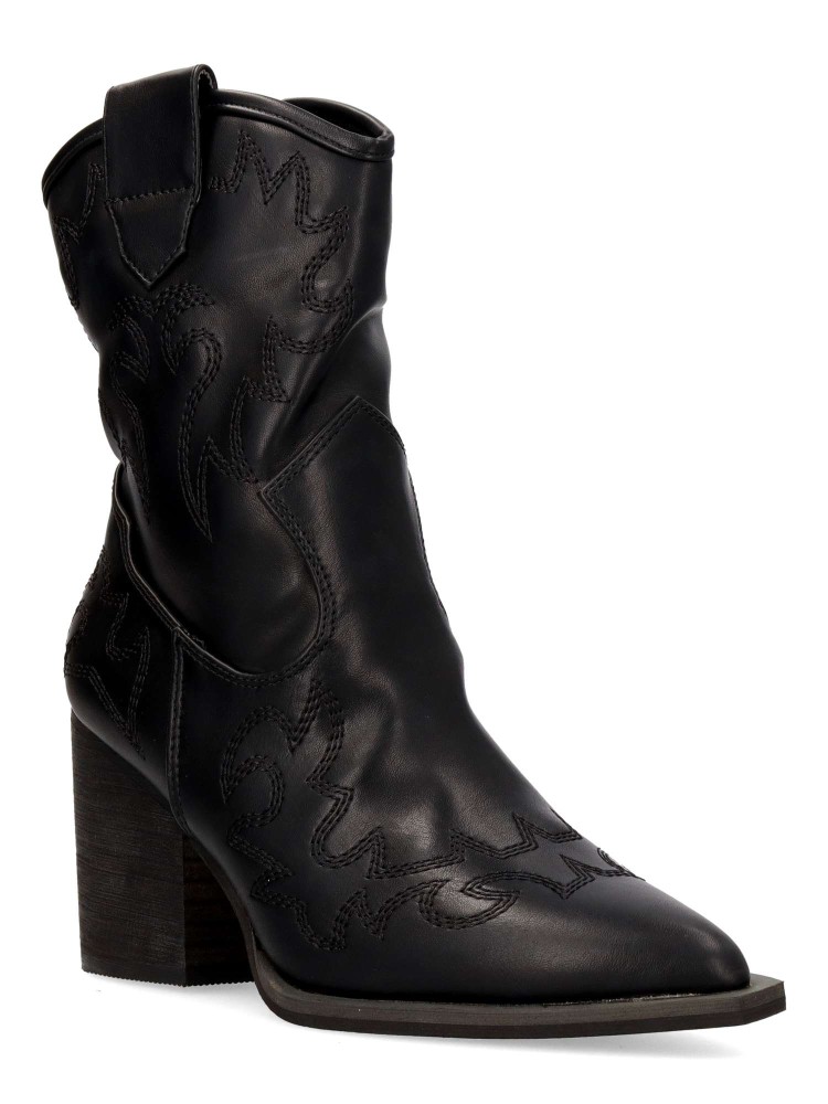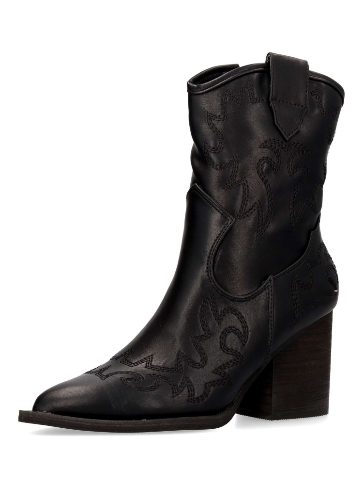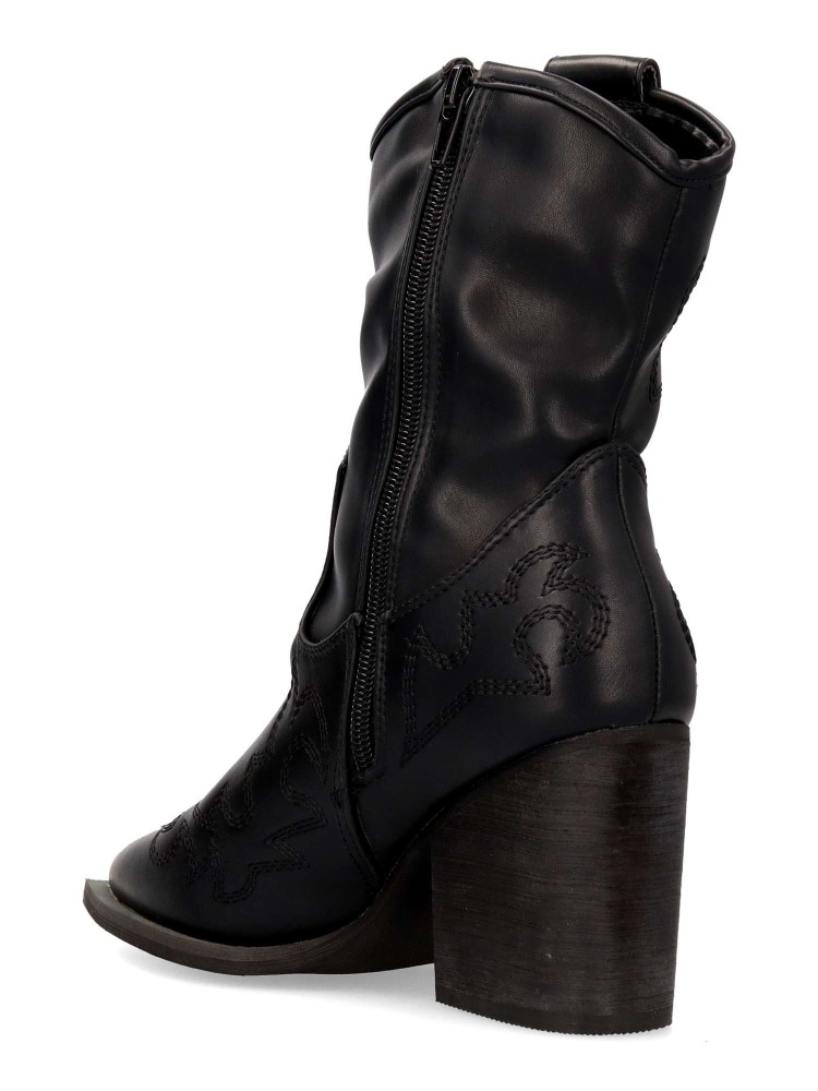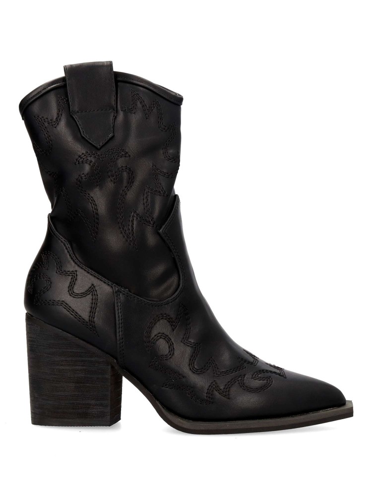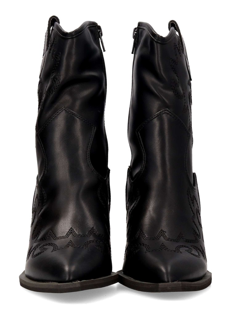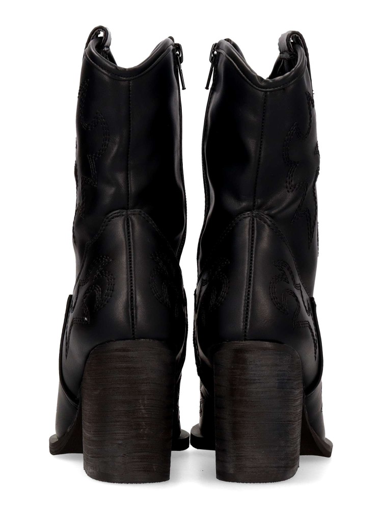 Botín cowboy de mujer, con cierre de cremallera. Fabricado en sintético suave. Original bordado en la caña. Color negro. Elegantes, versátiles y siempre en tendencia. Un equilibrio perfecto entre estilo y comodidad para complementar cualquier outfit.