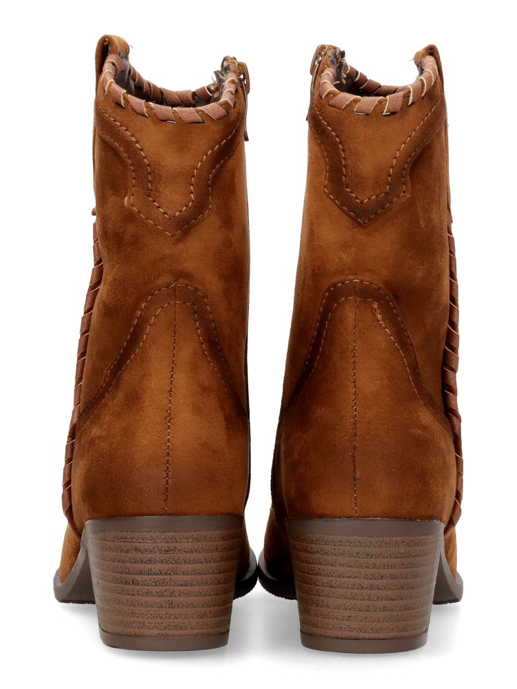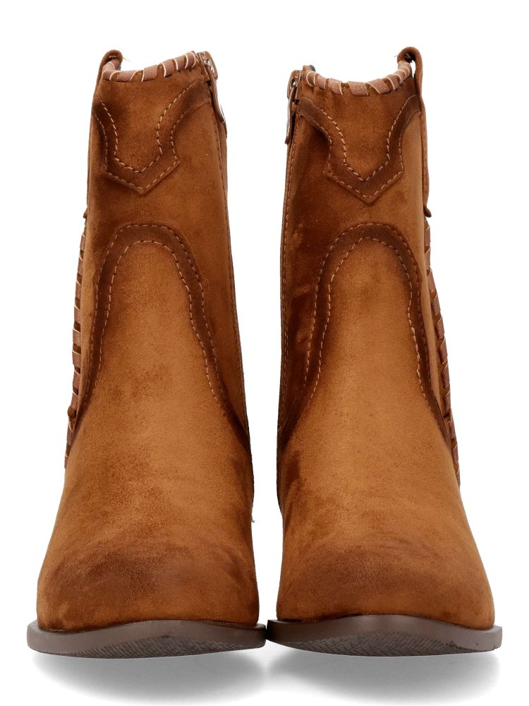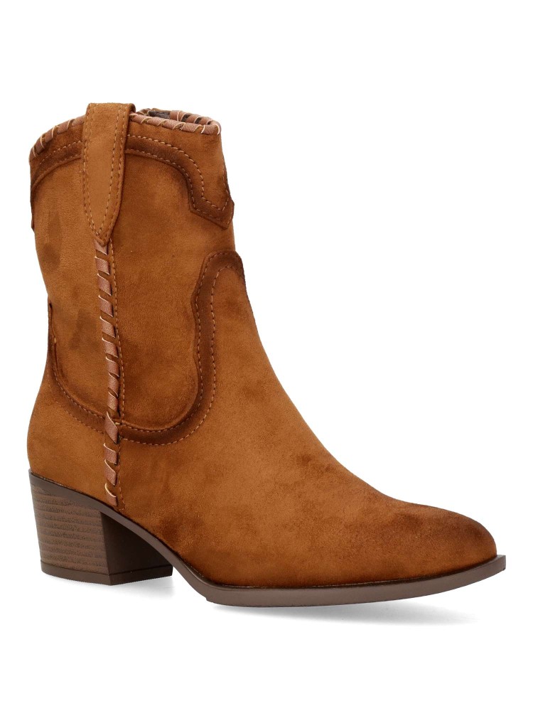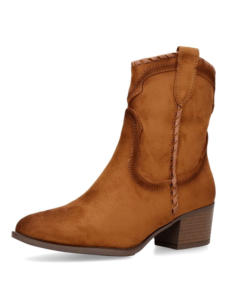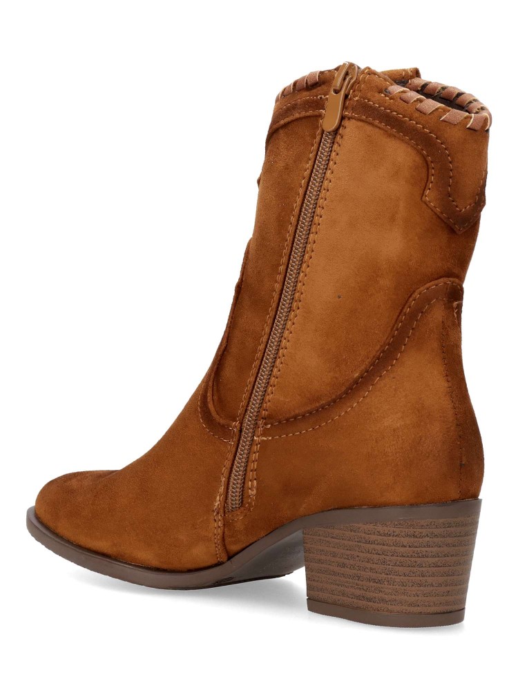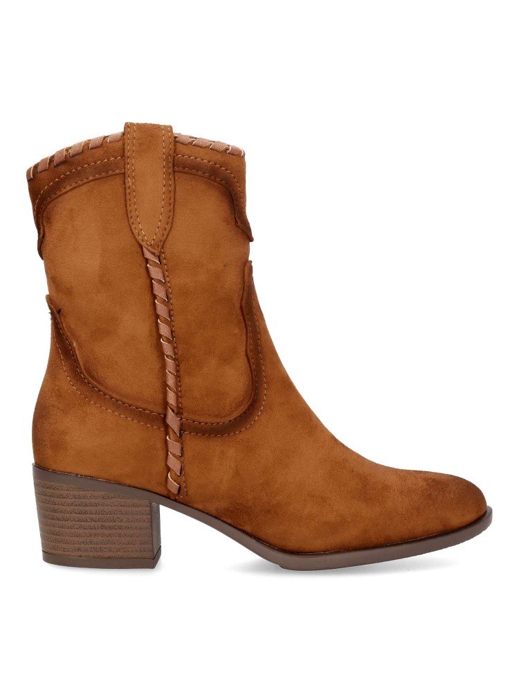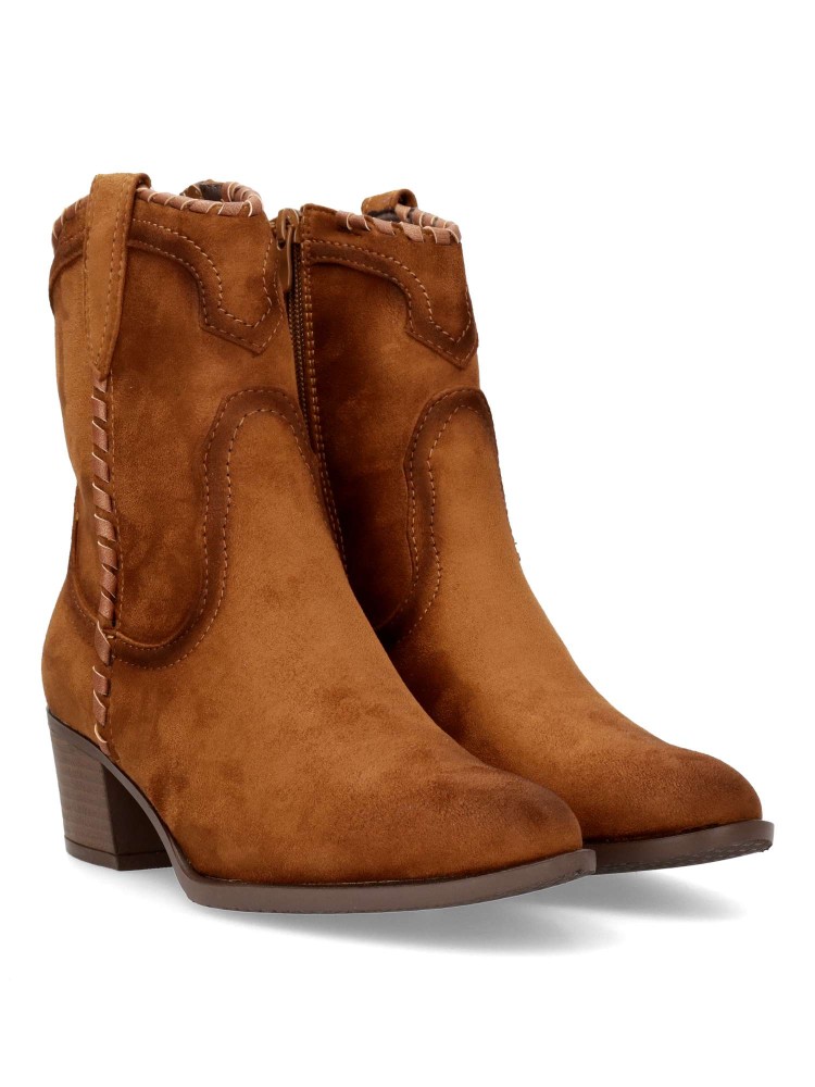 Botín cowboy de mujer, con cierre de cremallera. Fabricado en sintético antelina suave. Color cuero. Elegantes, versátiles y siempre en tendencia. Un equilibrio perfecto entre estilo y comodidad para complementar cualquier look.