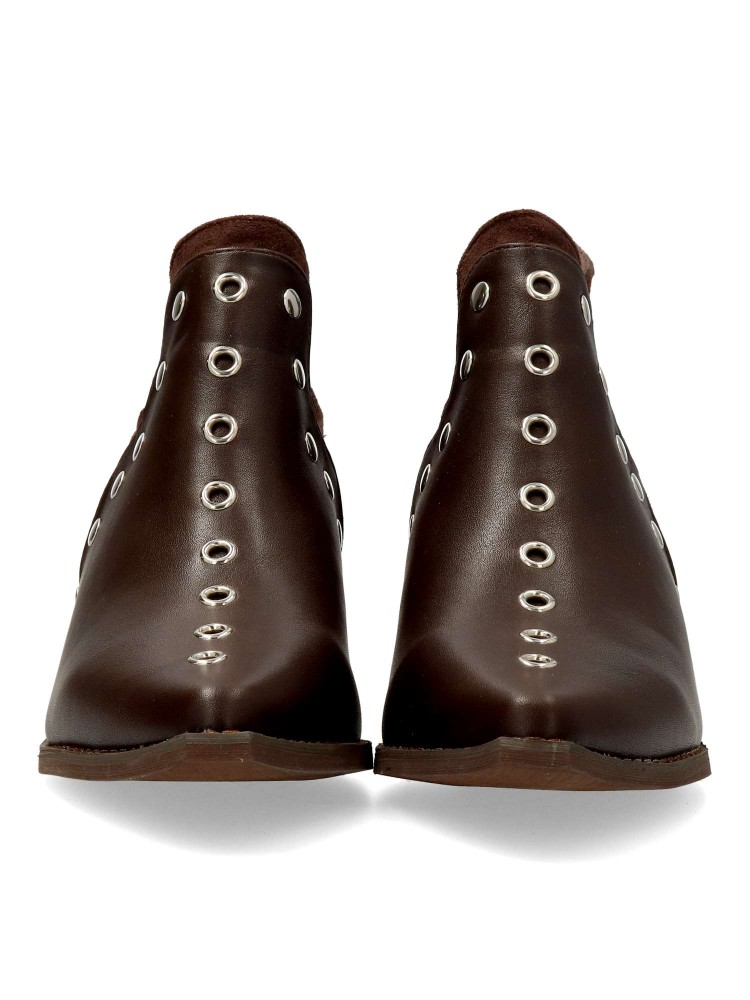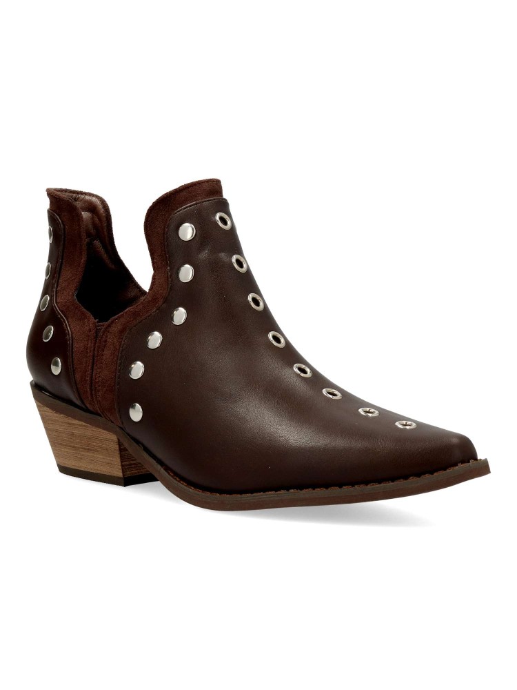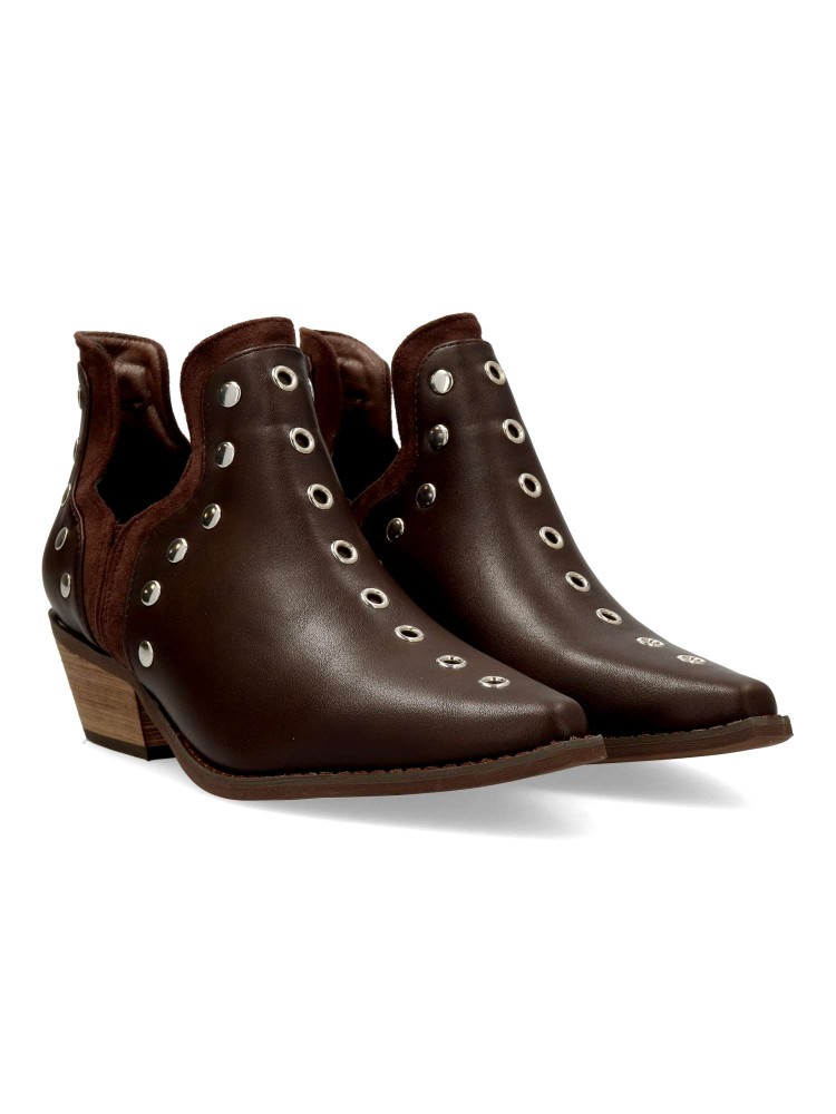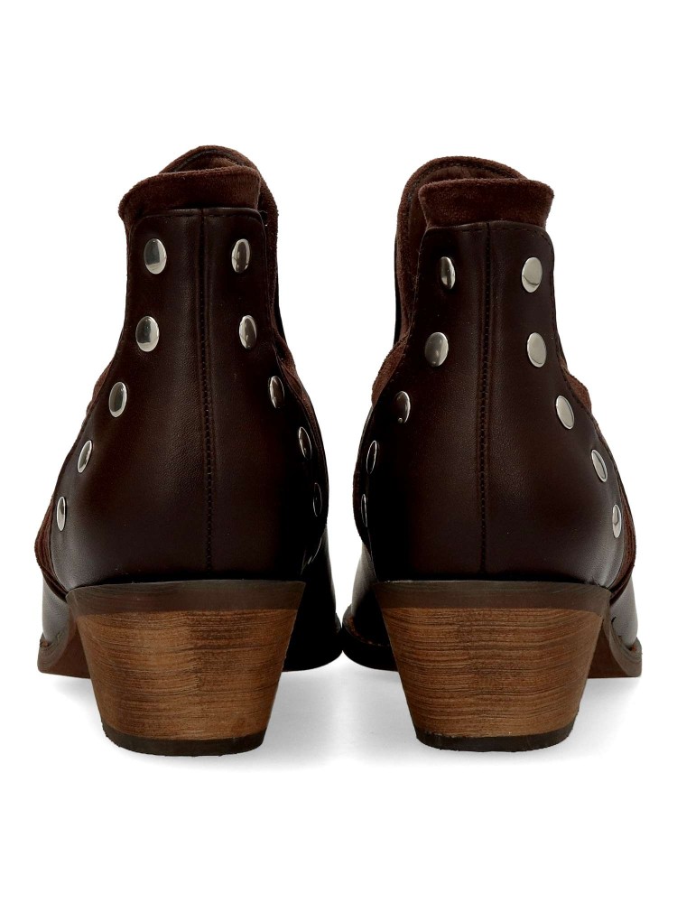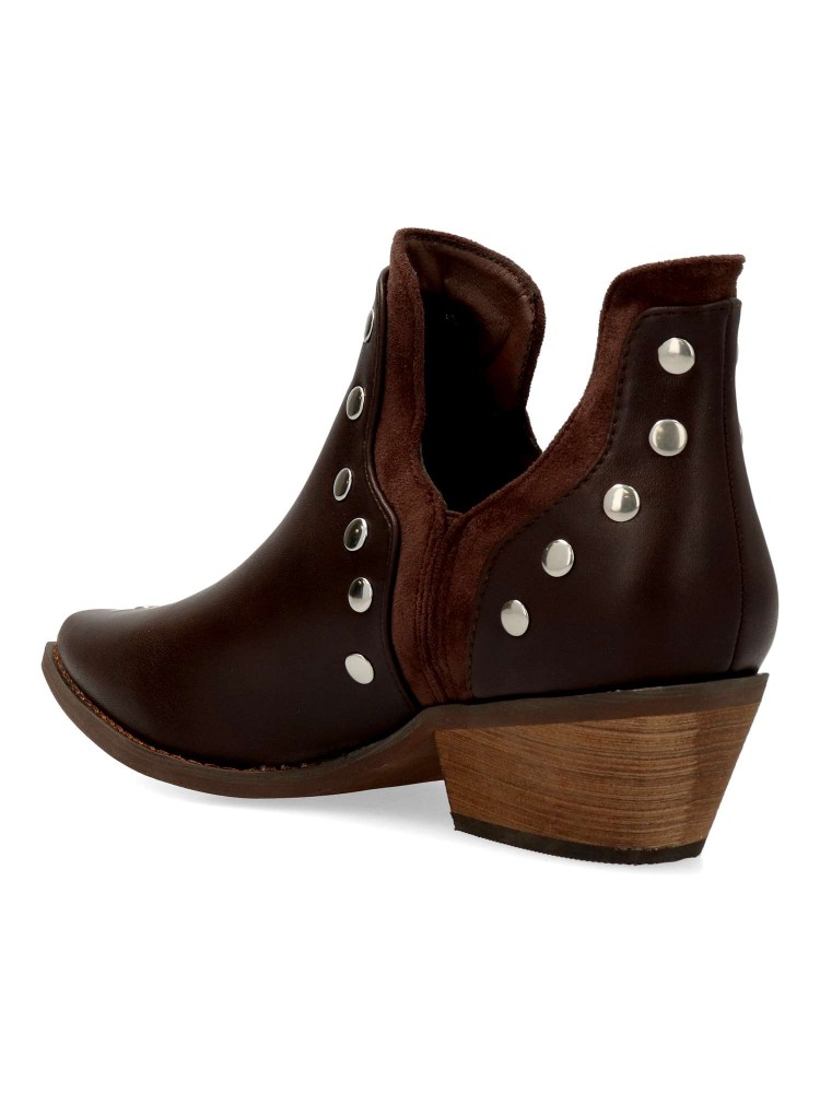 Botín bajo de mujer, estilo cowboy. Fabricado en piel sintética y suela de goma. Planta acolchada. Color marrón. Tacón de 4 cm. Caña de 10 cm. Diseño con aberturas laterales y tachas decorativas, que podrás lucir con todos tus outfits de temporada.