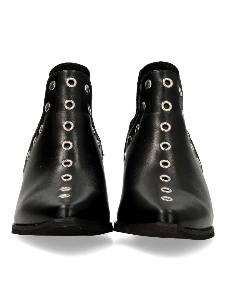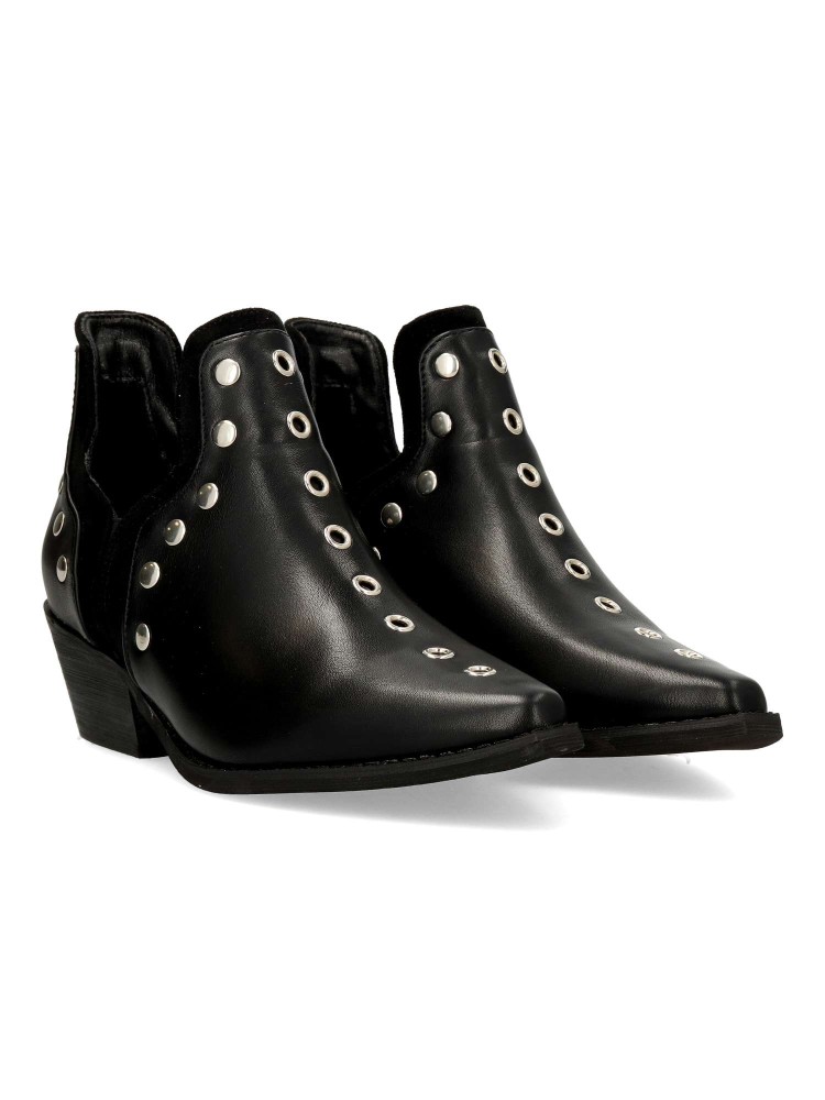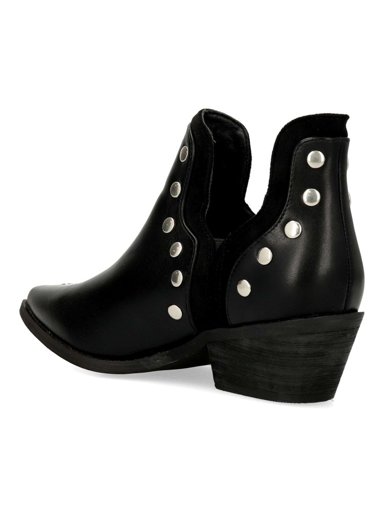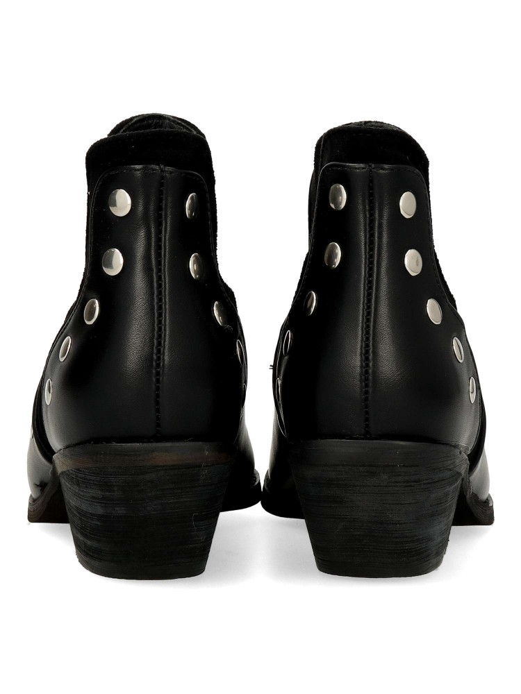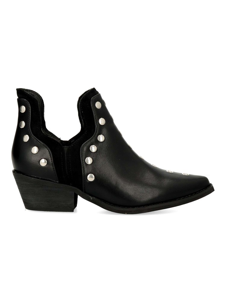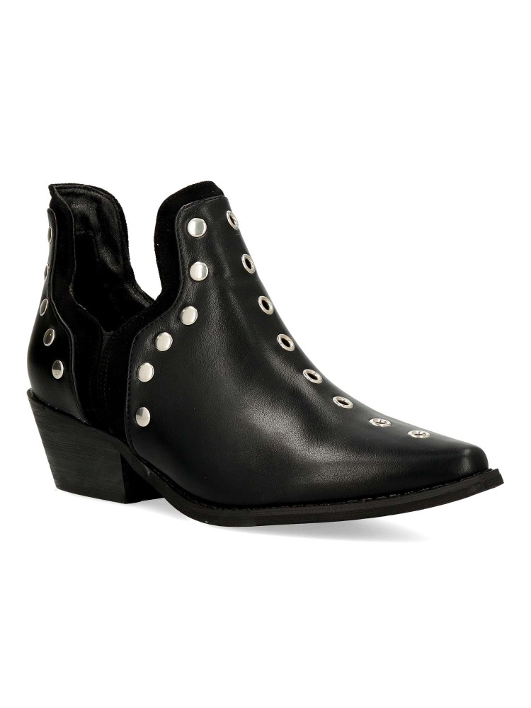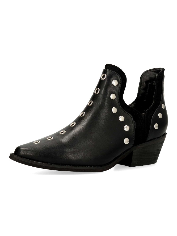 Botín bajo de mujer, estilo cowboy. Fabricado en piel sintética y suela de goma. Planta acolchada. Color negro. Tacón de 4 cm. Caña de 10 cm. Diseño con aberturas laterales y tachas decorativas, que podrás lucir con todos tus outfits de temporada.