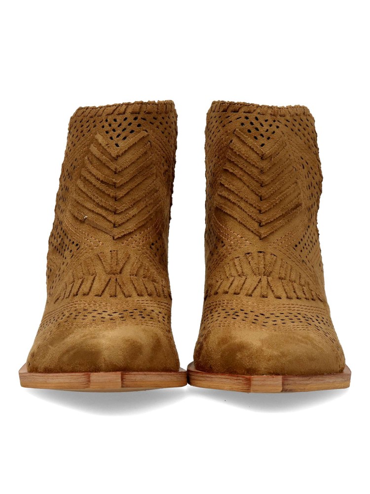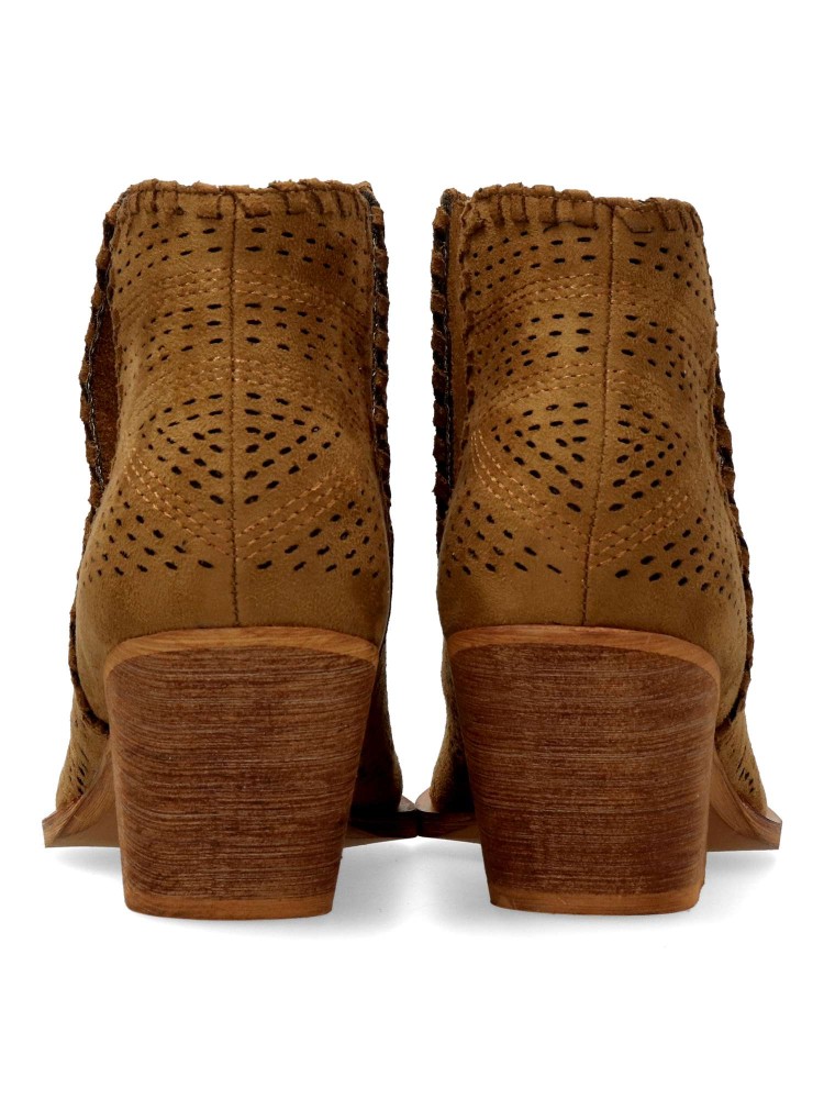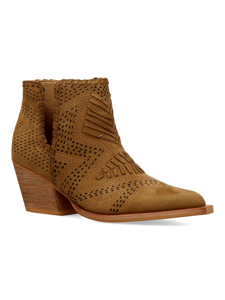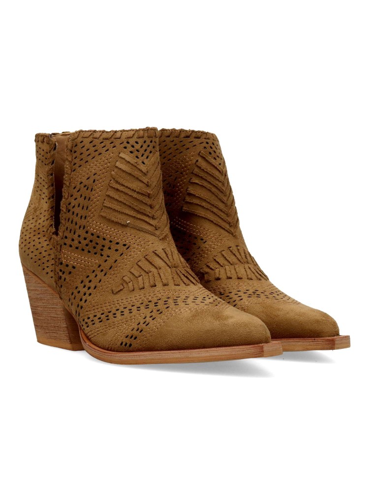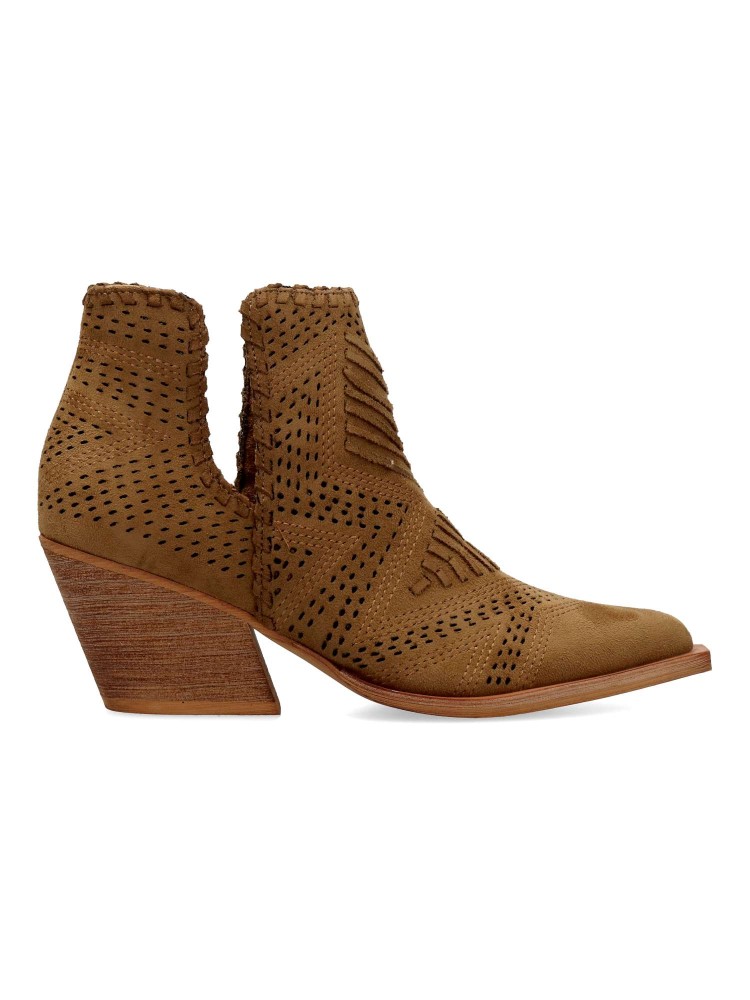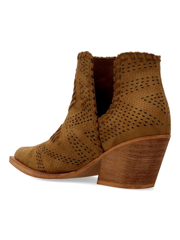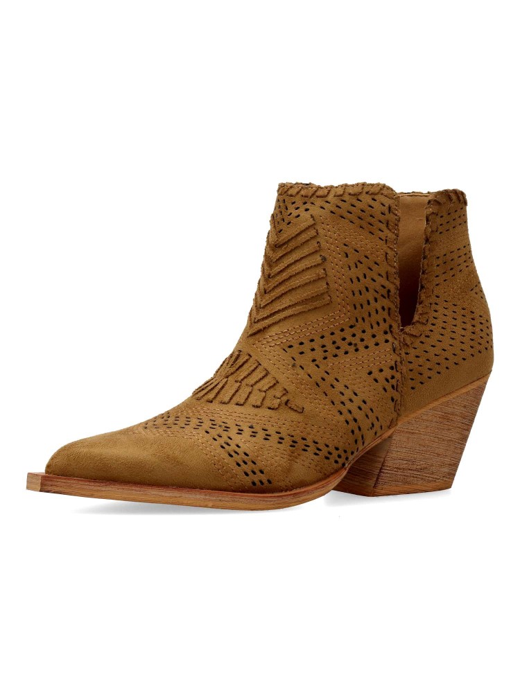 Botín de mujer abierto por los laterales. Botines cómodos, fabricados en piel sintética antelina aterciopelada, con suela de goma. Color camel. Tacón ancho de 6 cm. Original diseño troquelado, fácil de combinar con tus outfit de temporada.