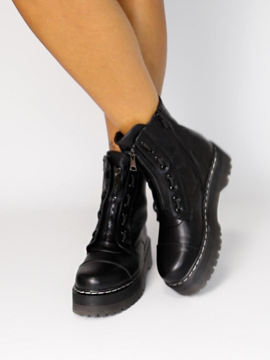 Bota militar de mujer, con cierre de cremallera al empeine y cordones. Modelo cómodo, robusto y funcional, fabricado en piel sintética, con suela de goma. Altura plataforma 5 cm. Altura caña 15 cm. Color negro. Ideal para combinar con un look trendy.