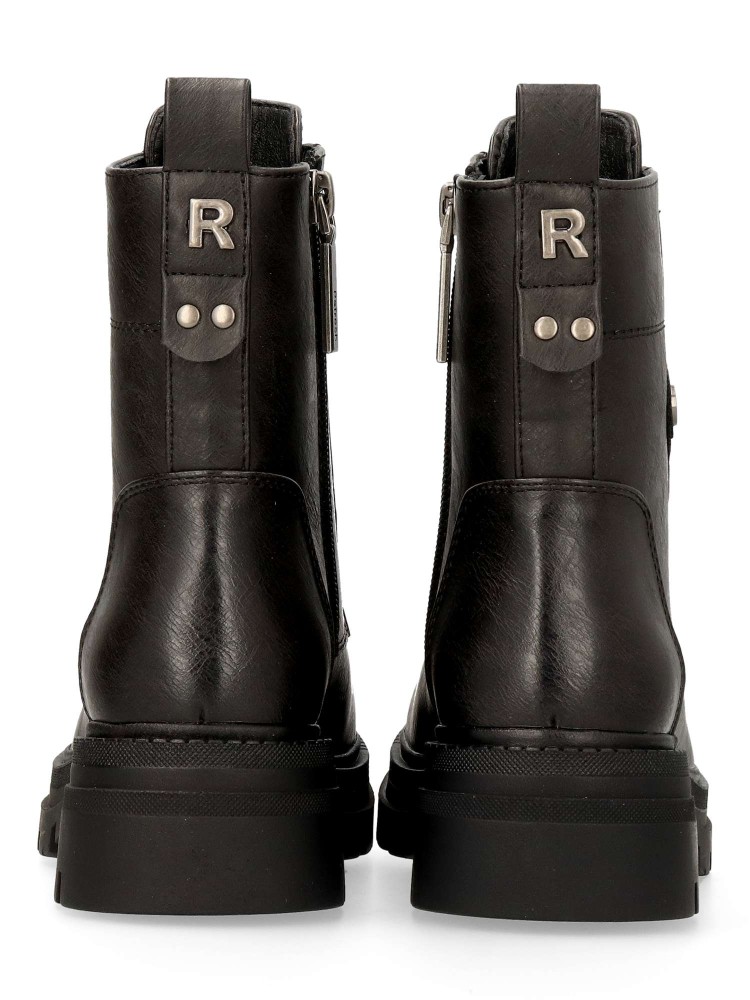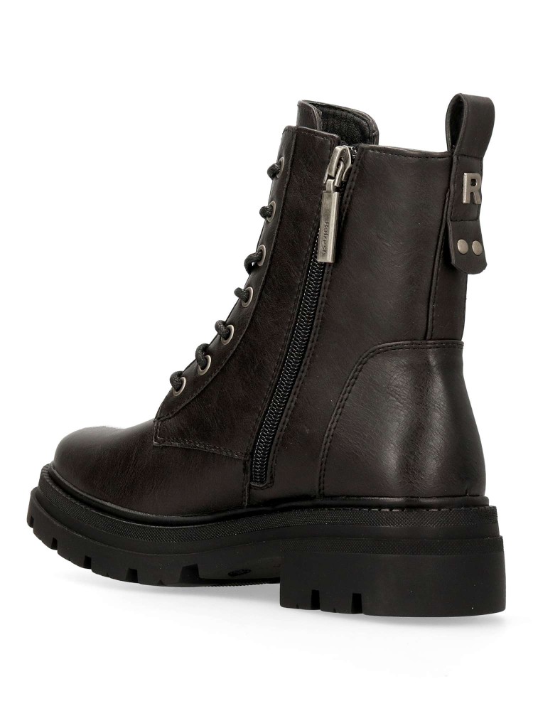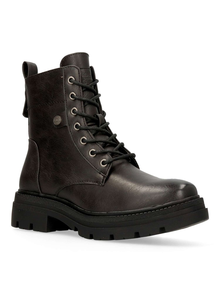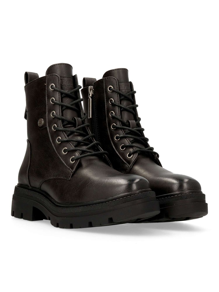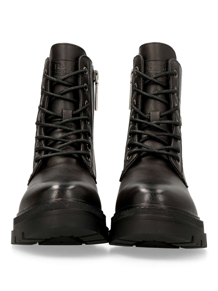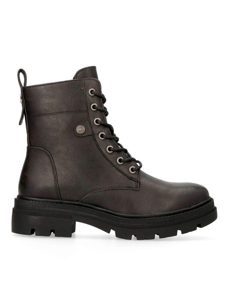 Botín de mujer, con diseño militar. Fabricado en material que imita a la piel. Cierre mediante cremallera con cordones tubulares al tono. Color negro. Todo un clásico para conjuntar con tus outfits de invierno. Plantilla acolchada. Certificado vegano.