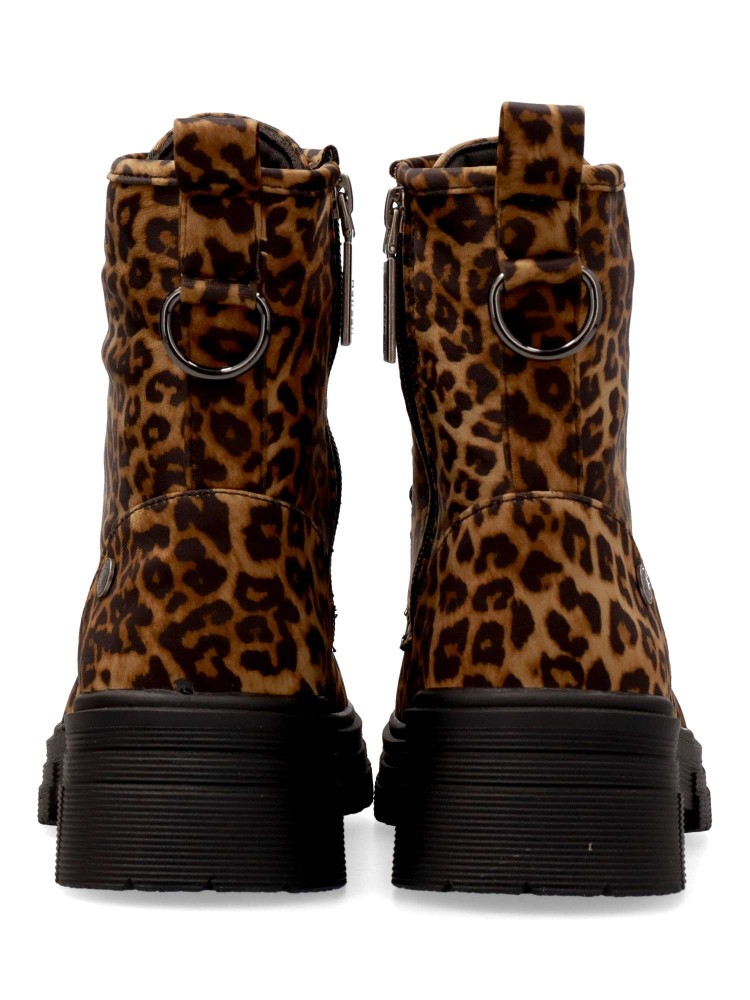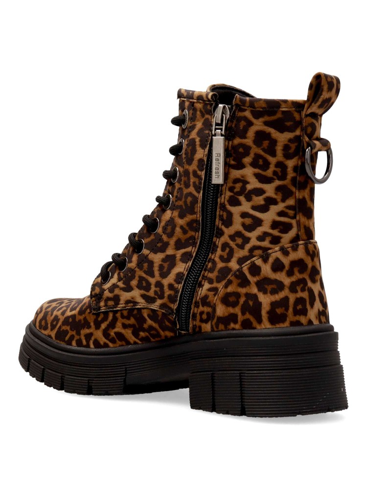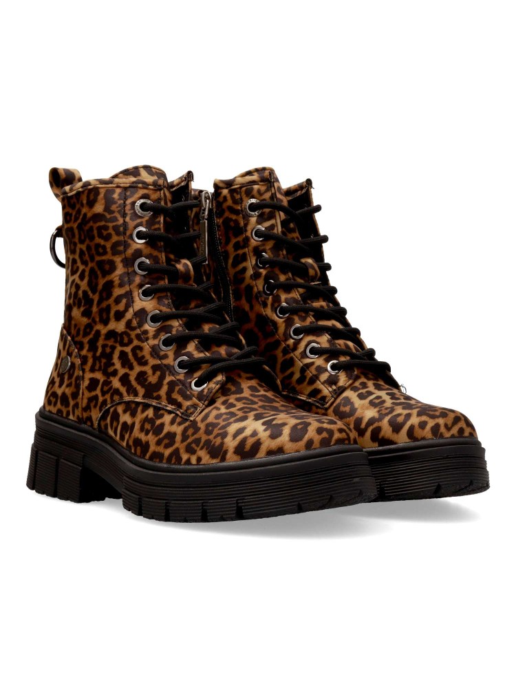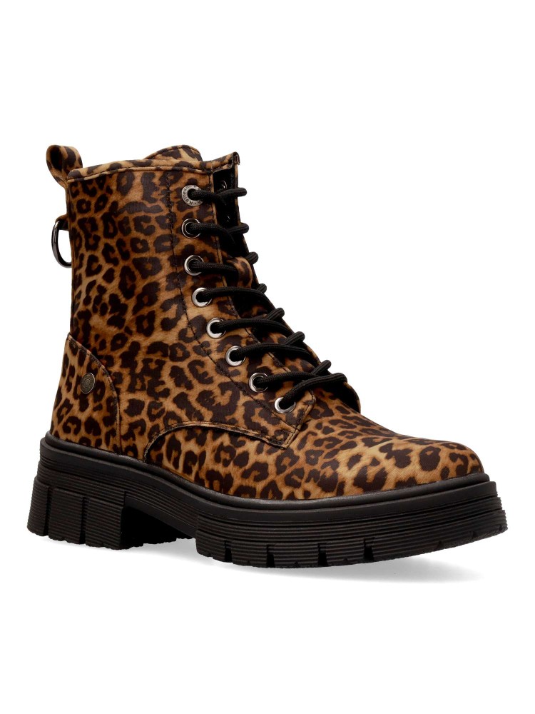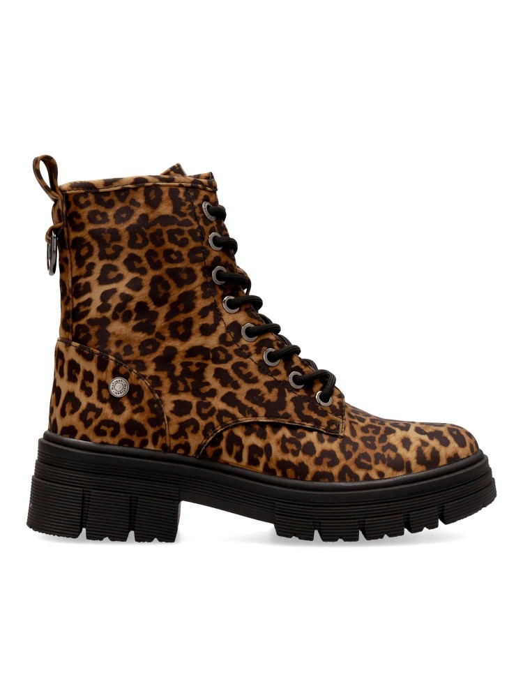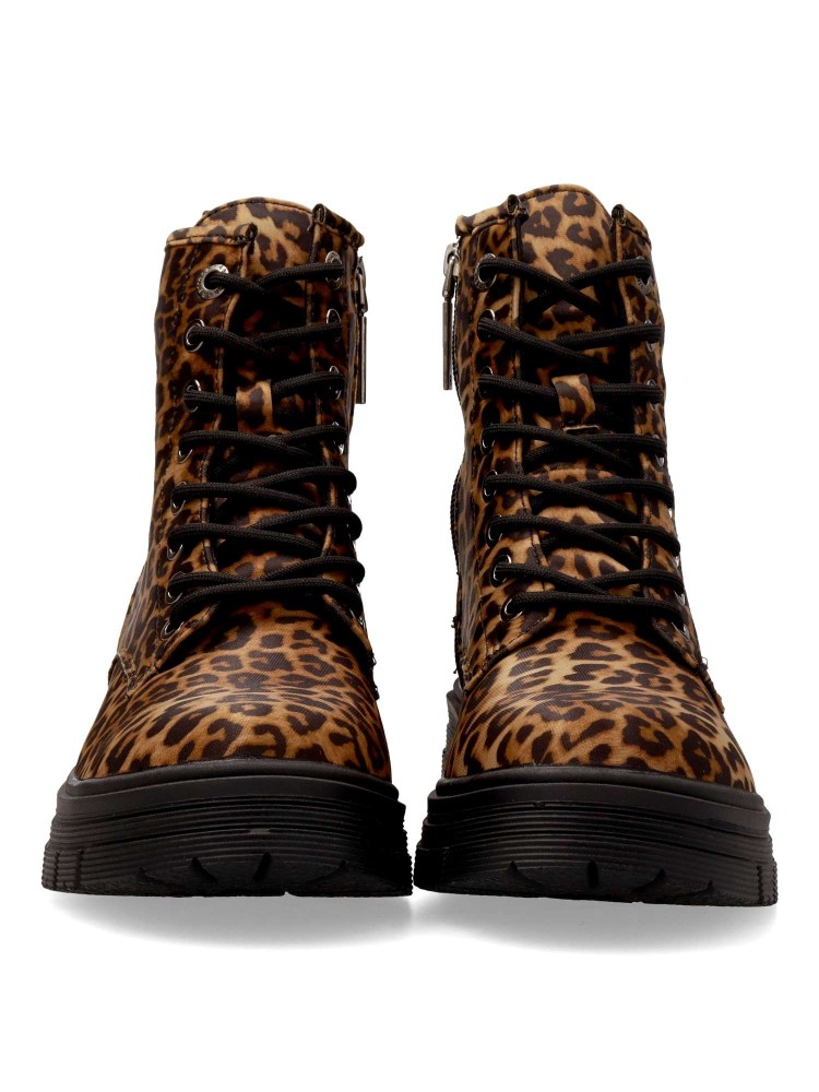 Botines de mujer estilo militar. Cierre de cremallera lateral y cordones. Fabricado en tejido suave estampado leopardo. Suela volumen de goma. Plantilla acolchada y extraíble. Botín original y cómodo, ideal con tus outfits de invierno. Certificado vegano.