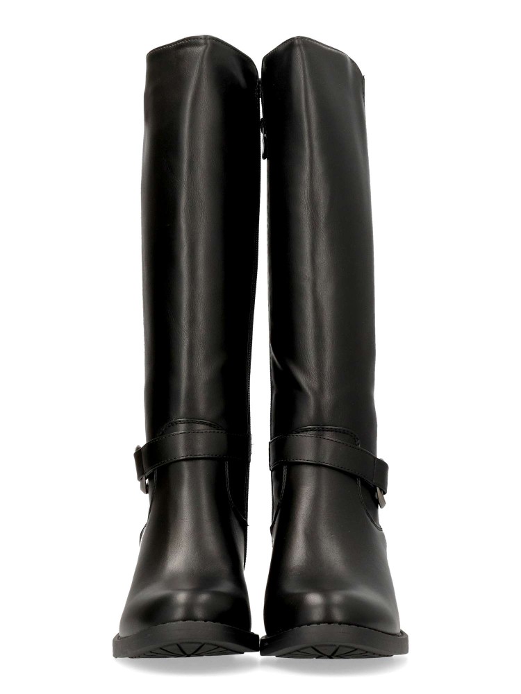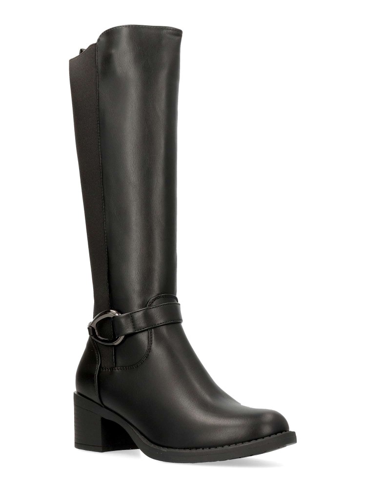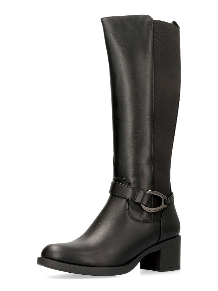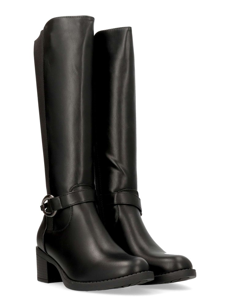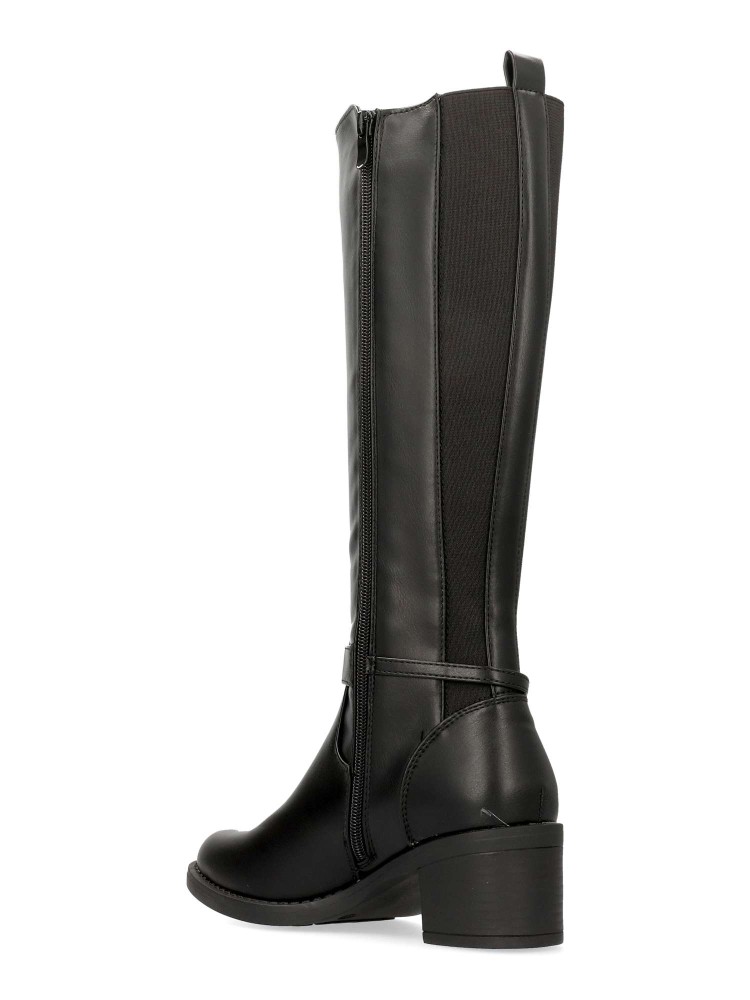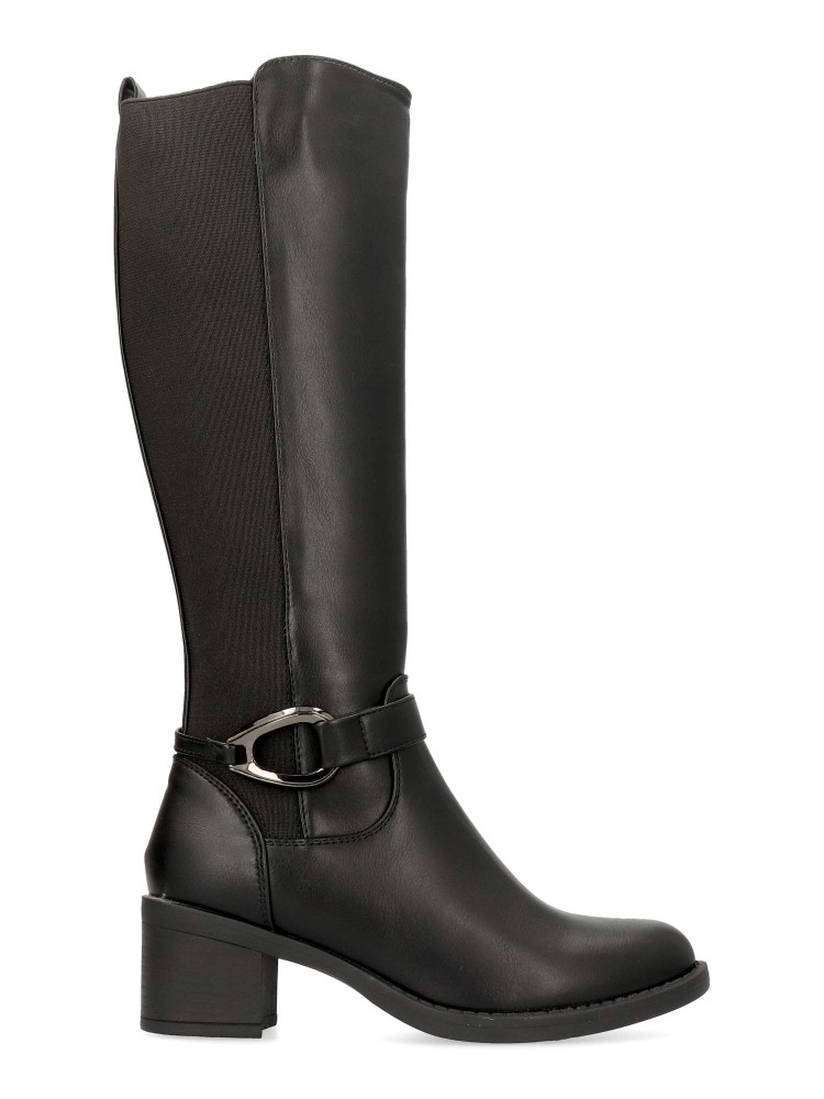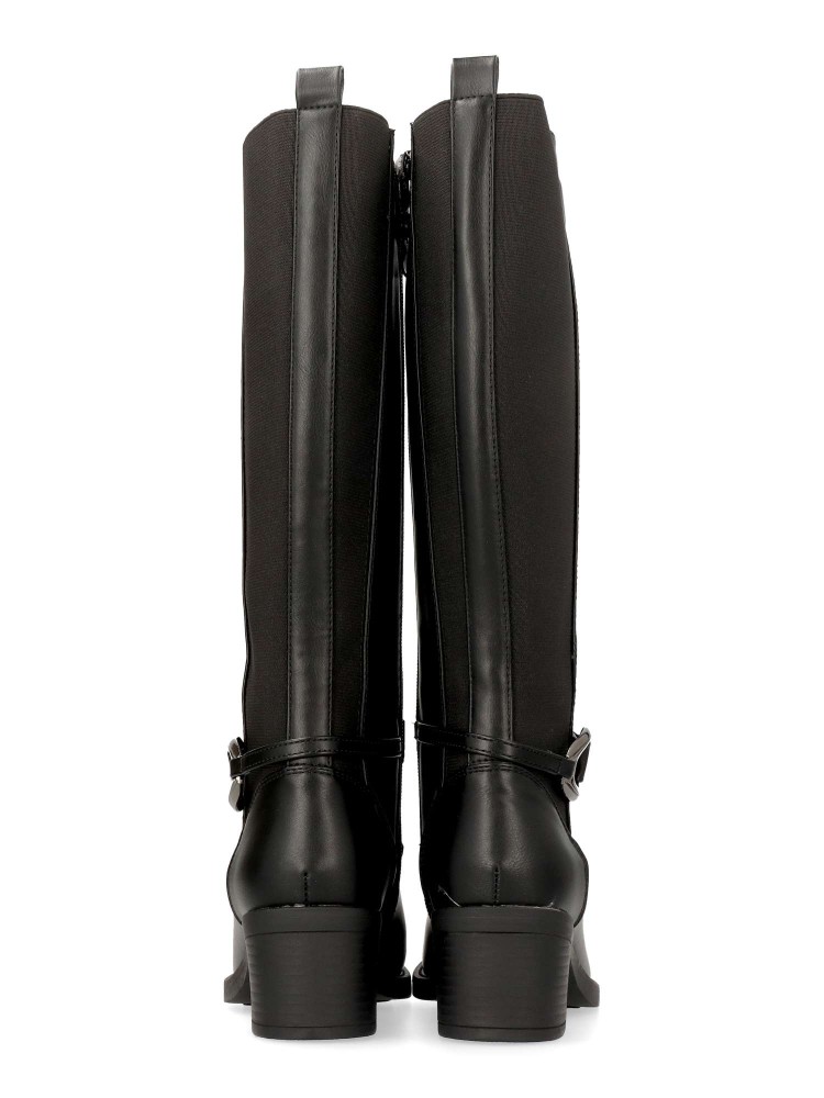Bota alta de mujer, con cierre de cremallera lateral y elástico en la caña. Fabricado en piel sintética. Tacón de 5 cm. de altura. Caña de 34 cm. Color negro. Amarpies, ligeros, súper flexibles, ajustables, de diseño, a la moda y perfectos con tus outfits