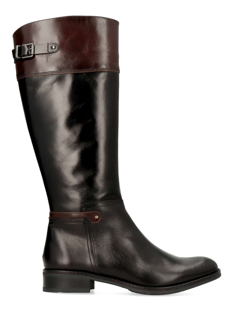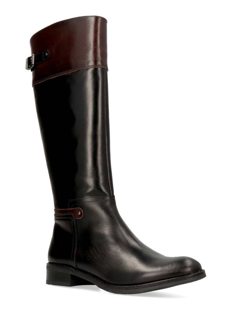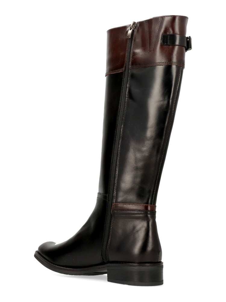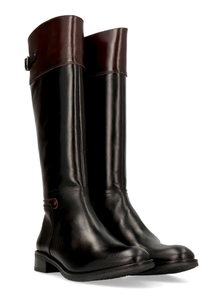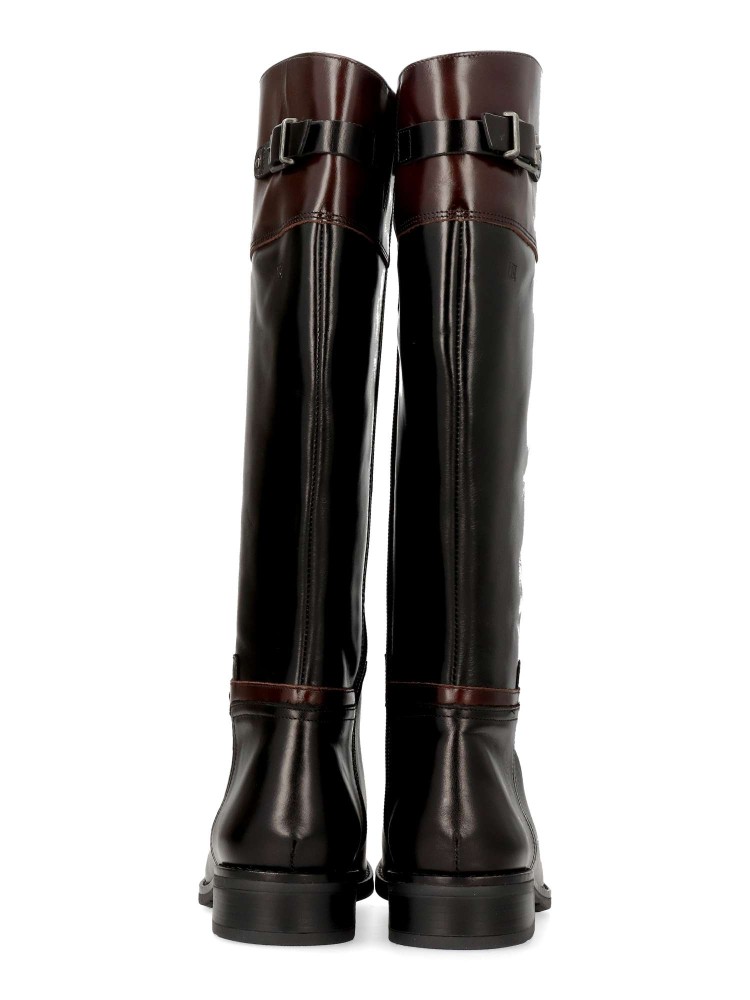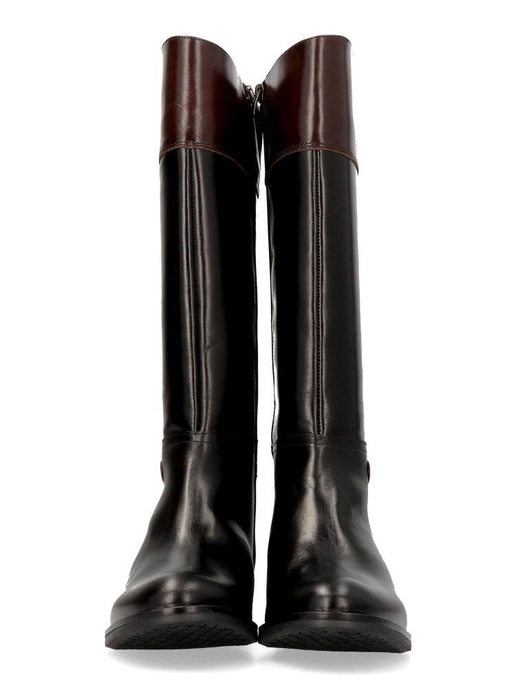 Bota de mujer, fabricada en piel de primera calidad, con suela de goma. Cierre de cremallera lateral. Color negro-cafe. Tacón ancho de 3 cm. Caña de 36 cm. Tierra te brinda el equilibrio perfecto entre elegancia y practicidad. Pieza clave de tu zapatero.