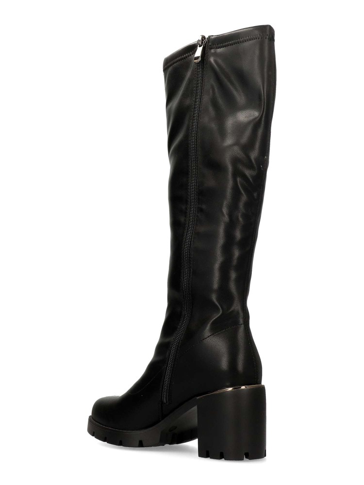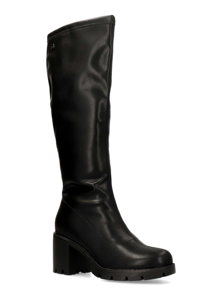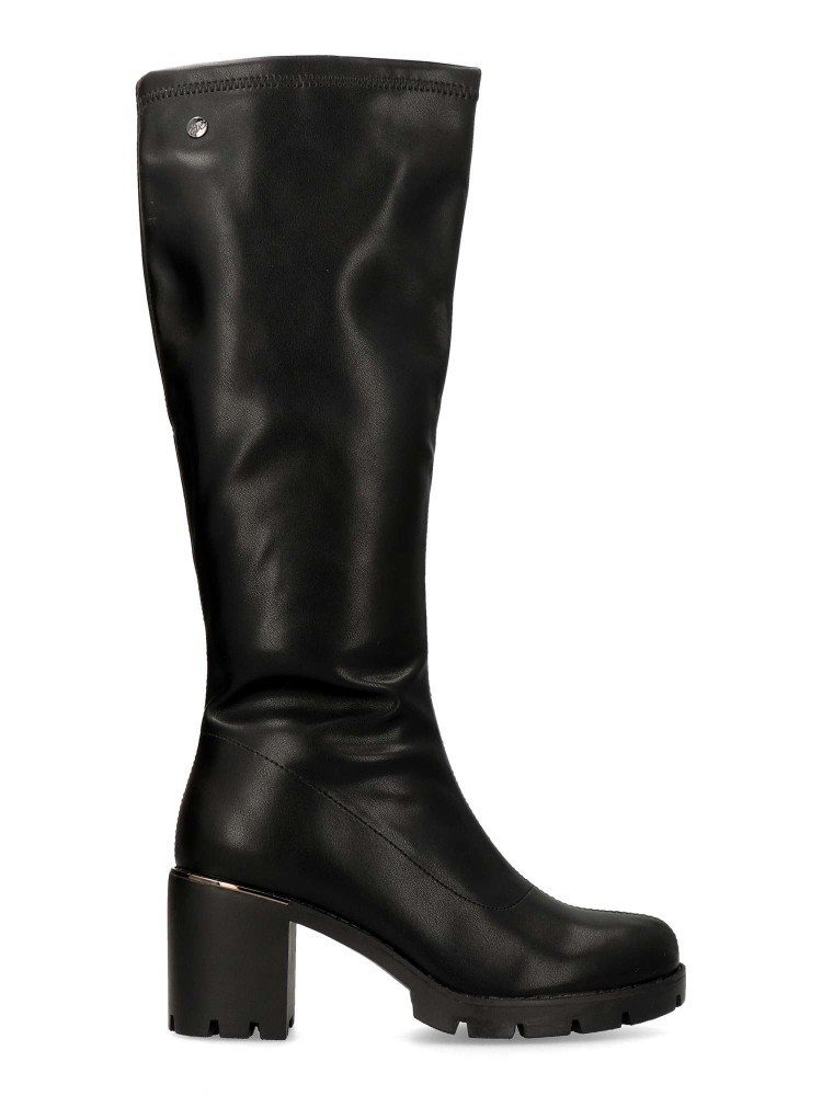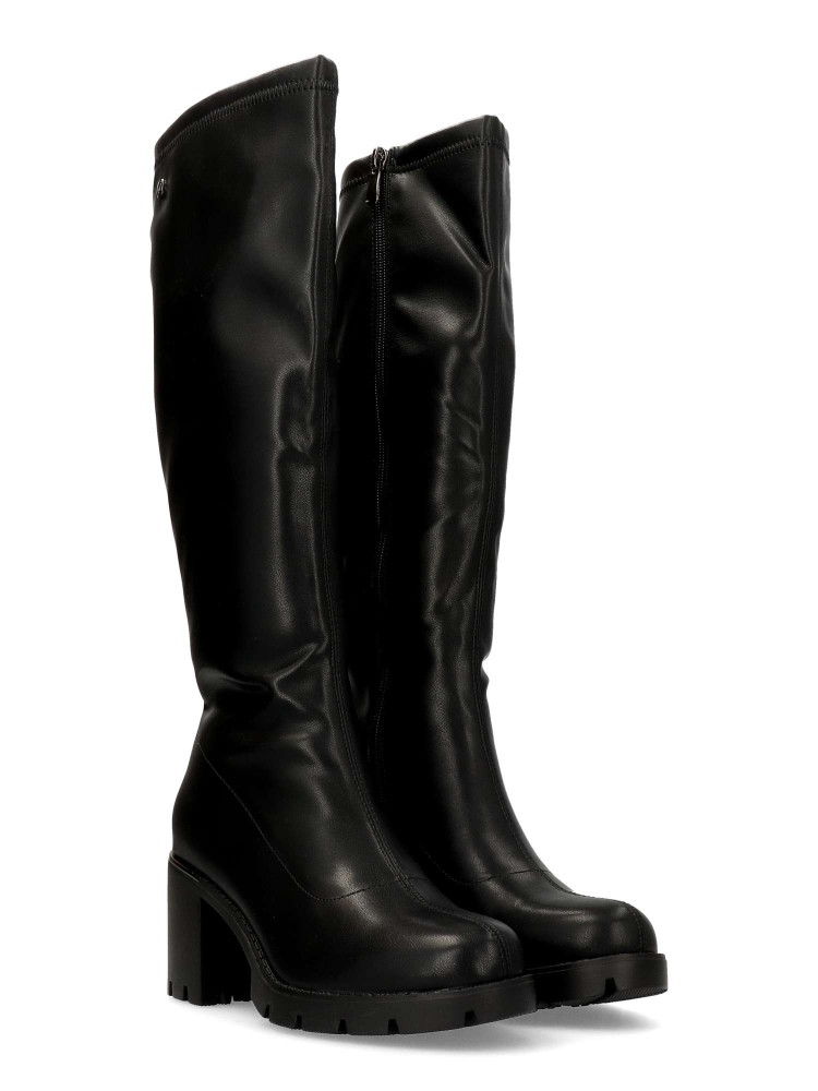 Bota de mujer con cierre de cremallera lateral. Bota cómoda, fabricada en piel sintética elástica. Color negro. Tacón de 6,5 cm. Caña de 38 cm. Colección con mucha personalidad para combinarlos con cualquier outfit. 100% vegano.