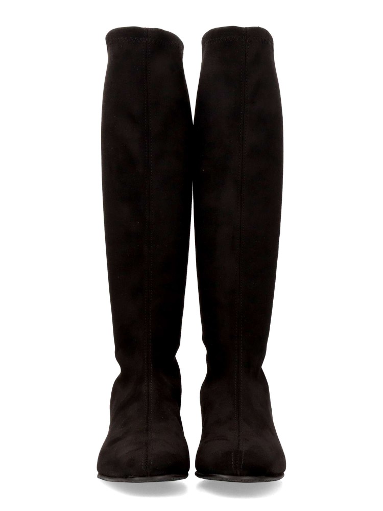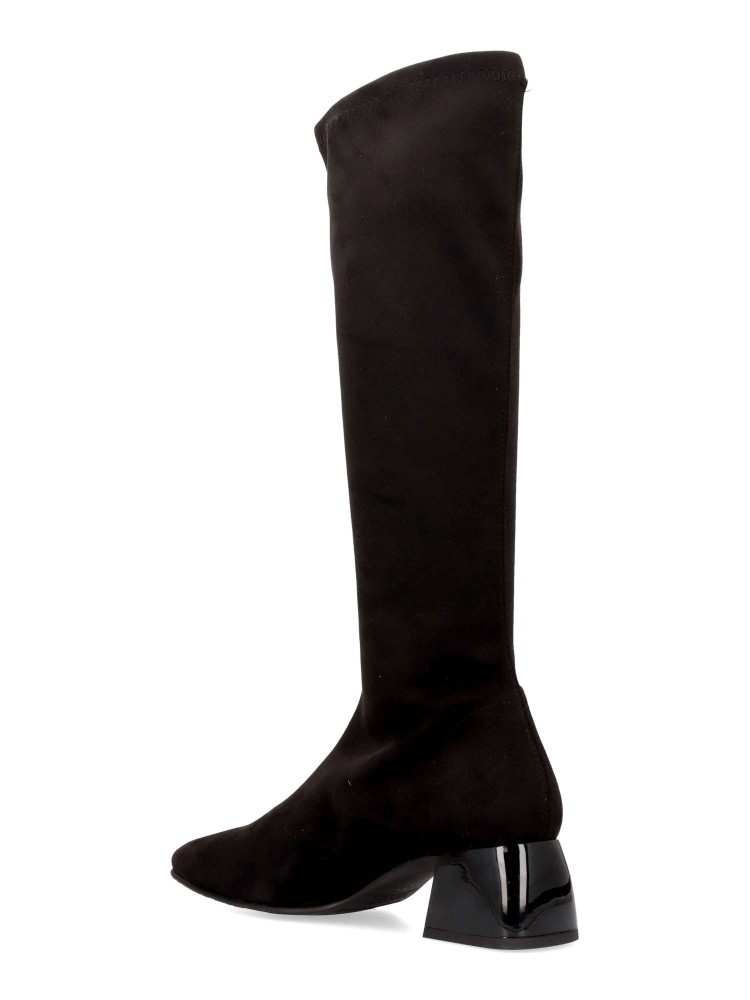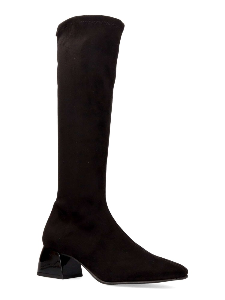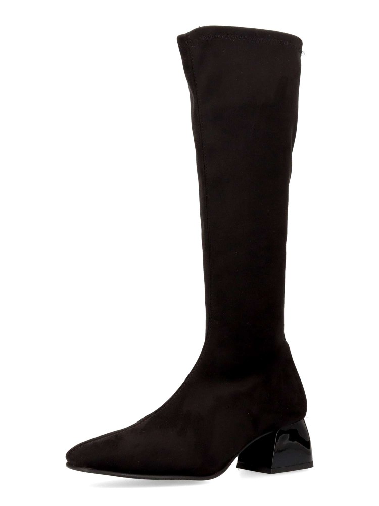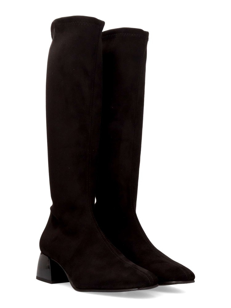 Bota alta de mujer fabricada en tejido ECO-elástico. Color negro. Tacón trapezoidal de 5 cm. Caña de 38 cm. Bota de estilo minimalista, elegante y funcional, perfecto para mujeres que buscan comodidad sin renunciar a un diseño moderno. 100% vegano.