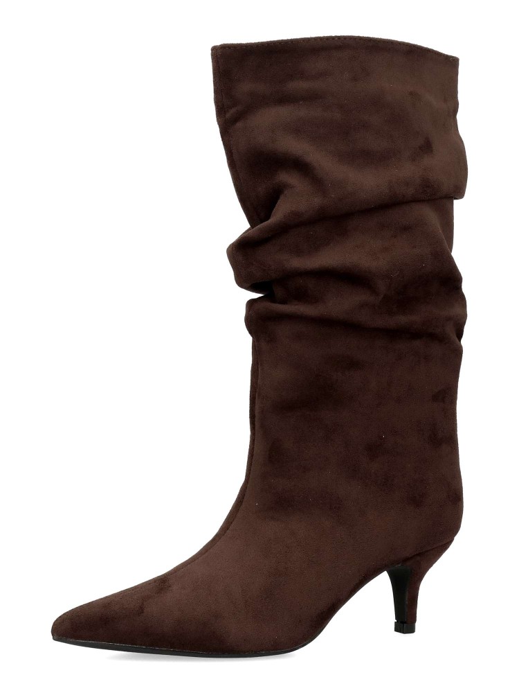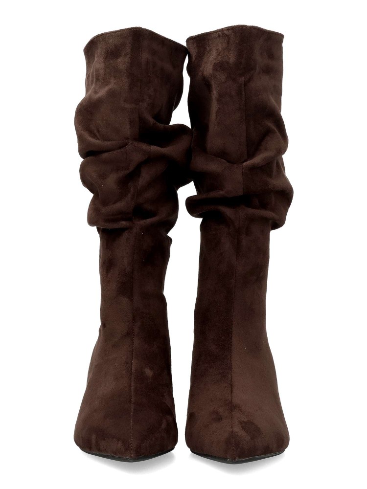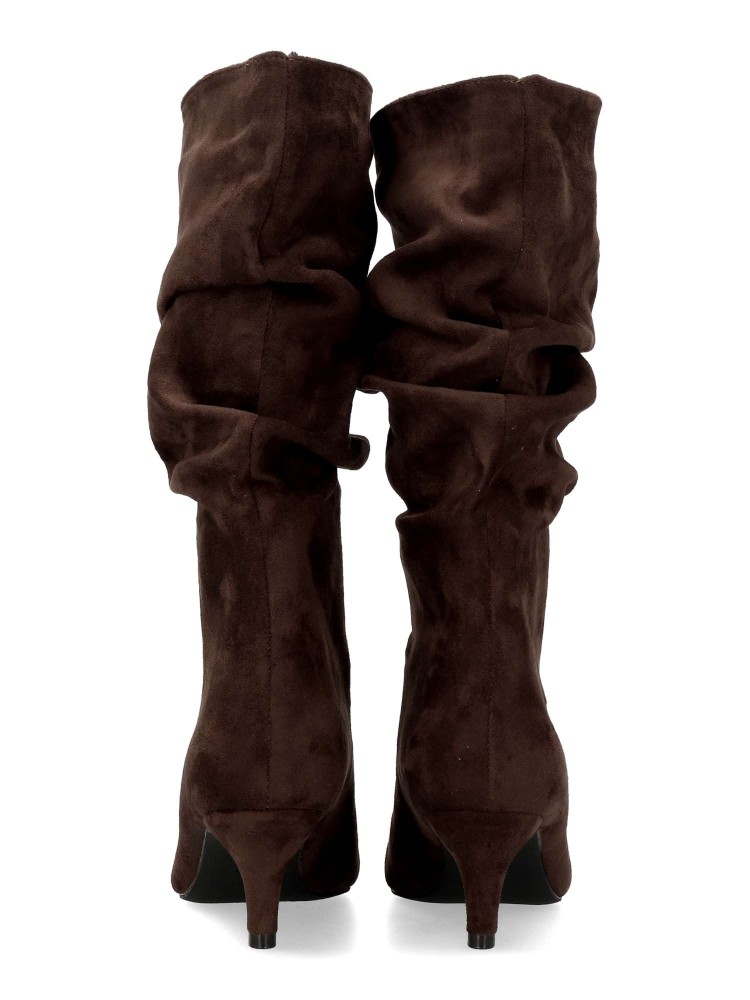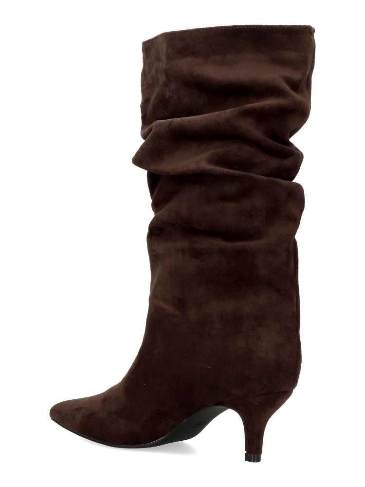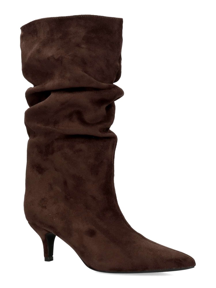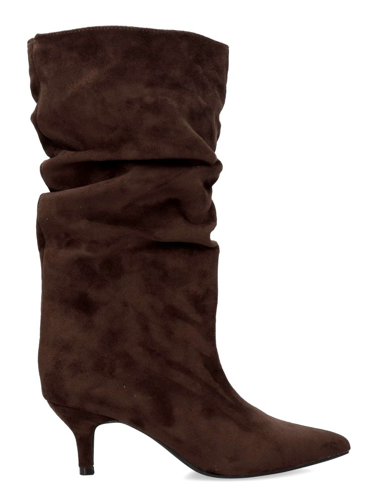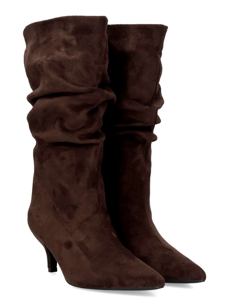 Bota cómoda de mujer fabricada en textil antelina. Suela de goma. Modelo con puntera y tacón fino de 5,4 cm. Detalle de caña arrugada de 29 cm. Color marrón oscuro. Diseño elegante y versátil, ideal para combinar con tus outfits de invierno.