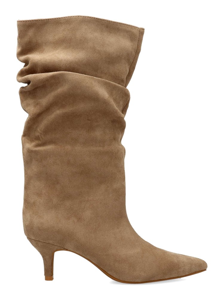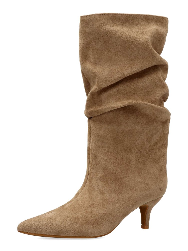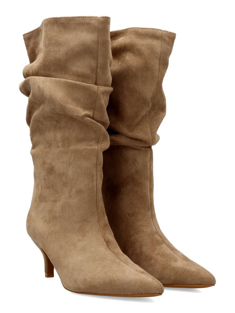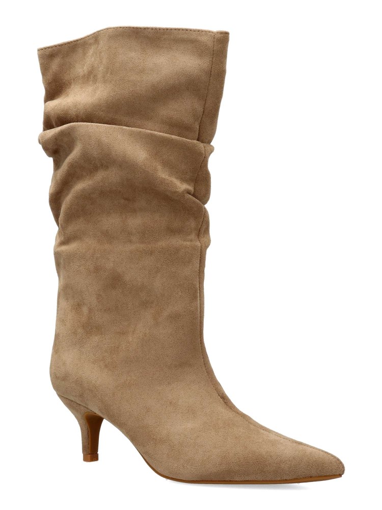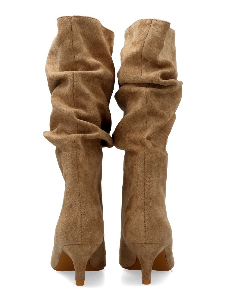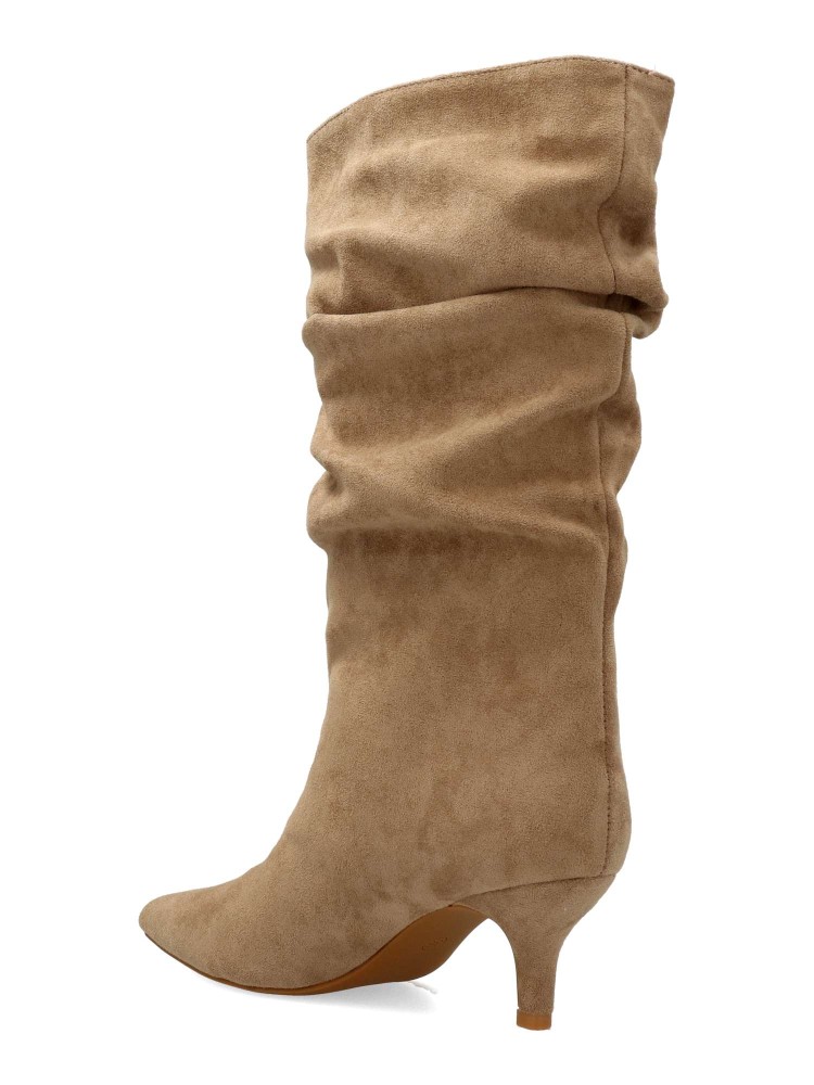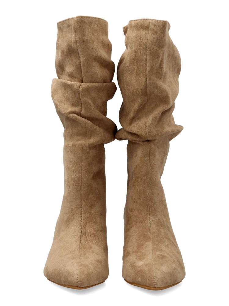 Bota cómoda de mujer fabricada en textil antelina. Suela de goma. Modelo con puntera y tacón fino de 5,4 cm. Detalle de caña arrugada de 29 cm. Color beige. Diseño elegante y versátil, ideal para combinar con tus outfits de invierno.
